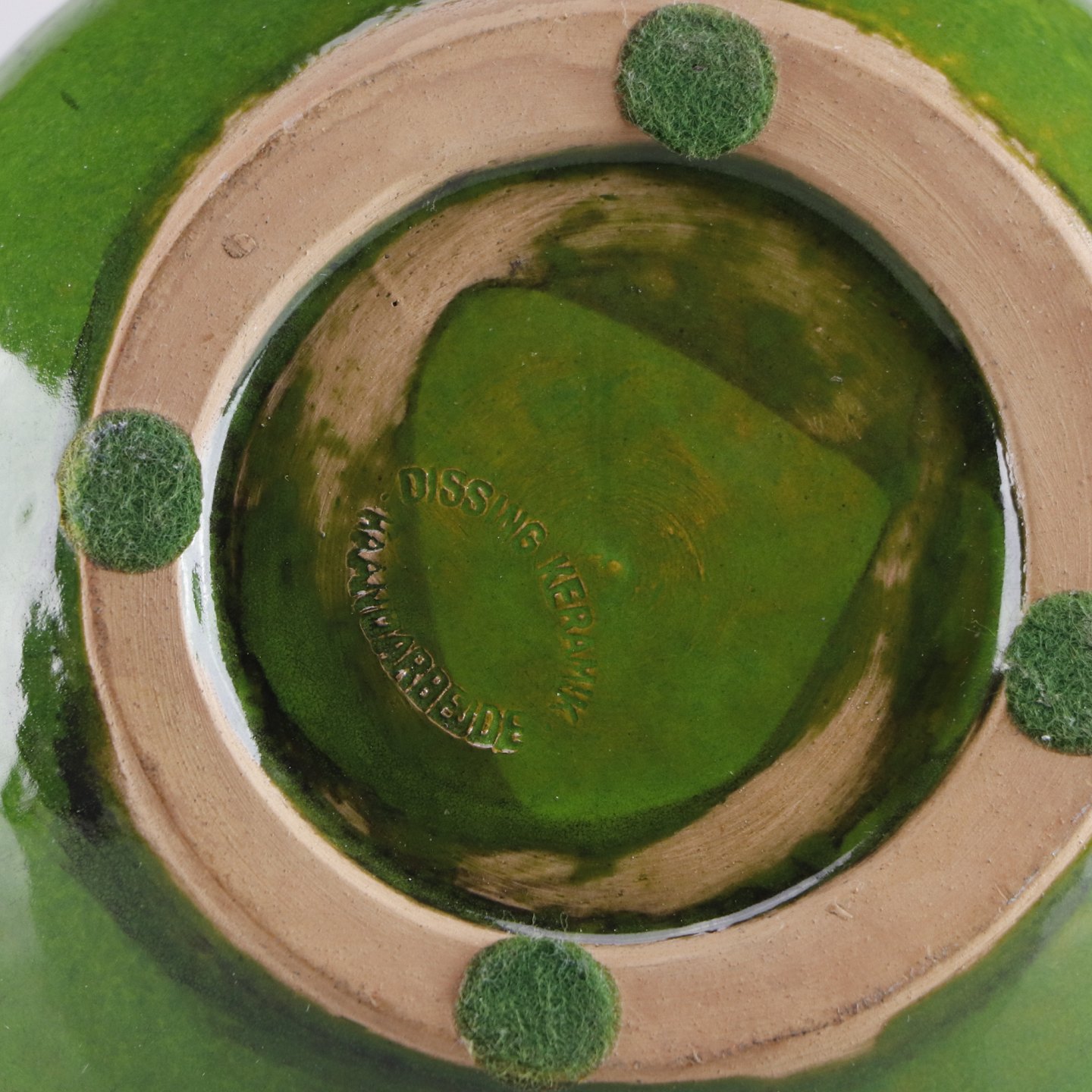Keramik kande i grøn, dekoreret med riller, hank og lille hældetud