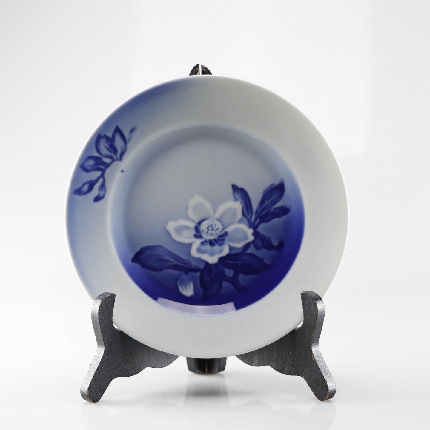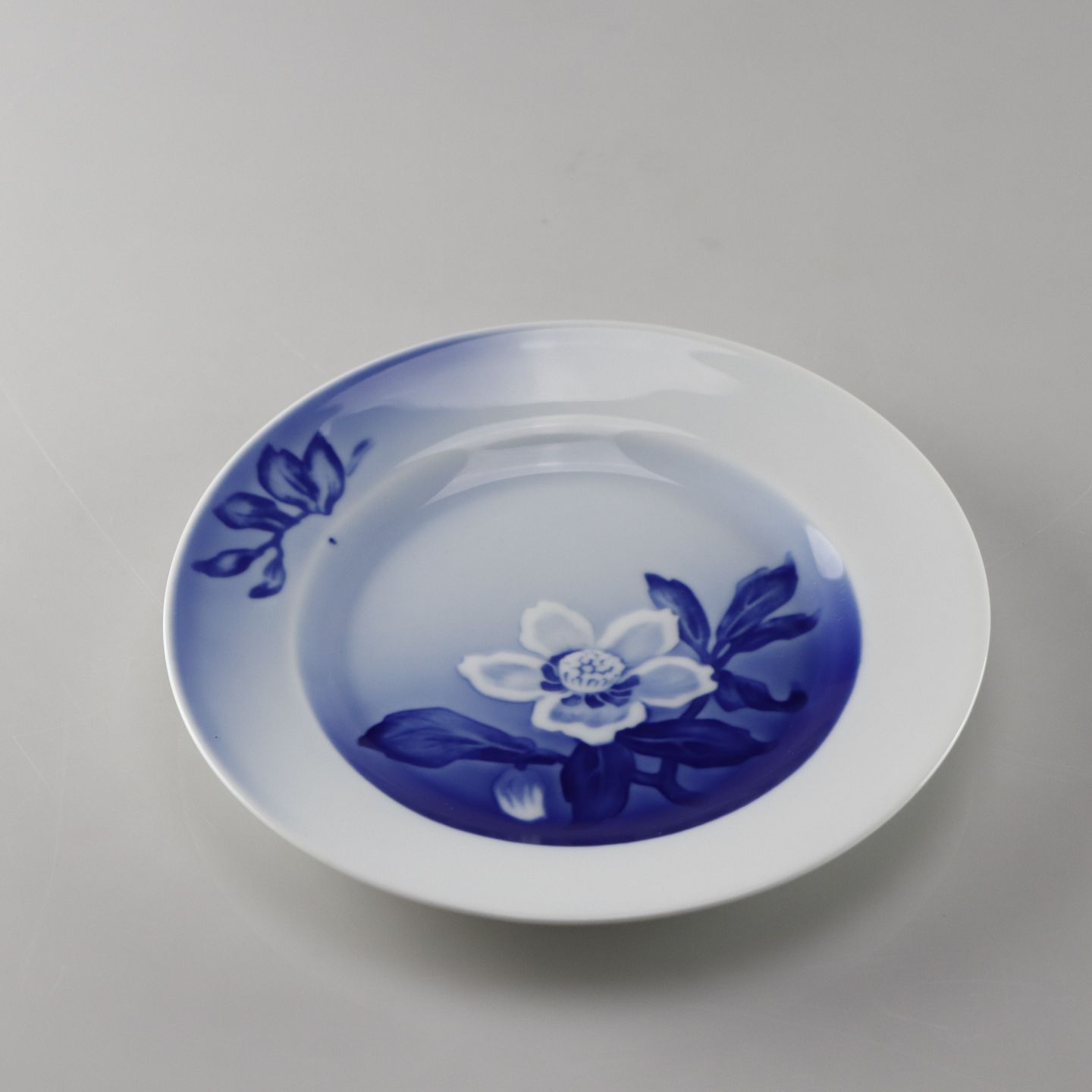 Hvid tallerken med blå farver og et motiv af en julerose