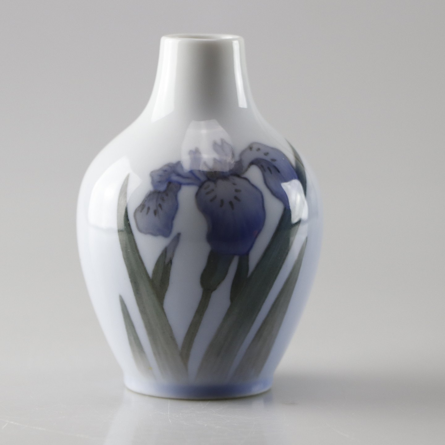 Vase i porcelæn i hvid med blå iris blomst og grønne blade
