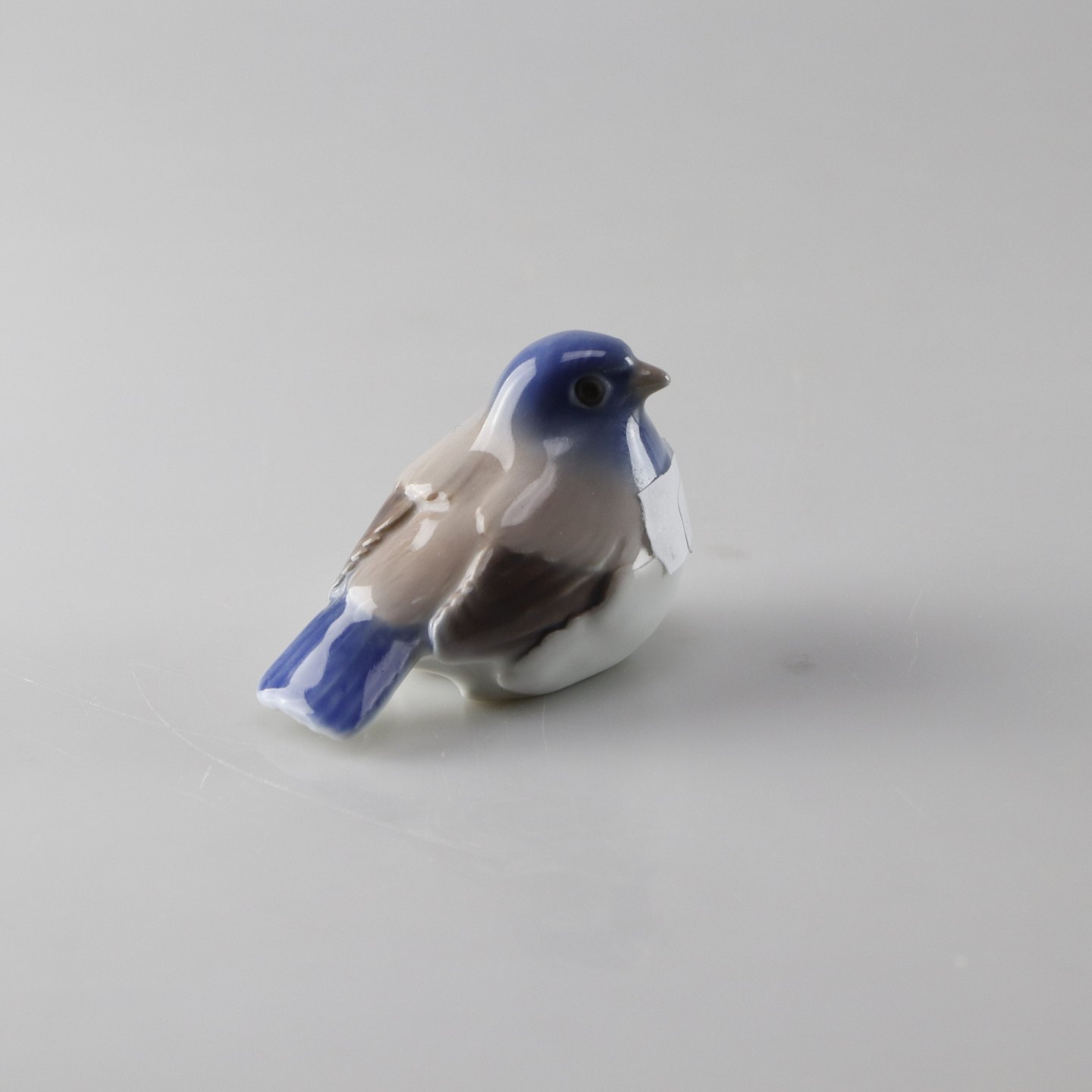 Figur i porcelæn med blå, brune og hvide farver