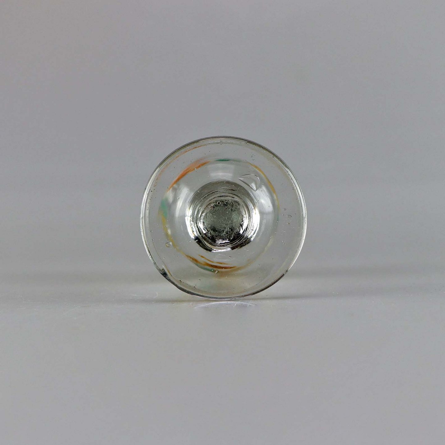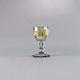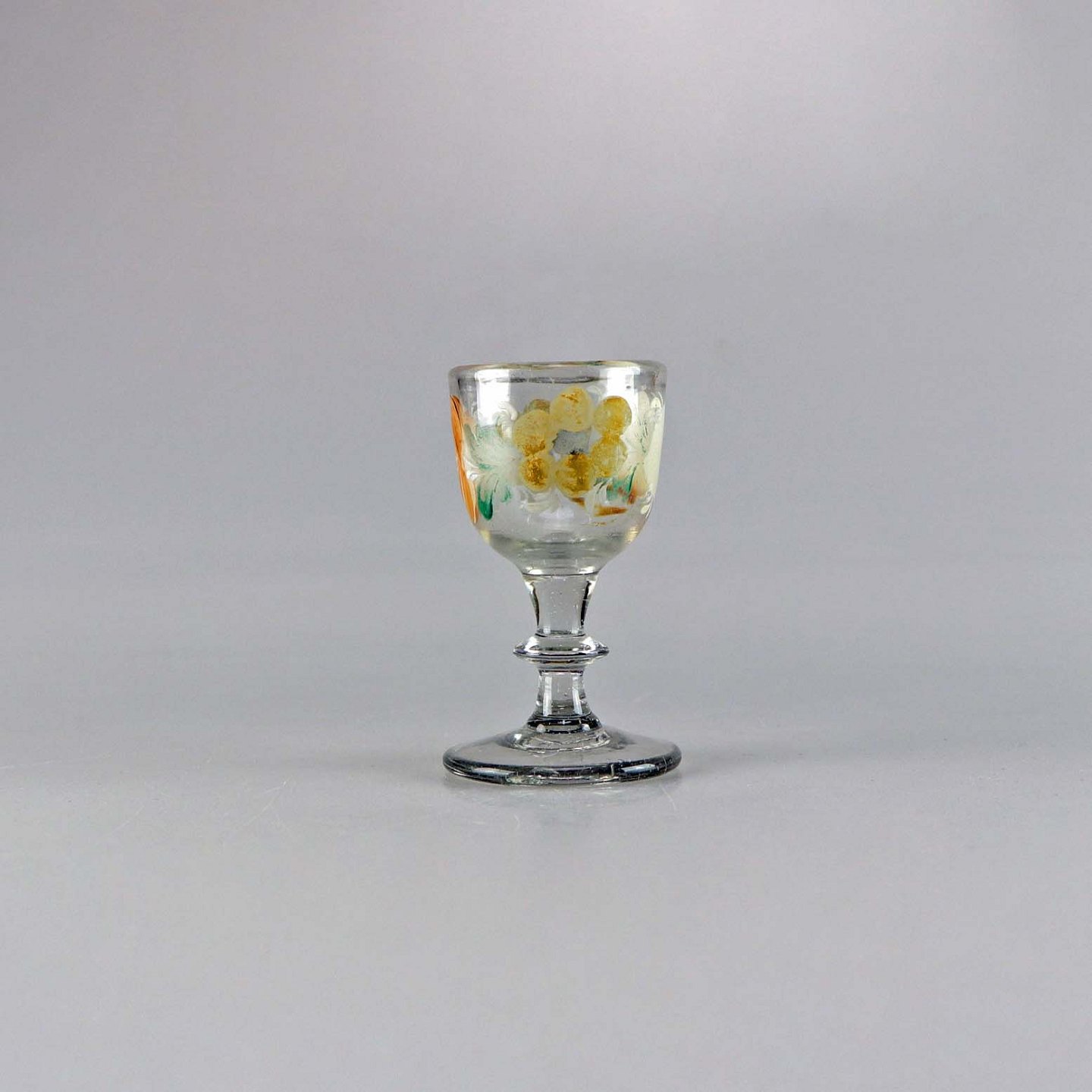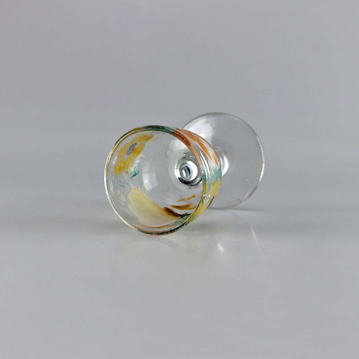 Portvinsglas eller snapseglas med håndmalet blomstermotiv, der er slid på blomstermalingen