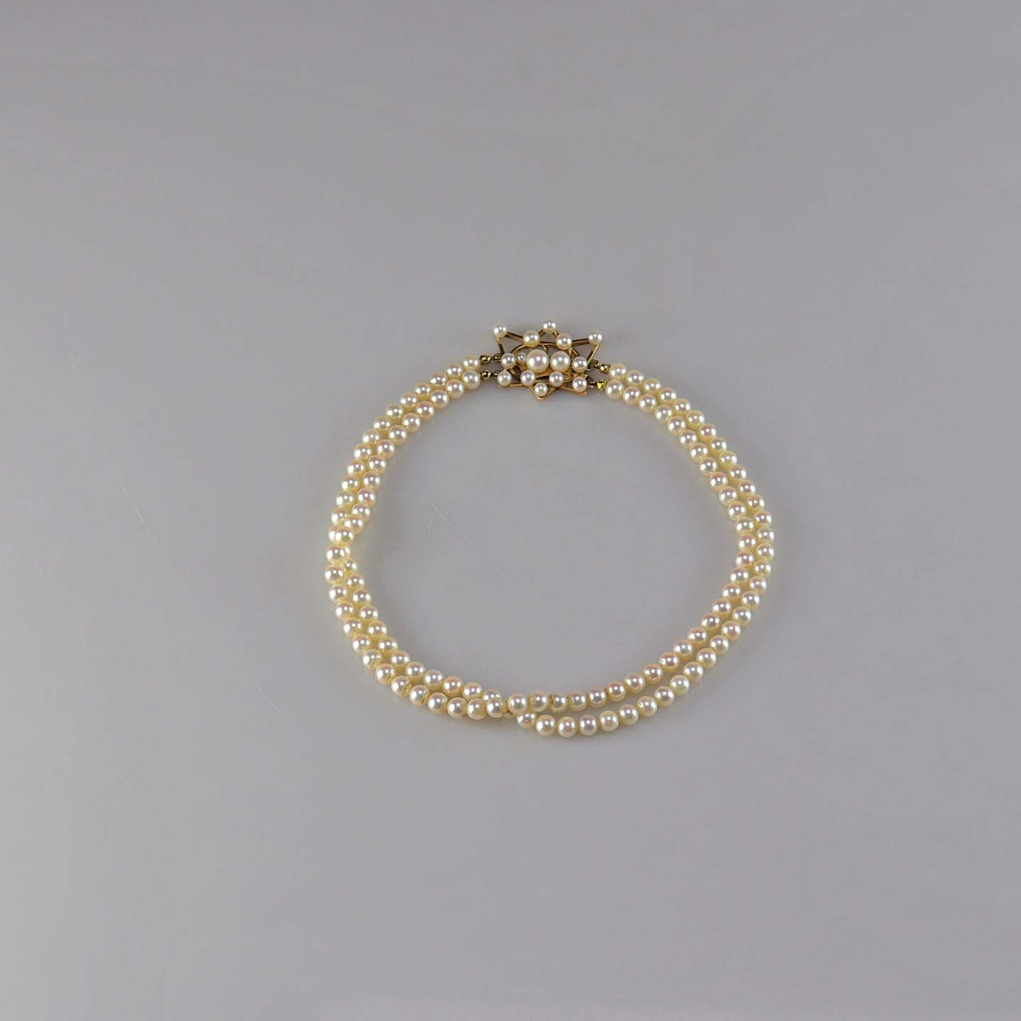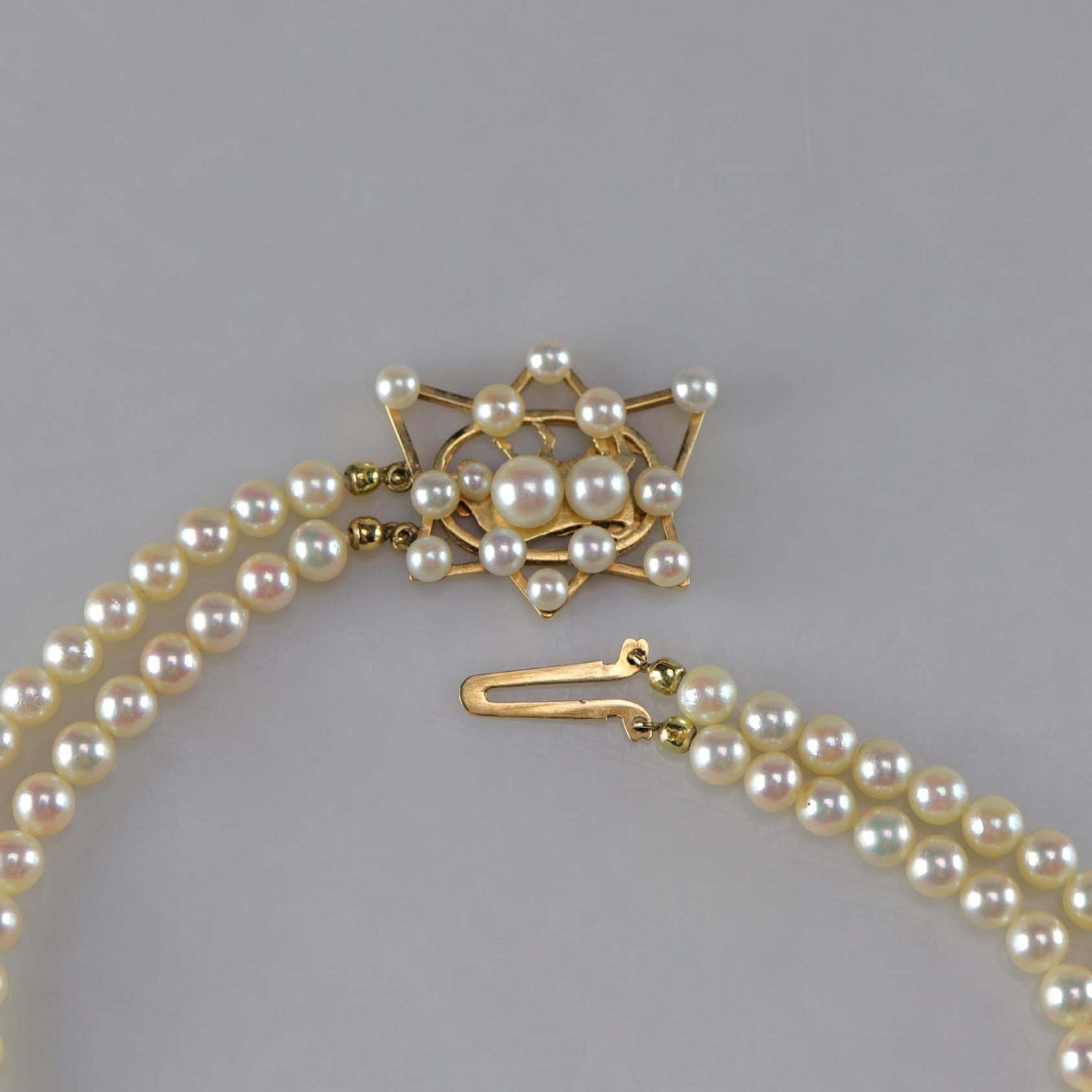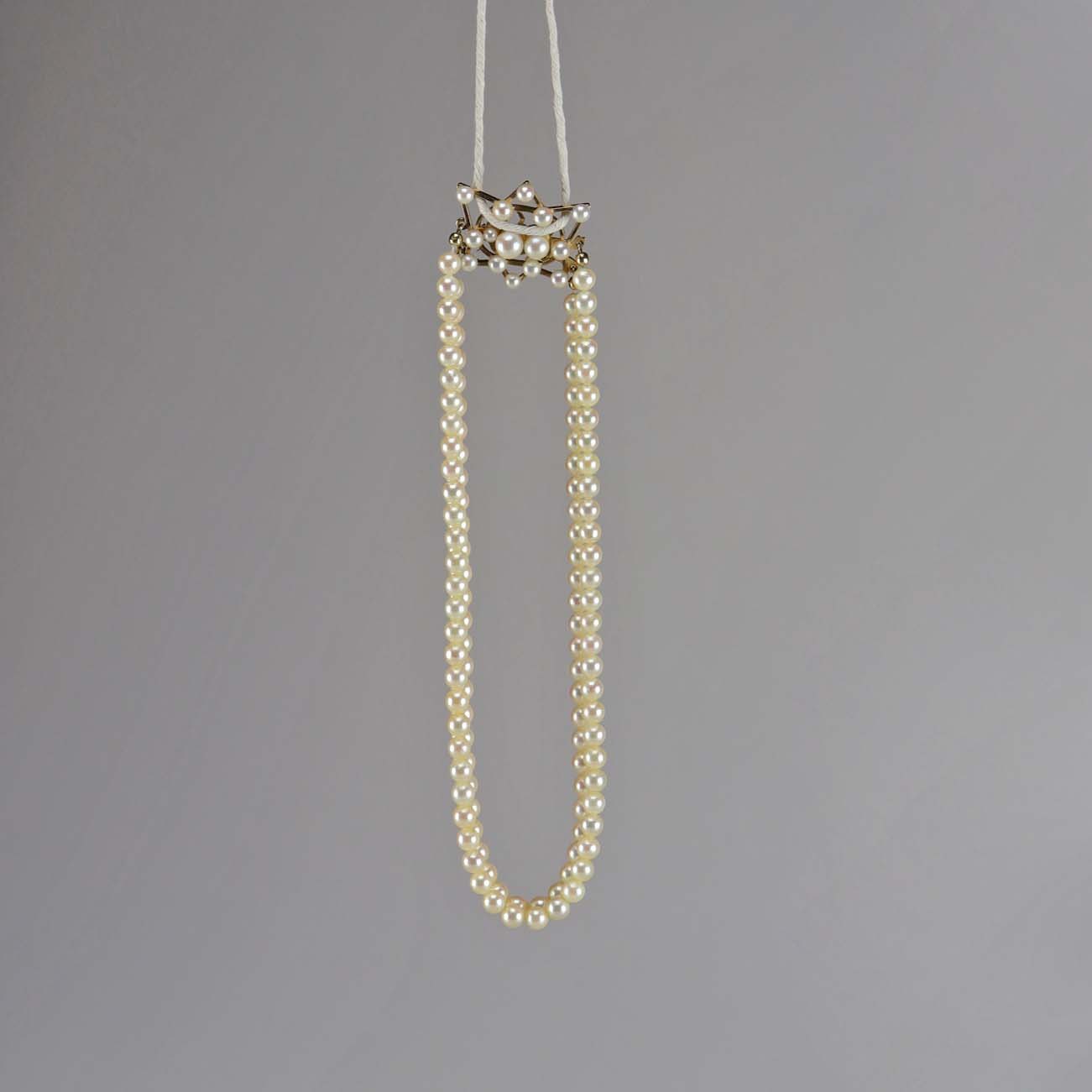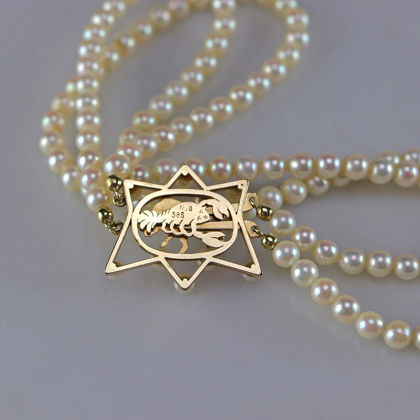 To strenget perlekæde med lås i 14 karat guld og perler sat som stjernetegnet Krebsen