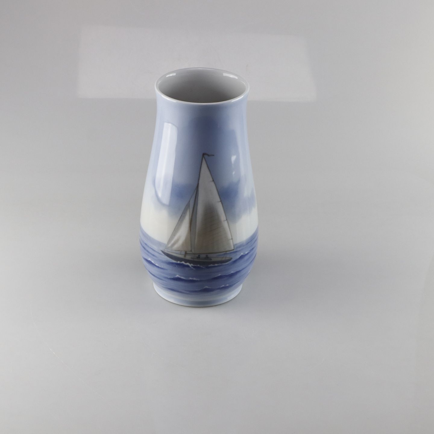 Vase i blå og hvide farver med motiv af sejlbåd på havet