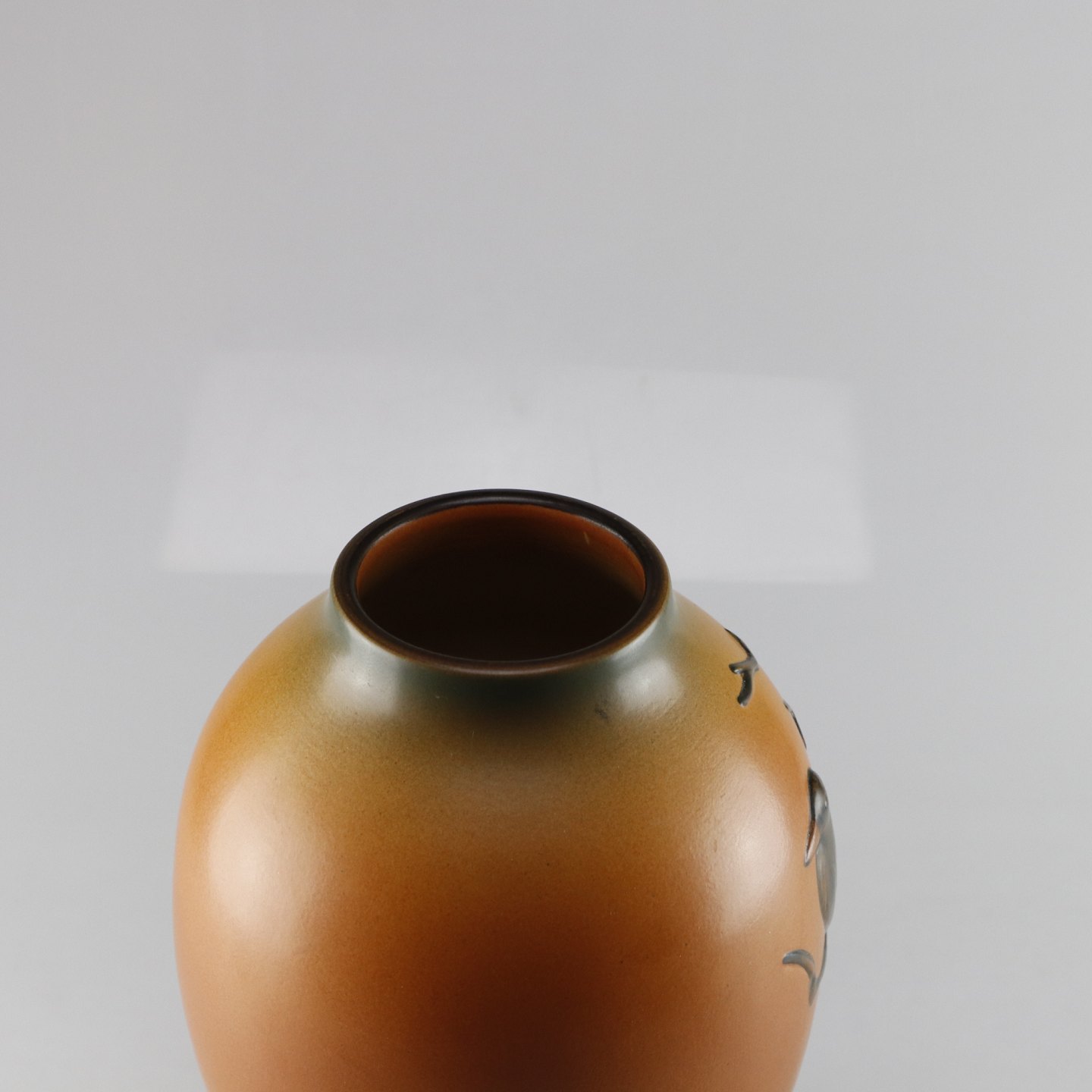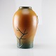 Keramikvase i orange og grønne farver med motiv af 2 krager på en gren