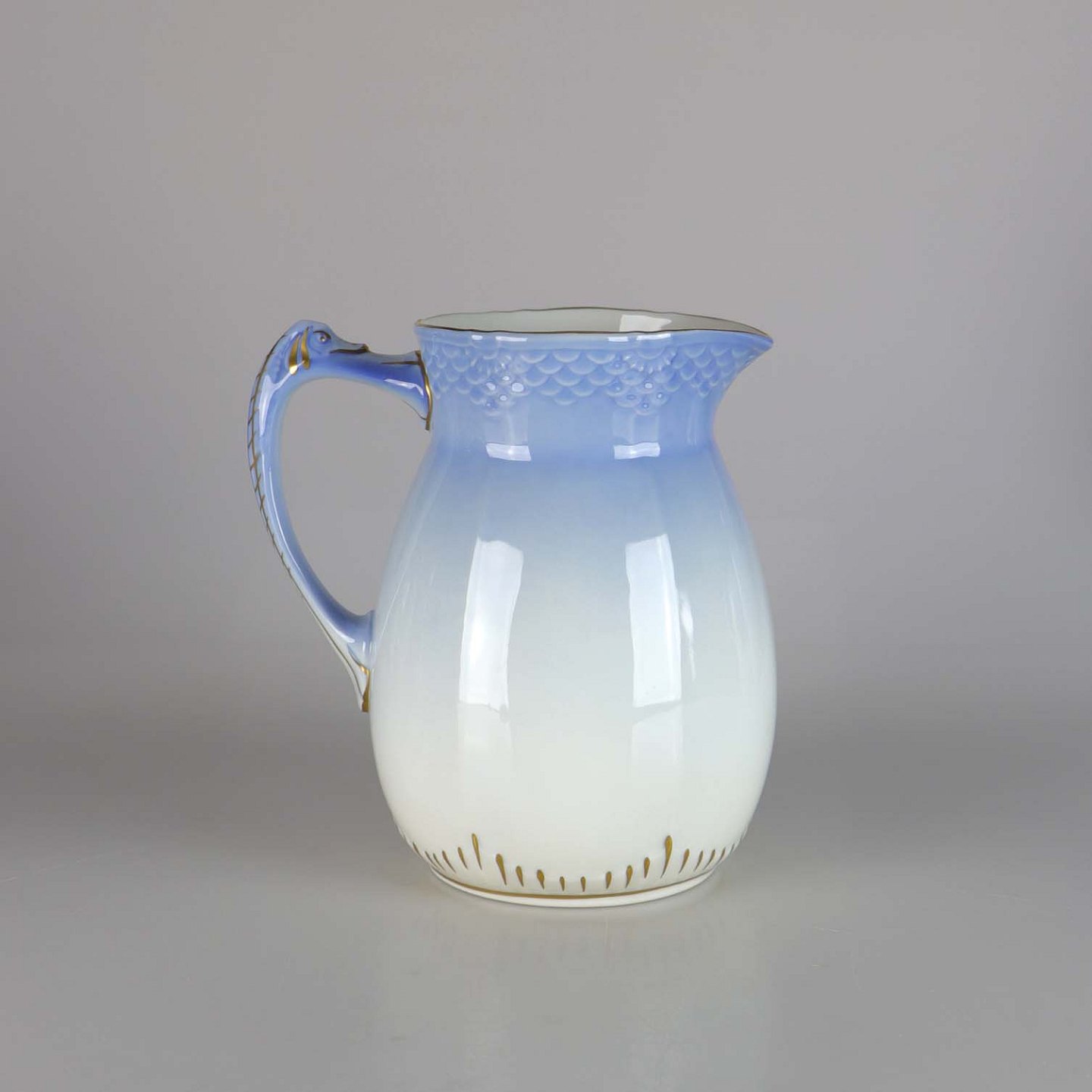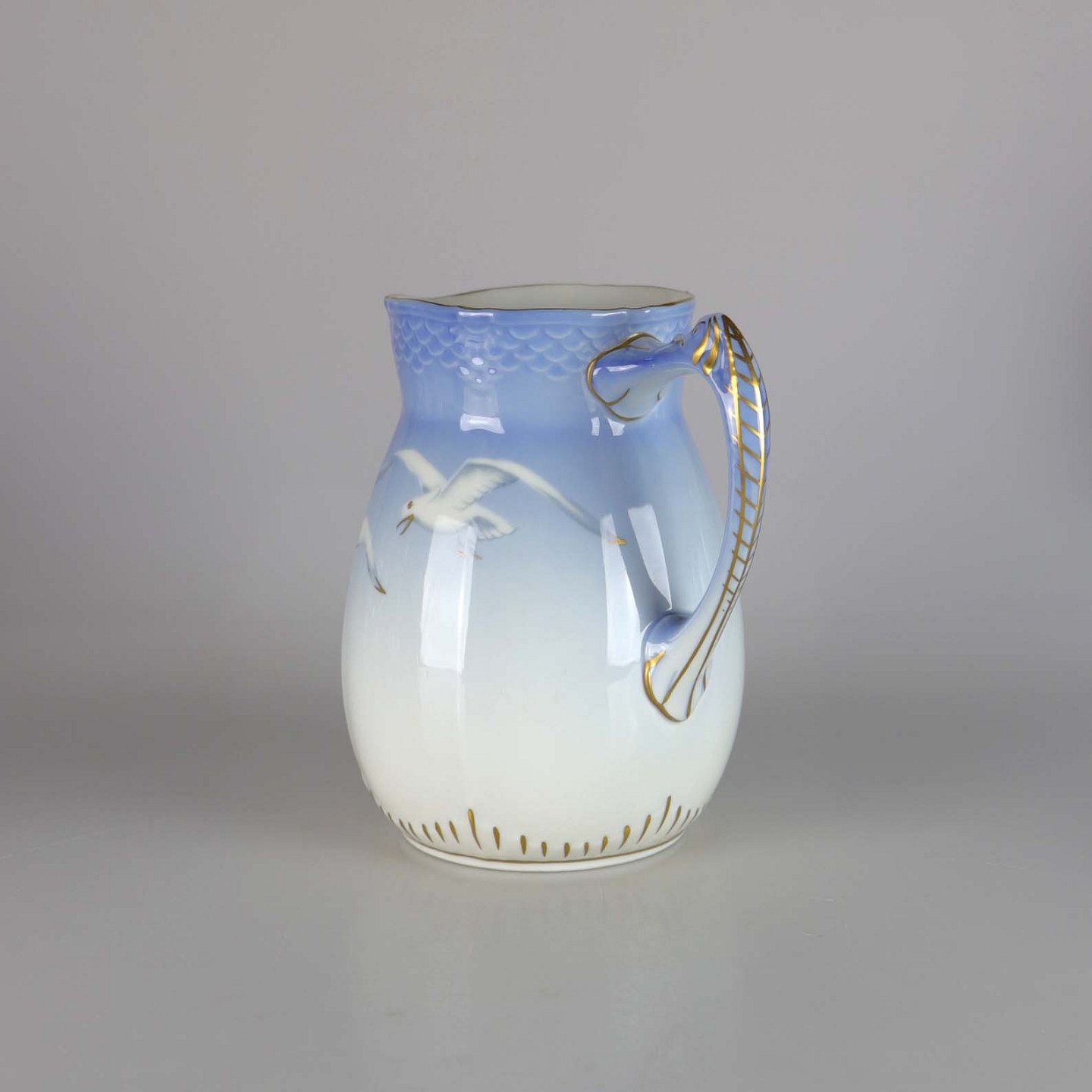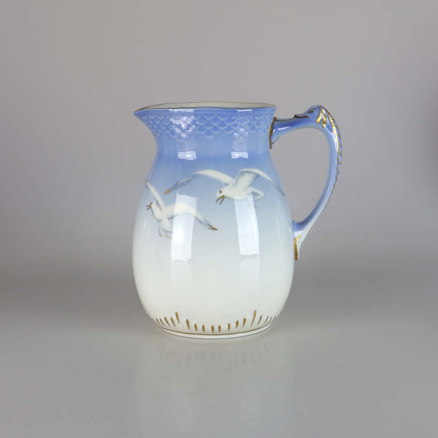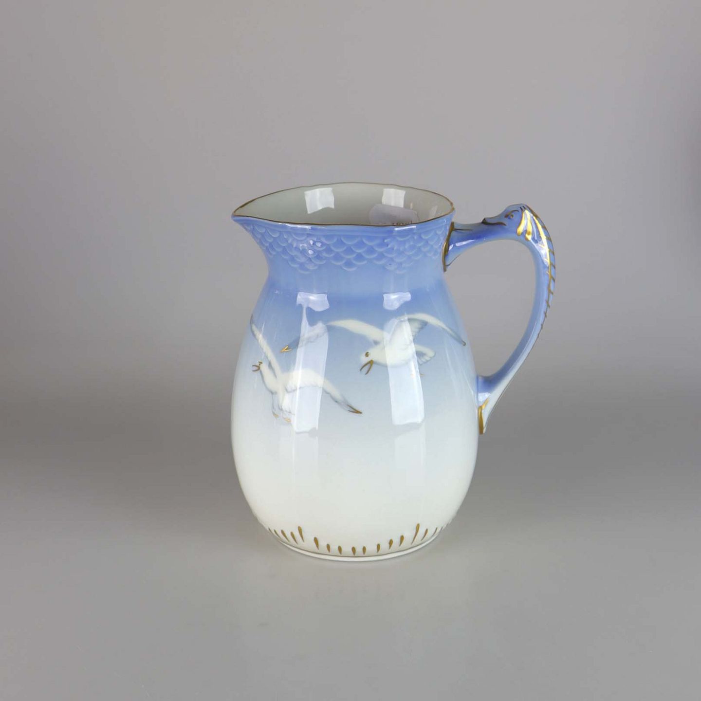 Porcelænskande i blålige farver dekoreret med måger og guldkant