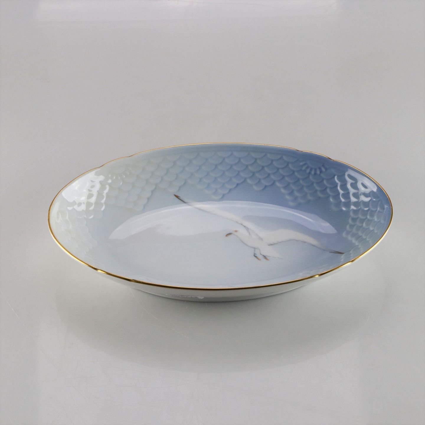 Porcelænsskål i hvid og gradueret blå nuancer med guldkant og dekoration af måge