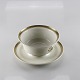 Cremefarvet porcelæn med motiv af gylden kløverblomst og bred graveret guldkantkant.
