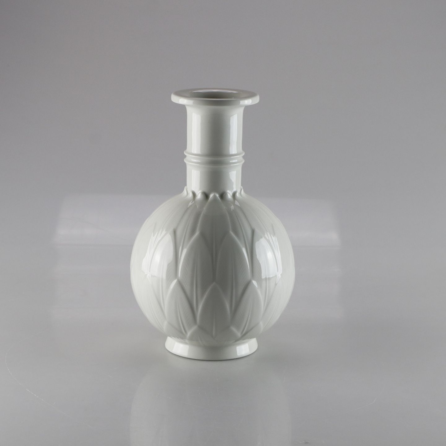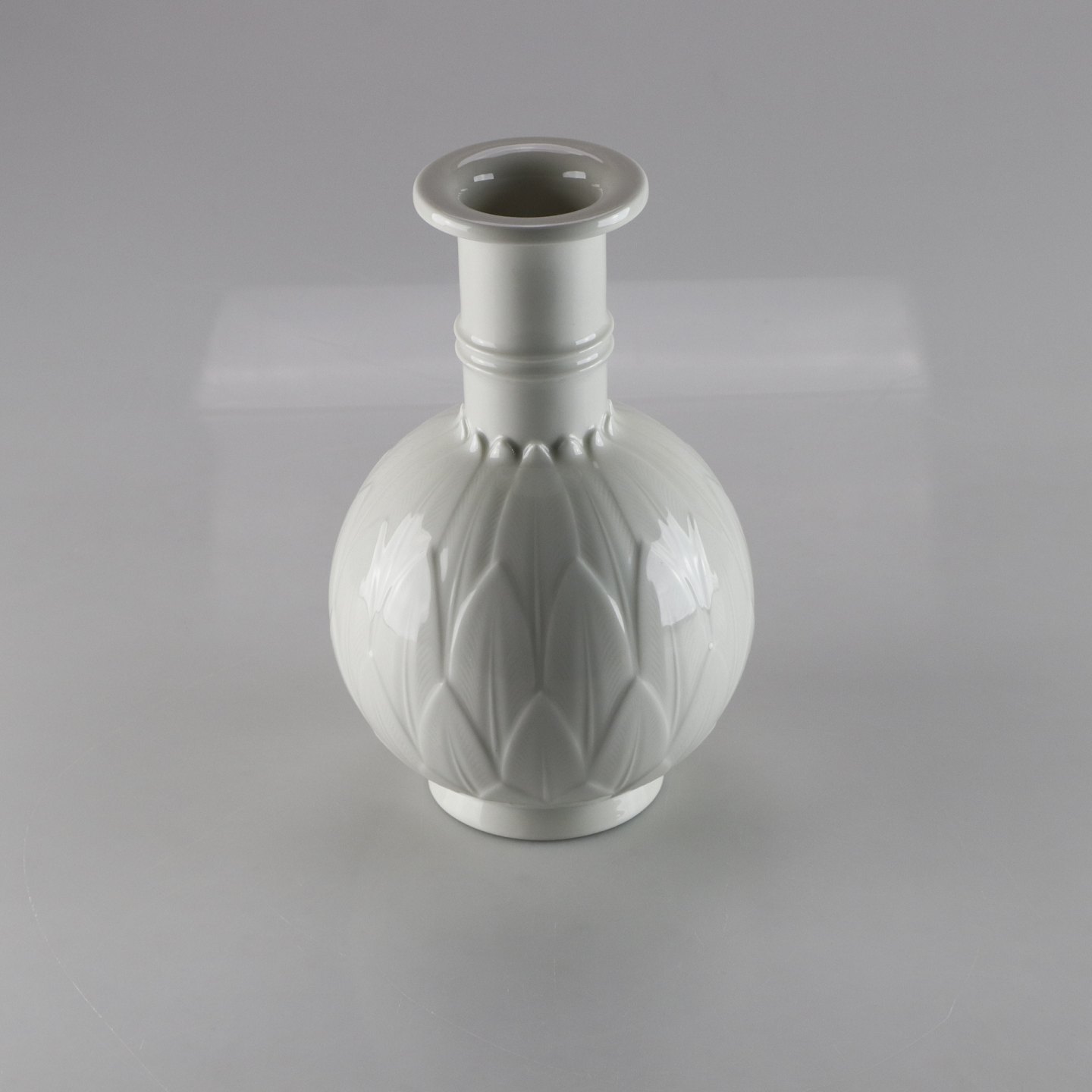 Vase i hvid glaseret porcelæn, dekoreret med bladrelief