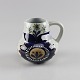 Kande af fajance i hvid med dekoration af mørk blå blomster og blade.