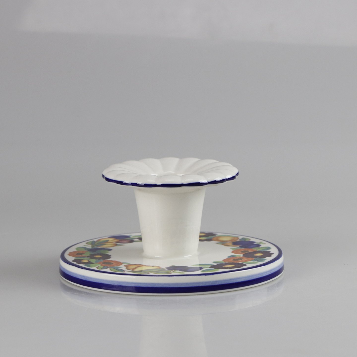 Serveringsfad i glat hvidt porcelæn med blå kant og dekoreret med sommerblomster og frugter.