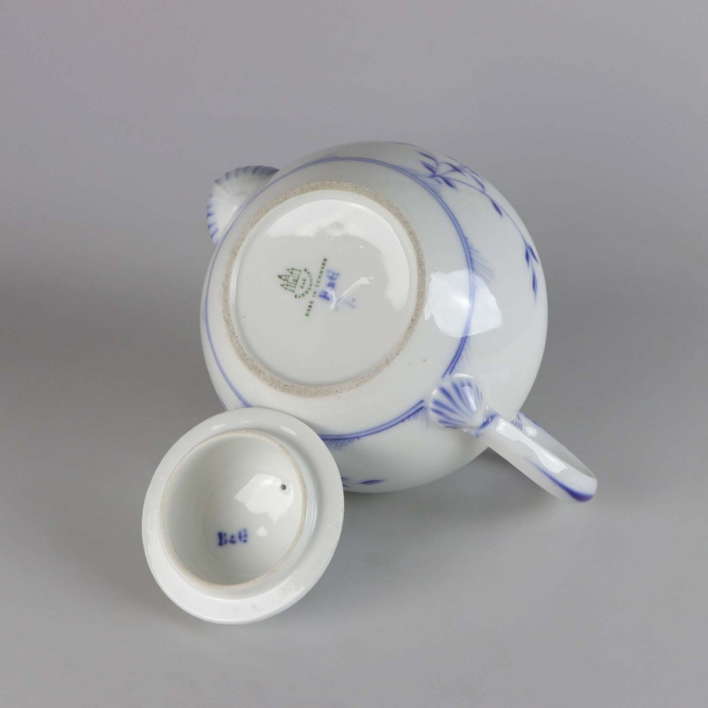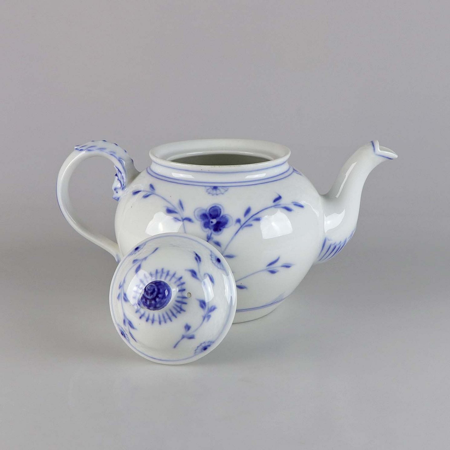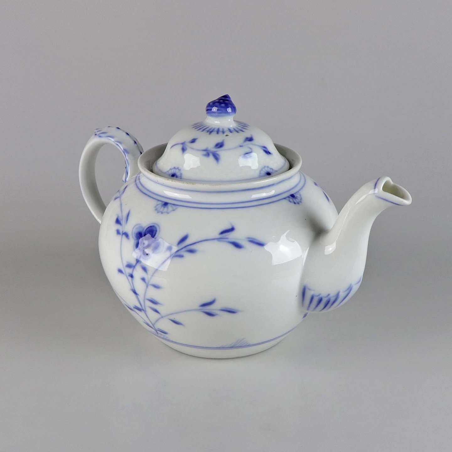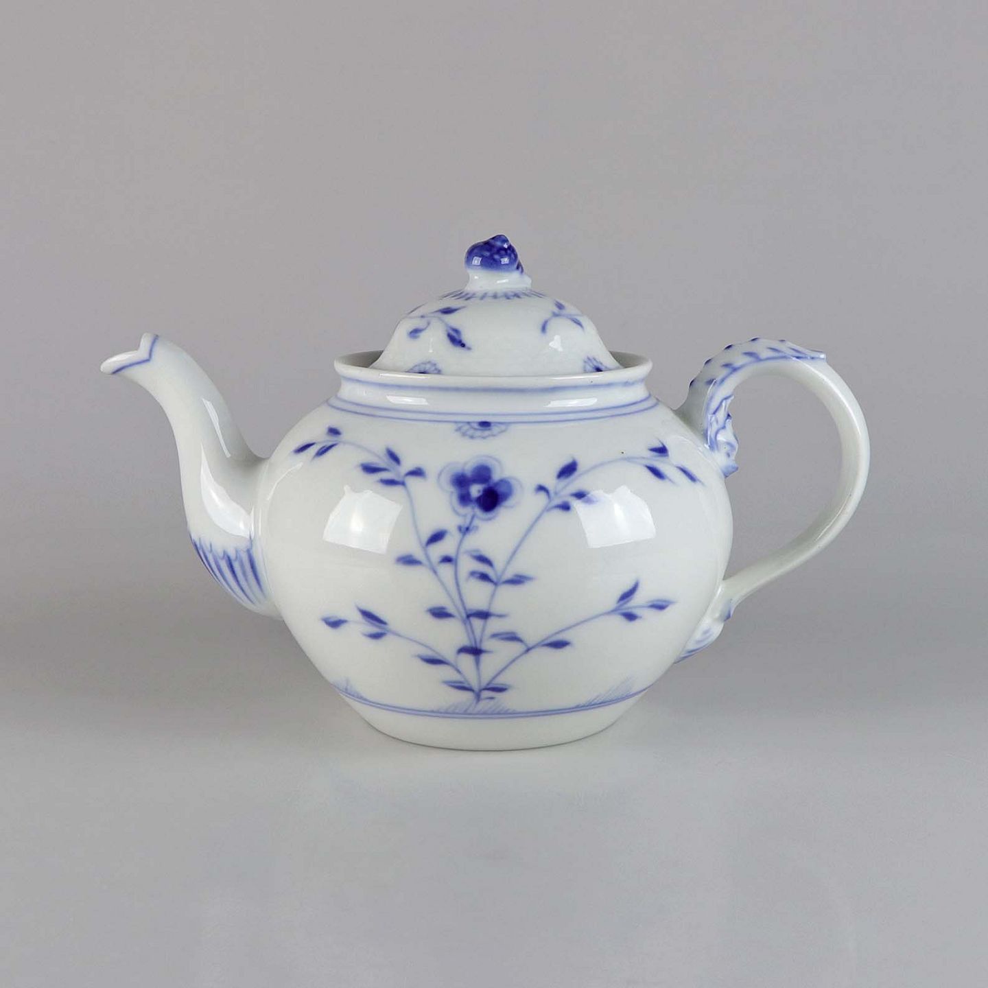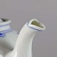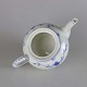 Kande i hvidt skælformet porcelæn med blå motiver af blomster og sommerfugle.