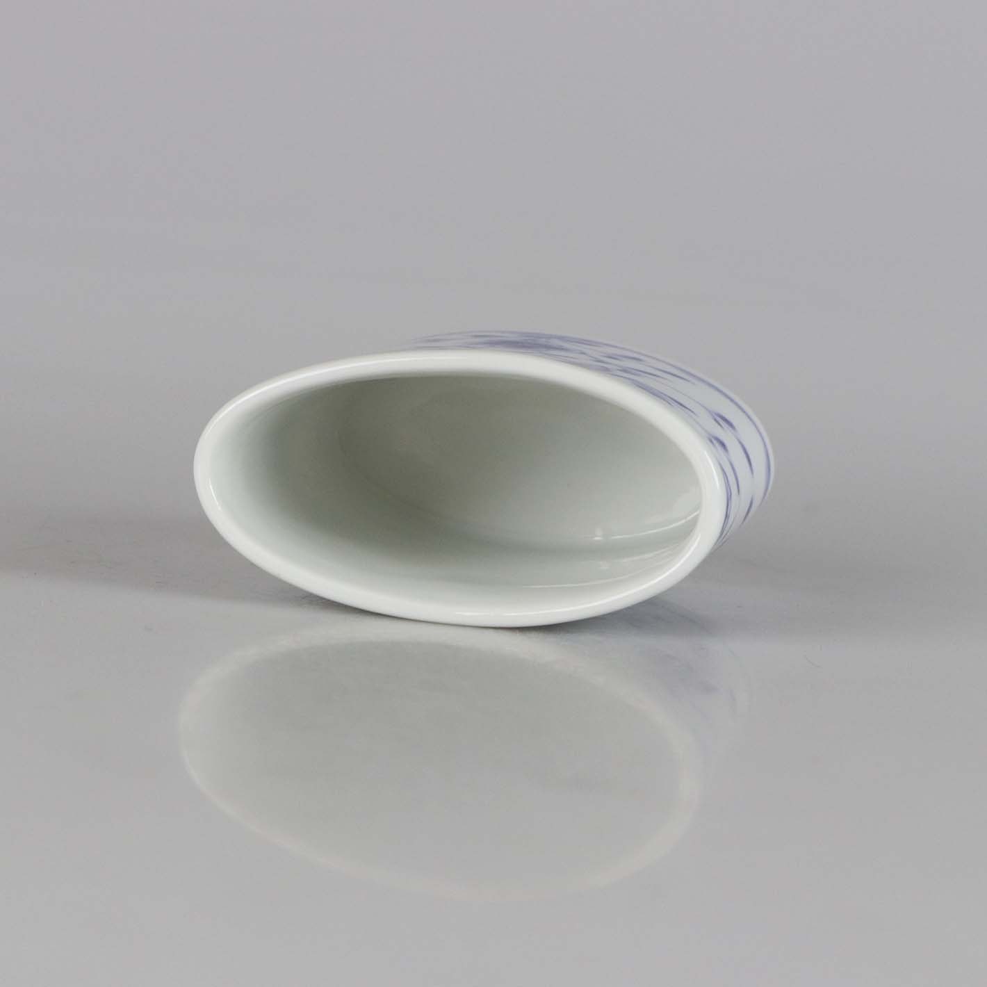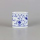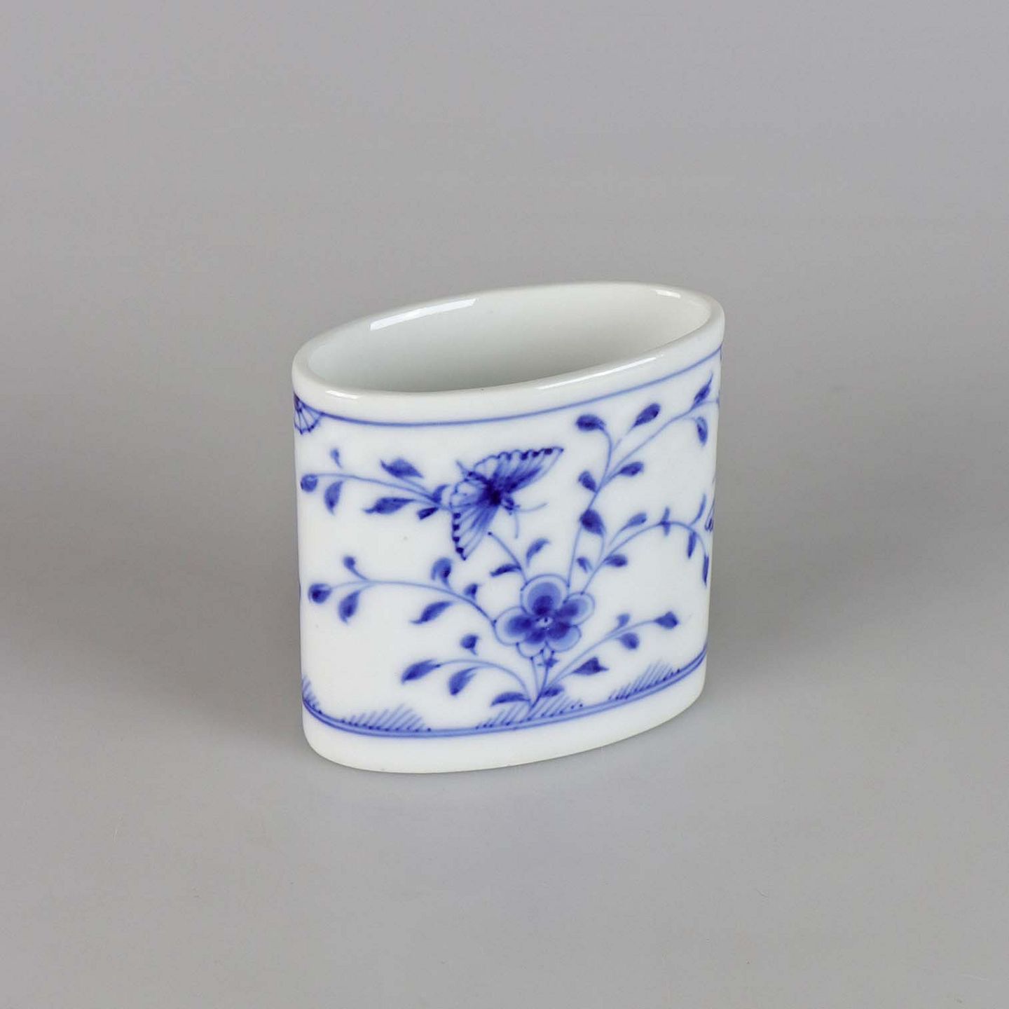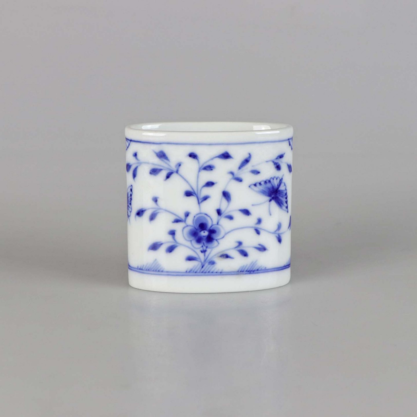 Bæger i hvidt porcelæn med blå motiver af blomster og sommerfugle.