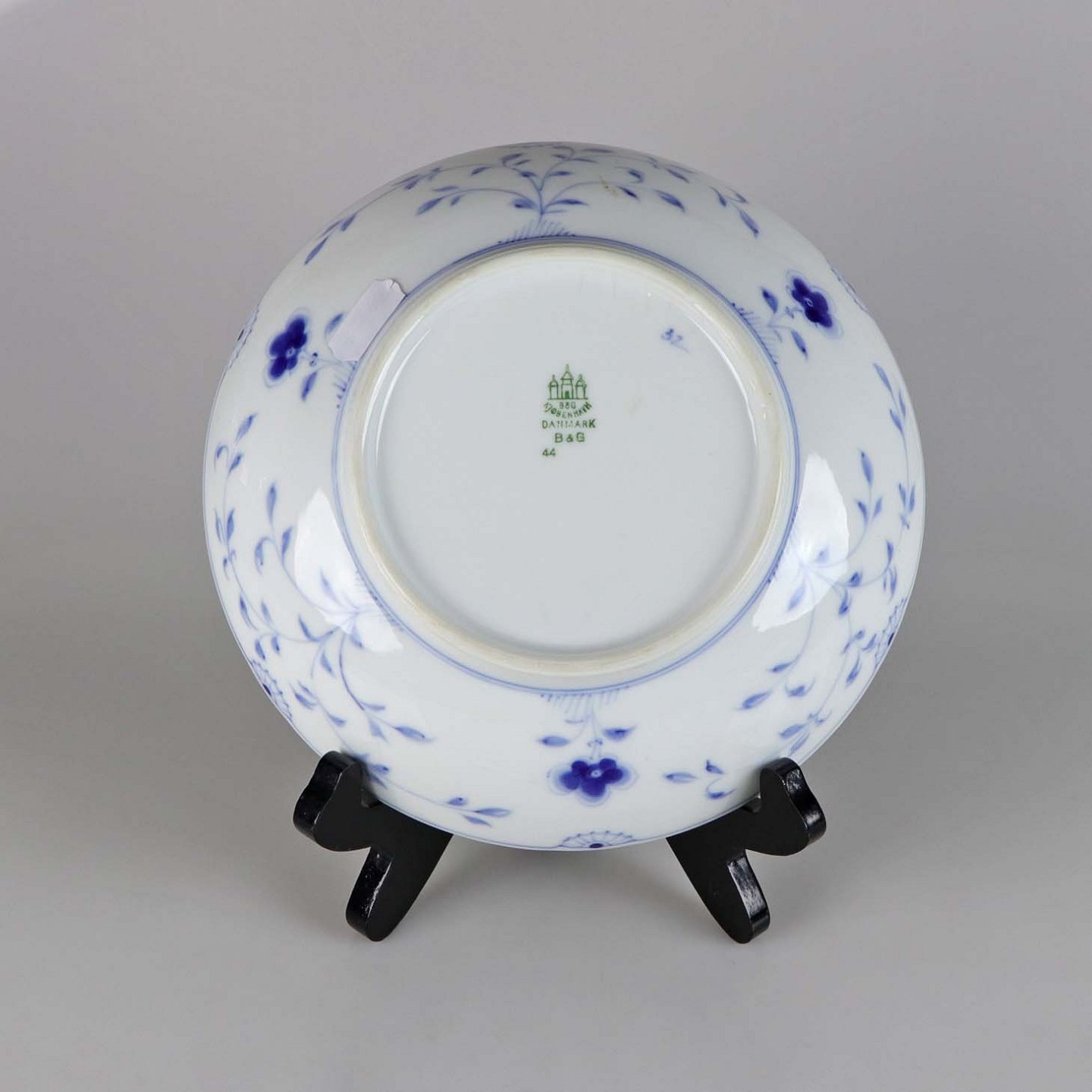 Skål i hvidt skælformet porcelæn med blå motiver af blomster og sommerfugle.