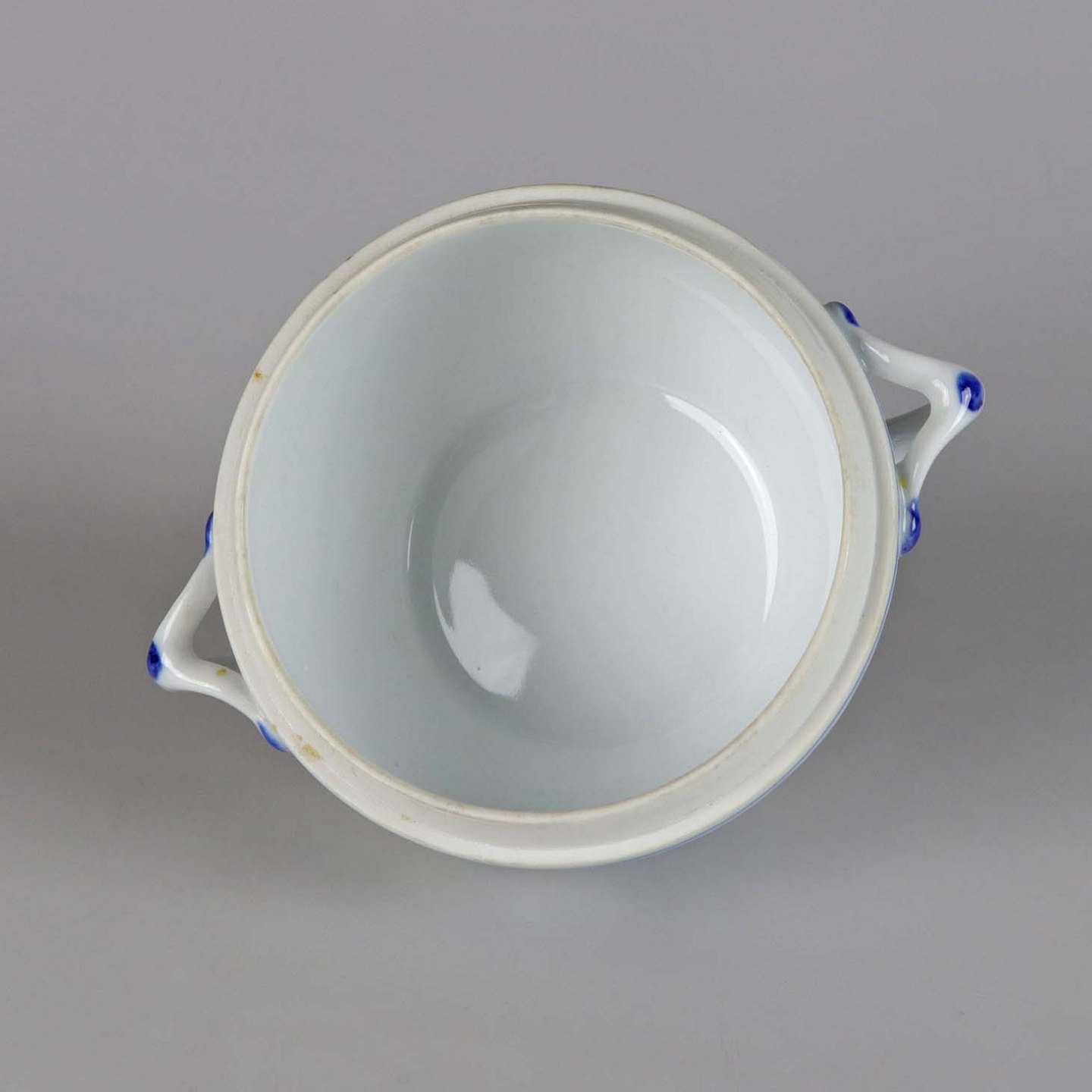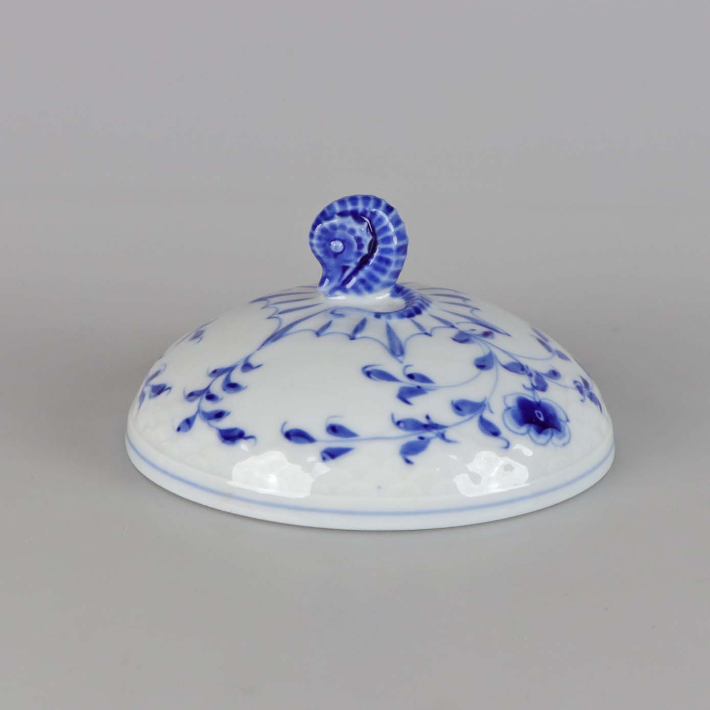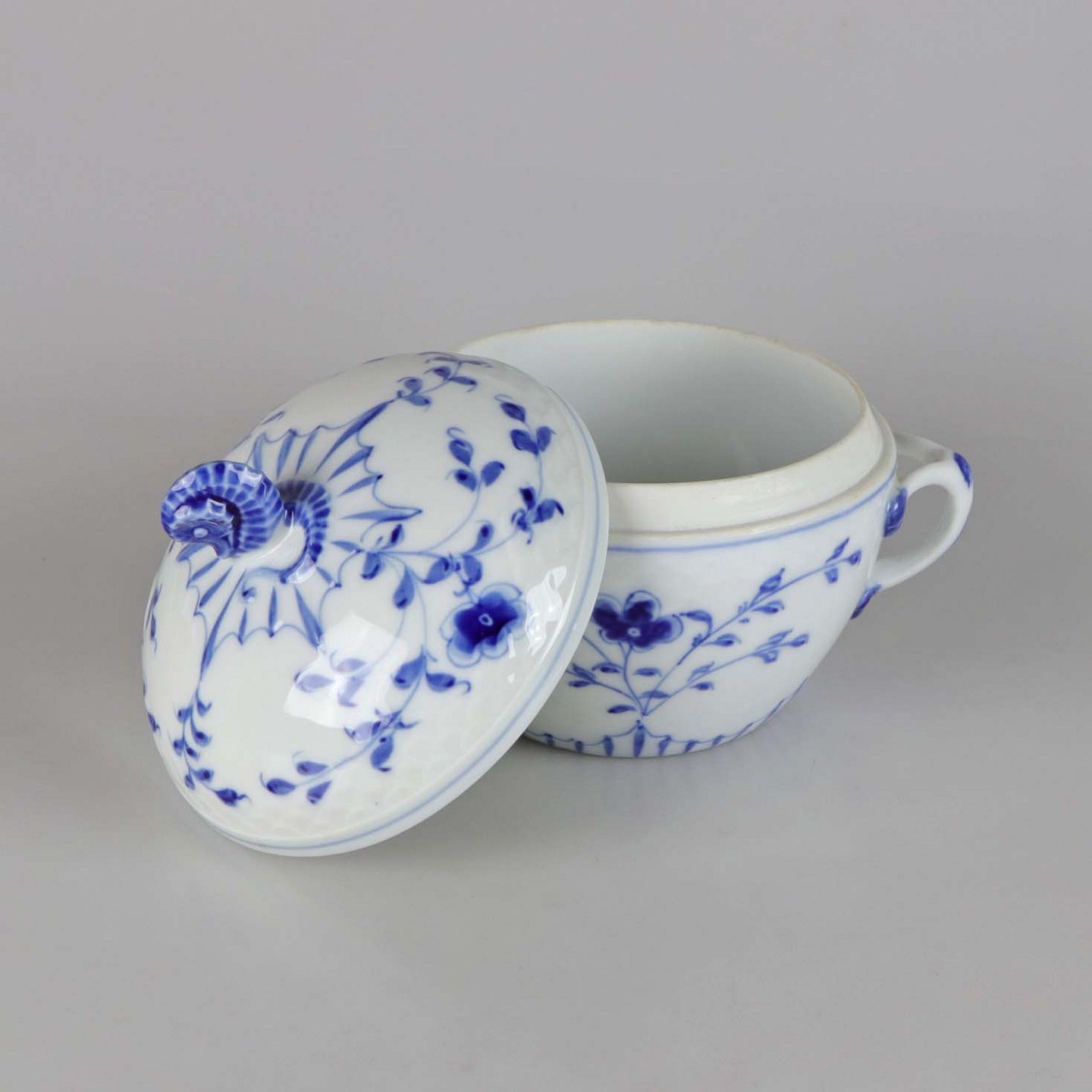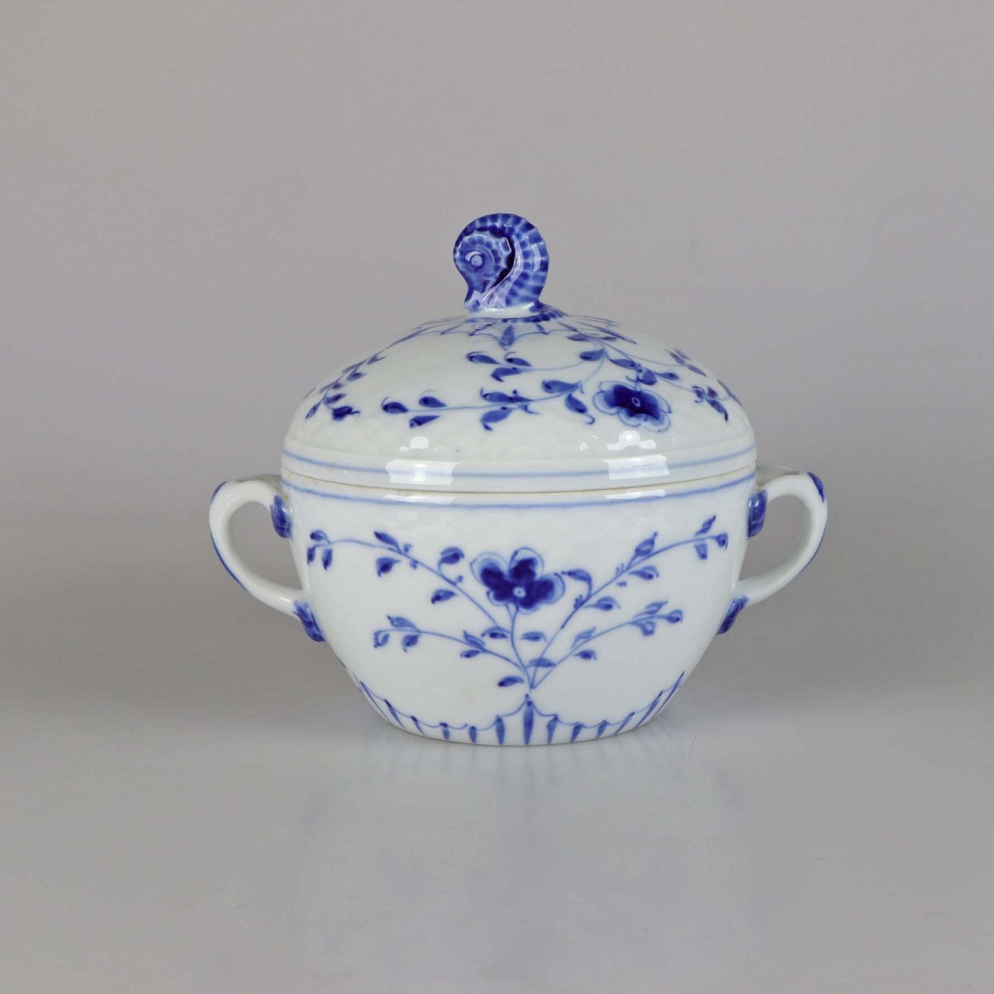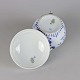 Sukkerskål i hvidt skælformet porcelæn med blå motiver af blomster og sommerfugle.