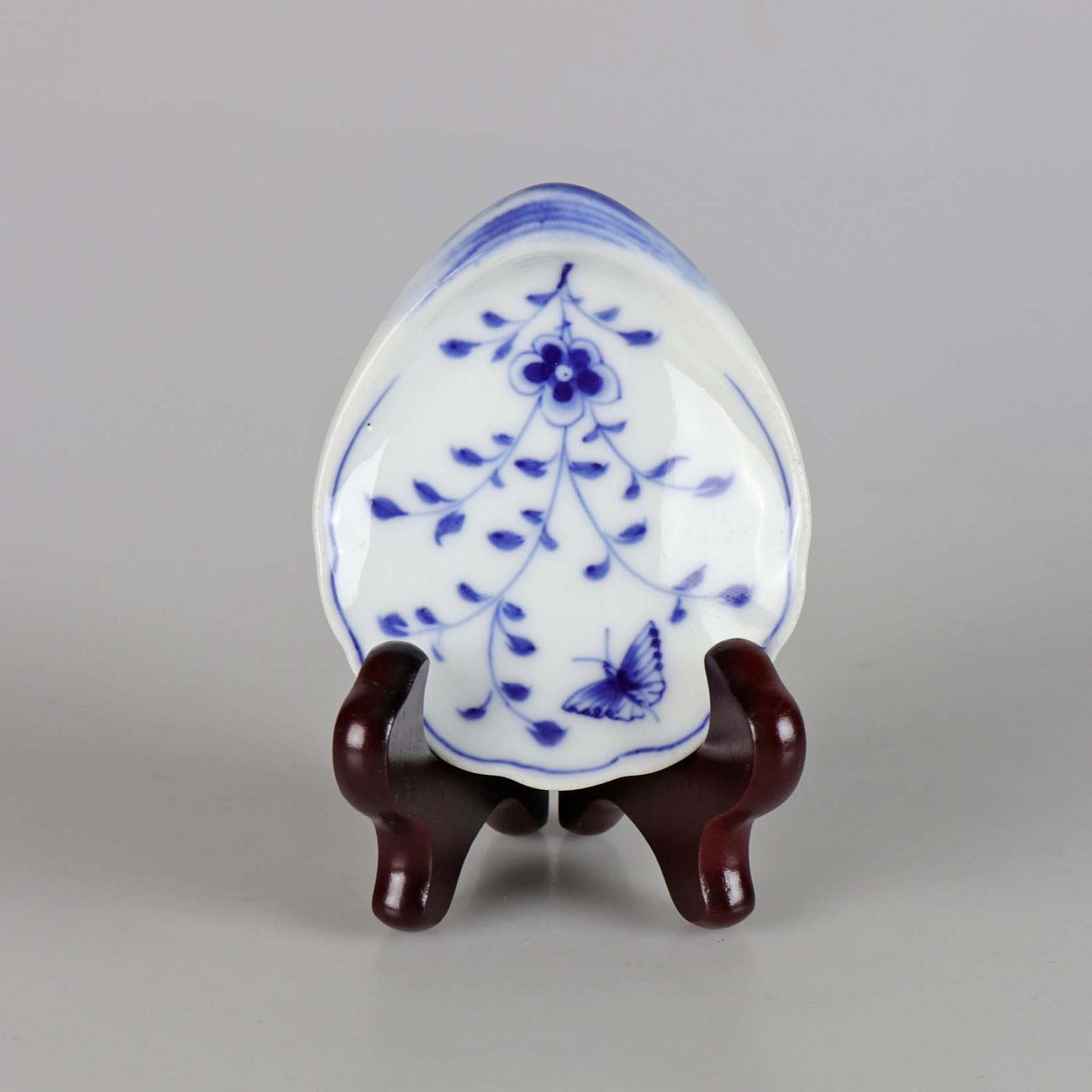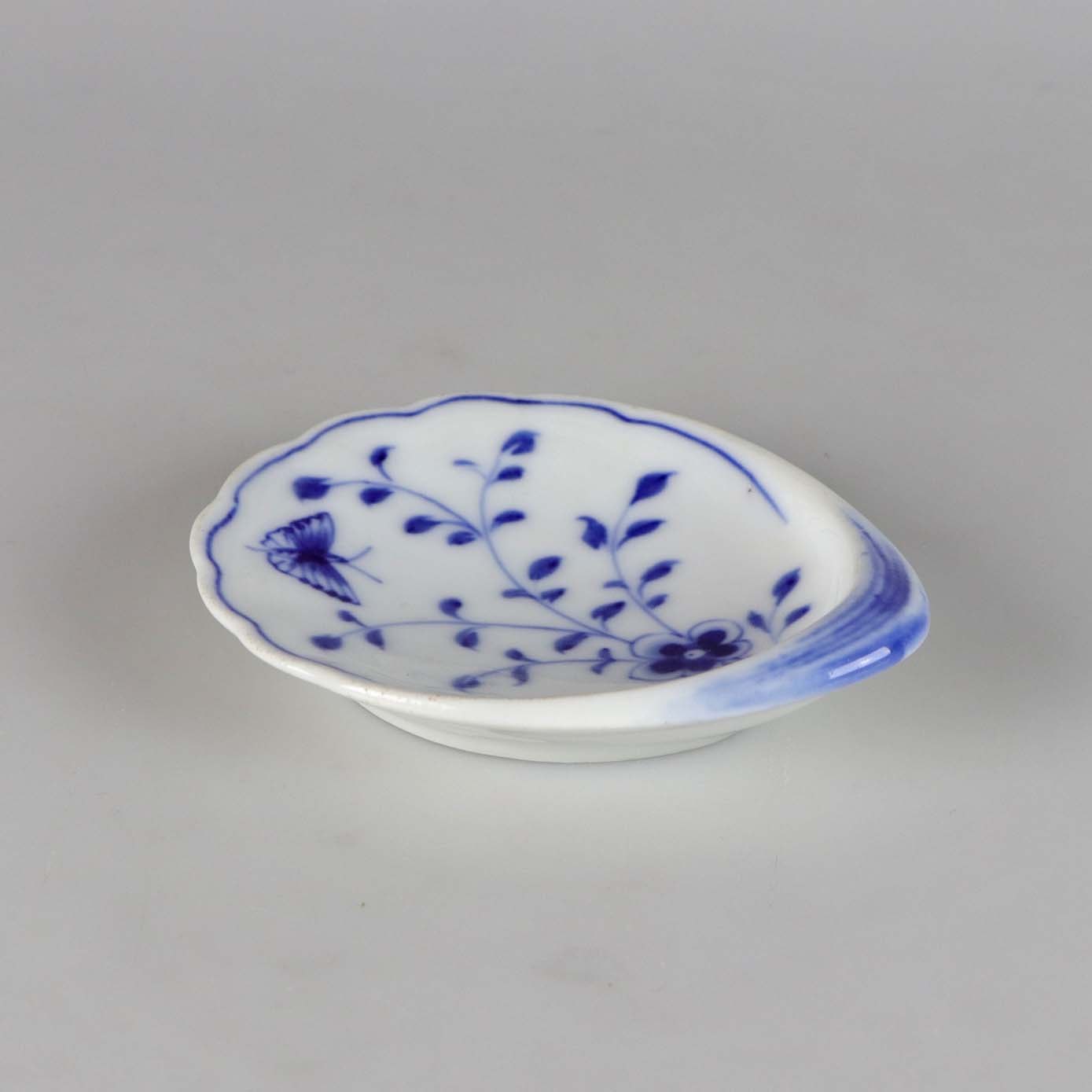 Kuvertasiet i hvidt skælformet porcelæn med blå motiver af blomster og sommerfugle.
