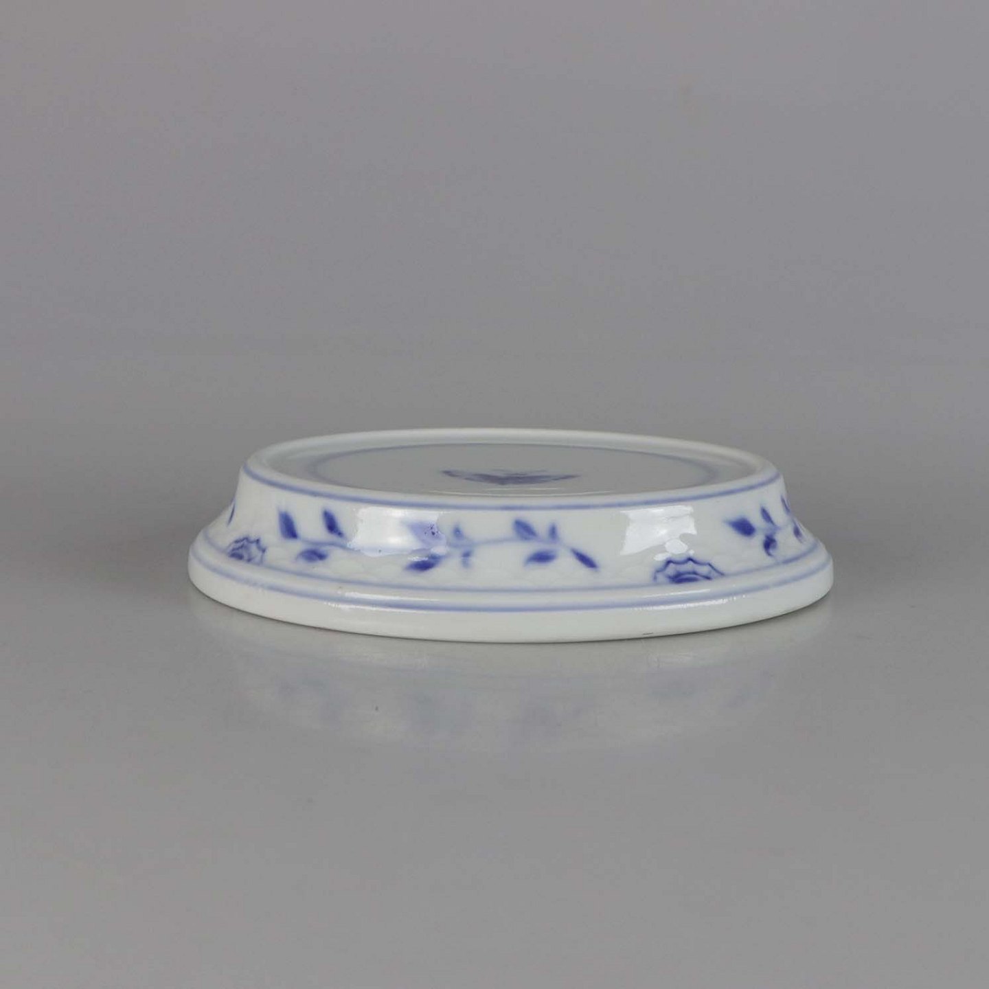 Skåner i hvidt porcelæn med blå motiver af blomster og sommerfugle.