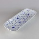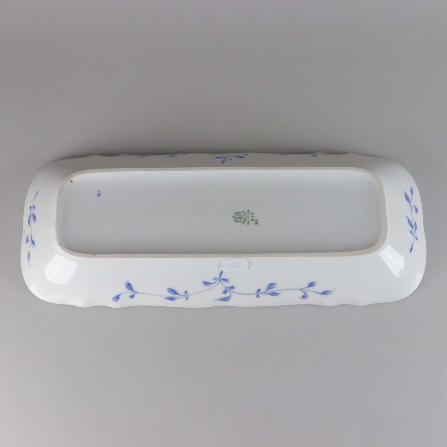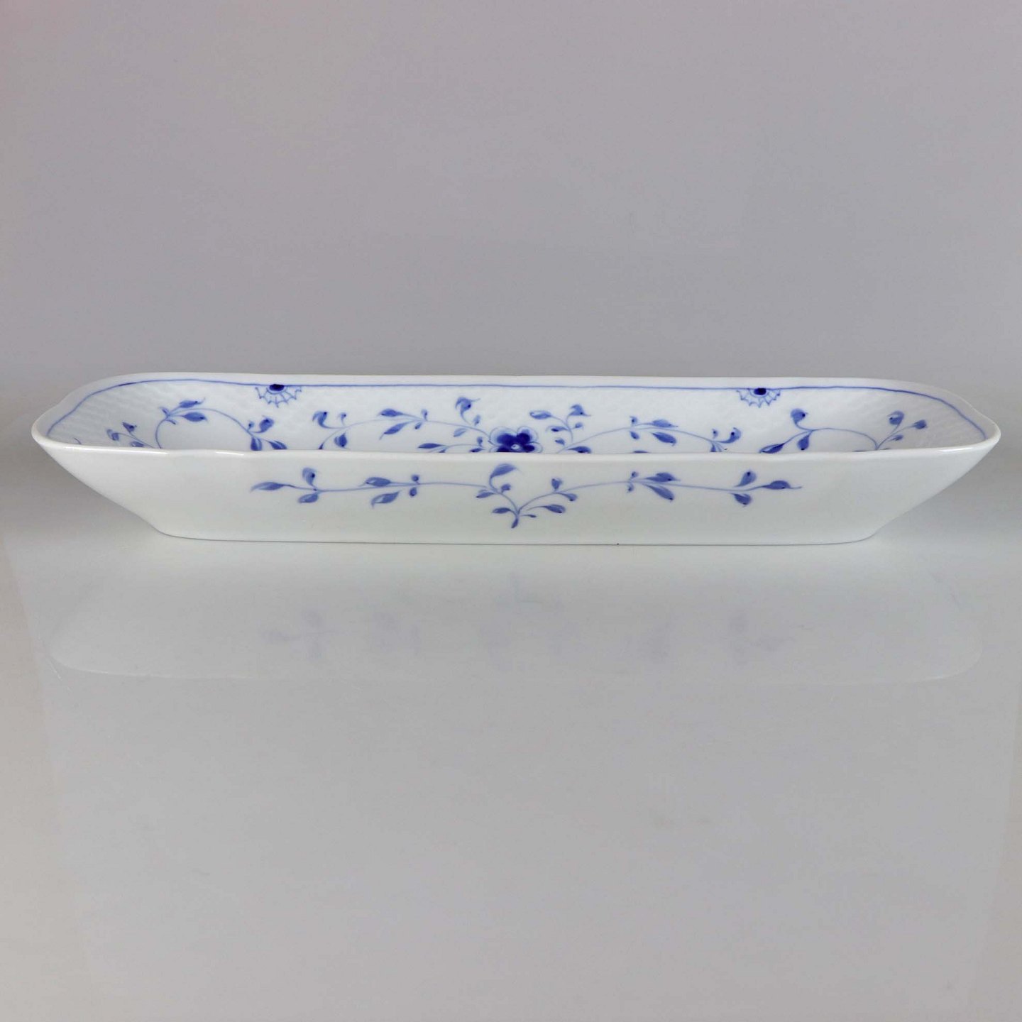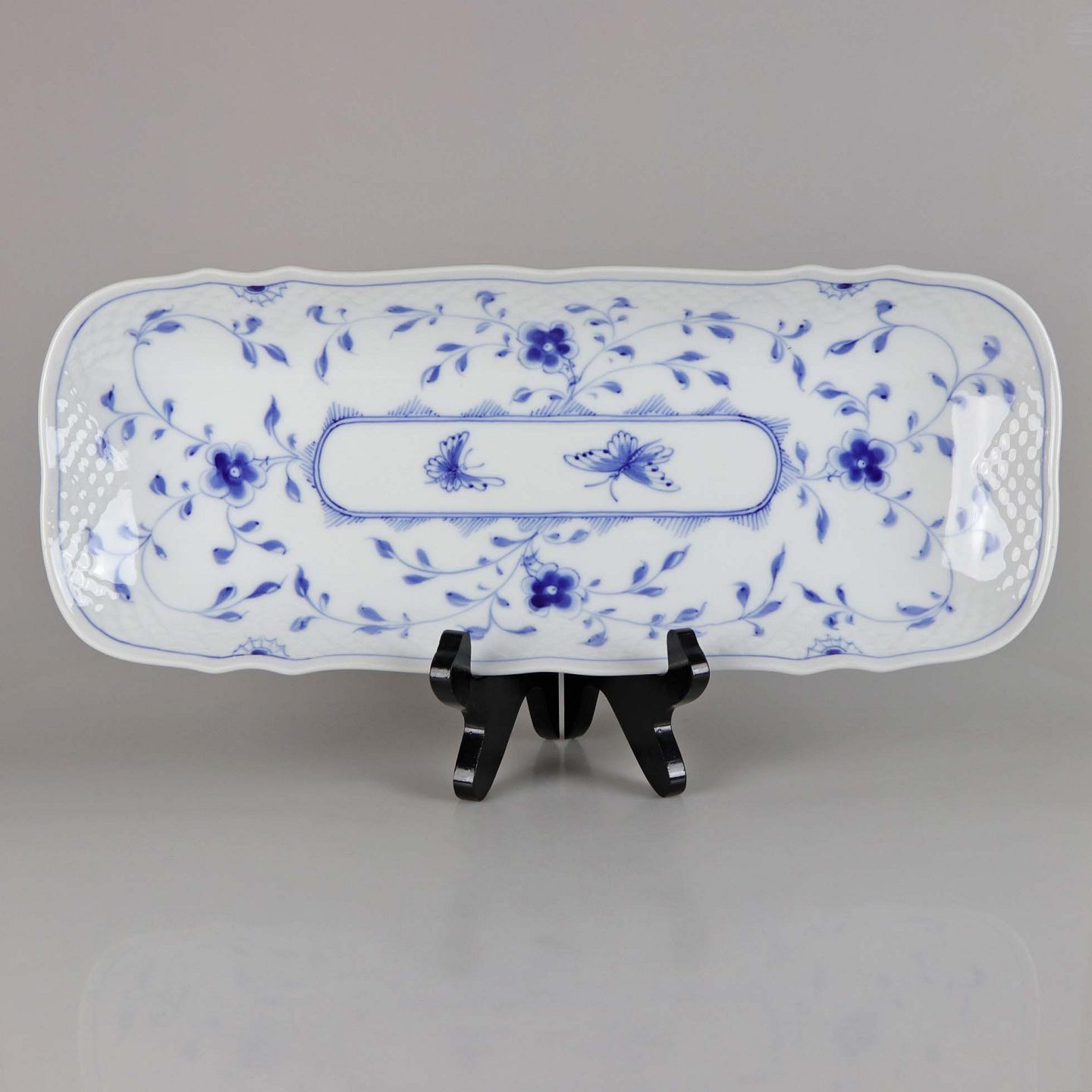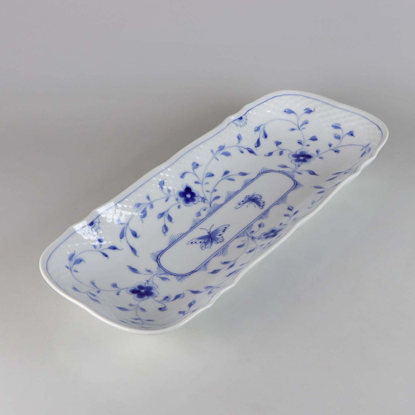 Rektangulært fad i hvidt skælformet porcelæn med blå motiver af blomster og sommerfugle.