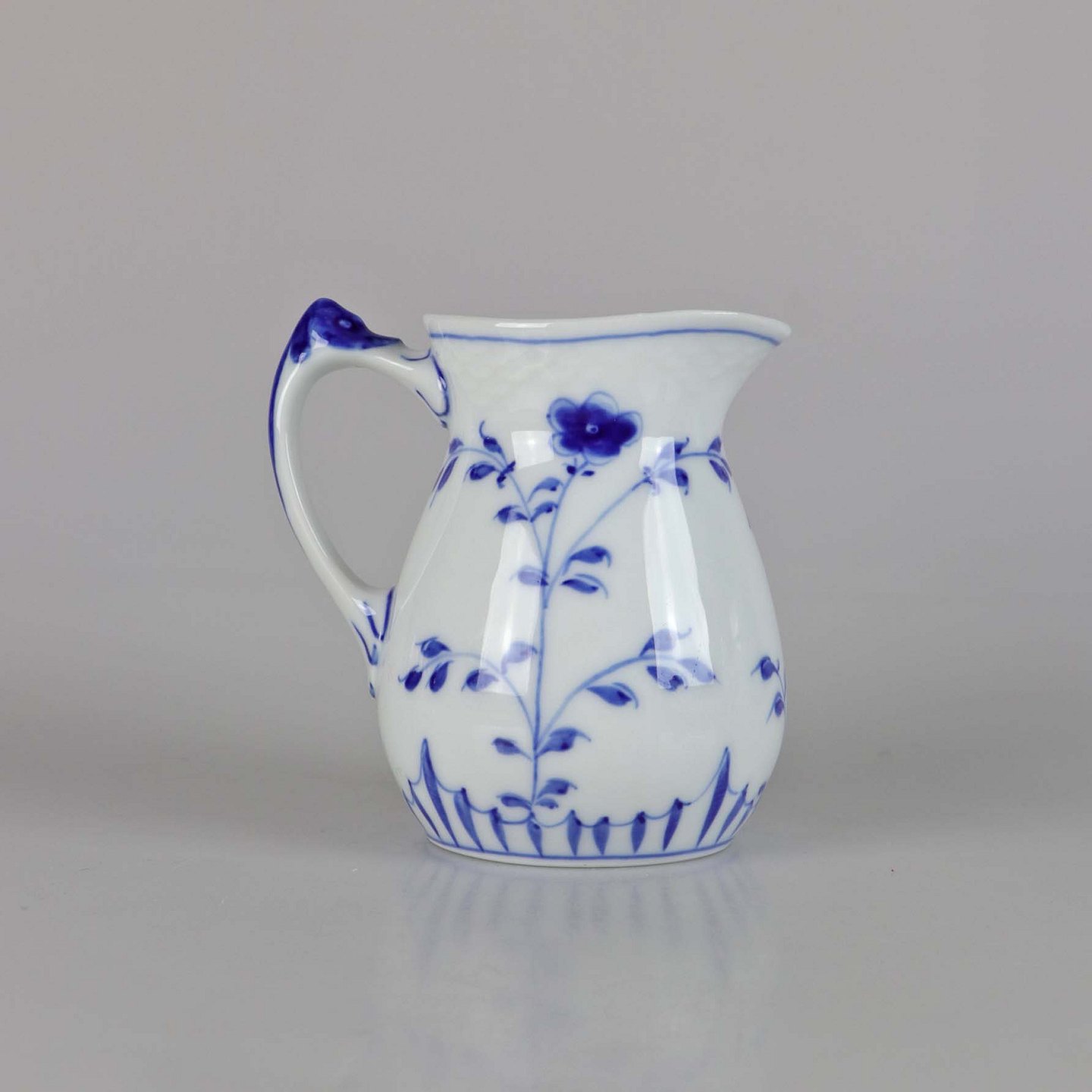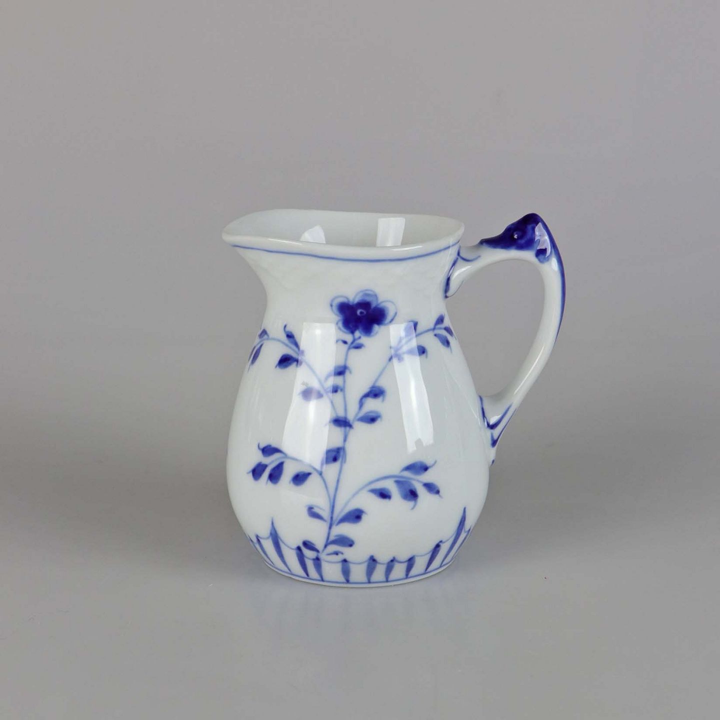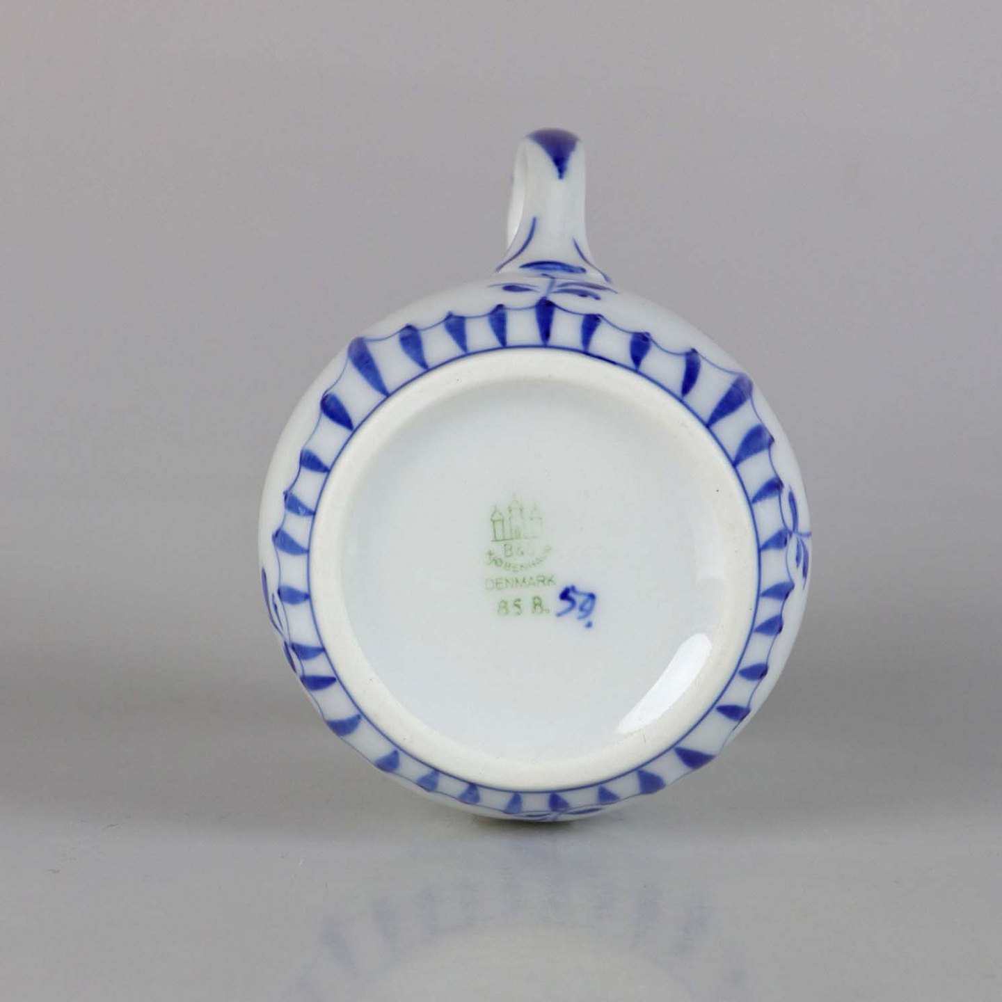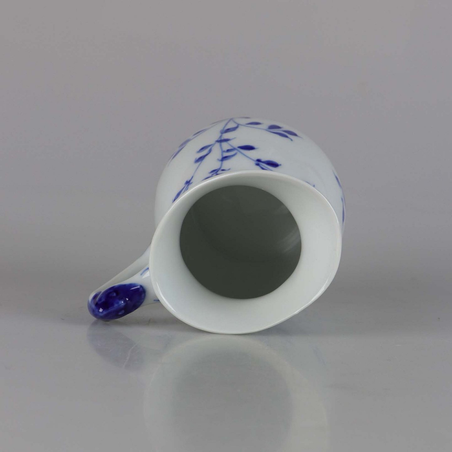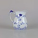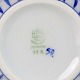 Kande i hvidt skælformet porcelæn med blå motiver af blomster og sommerfugle.