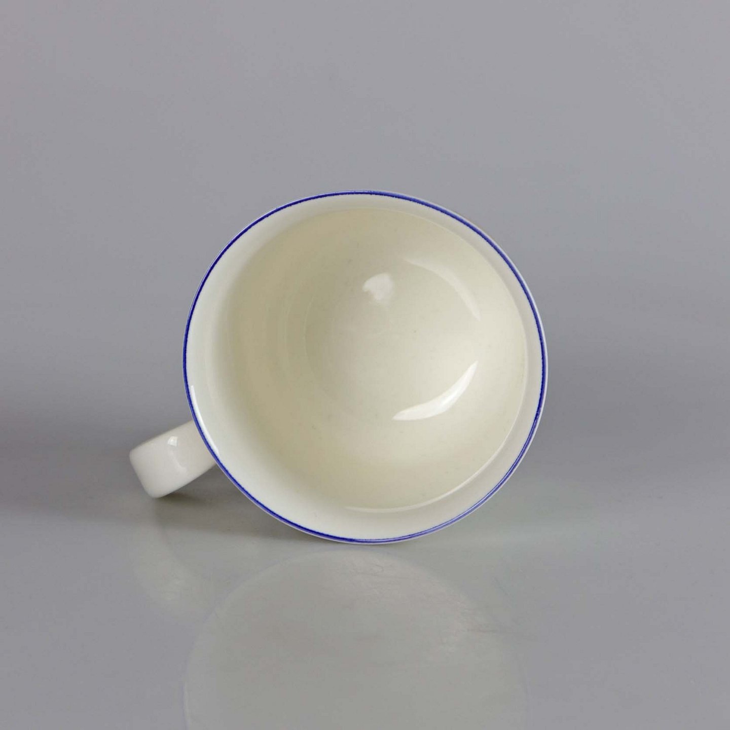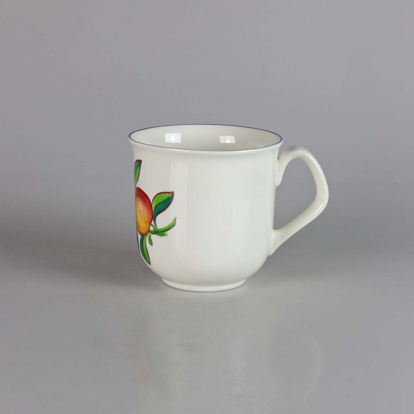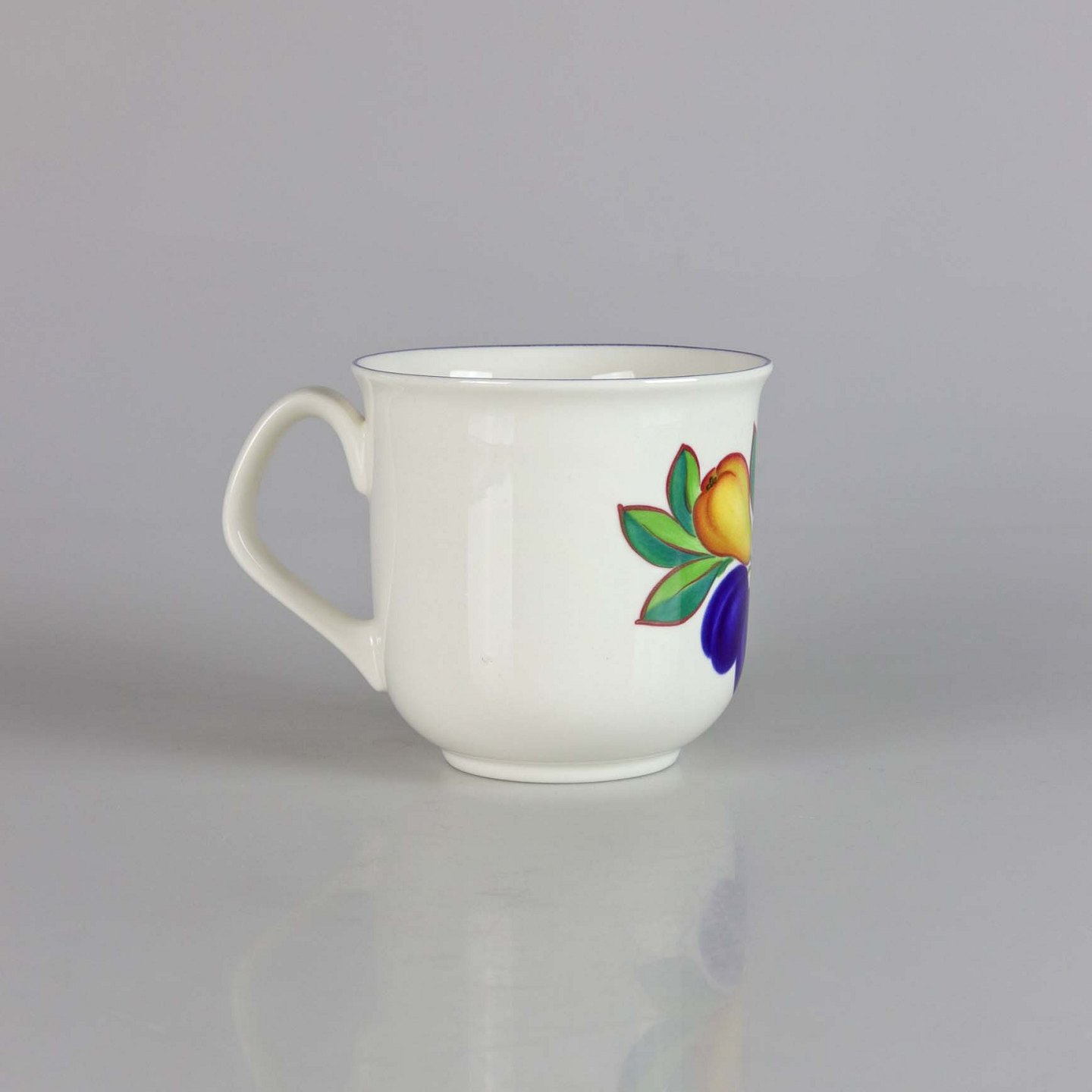 Krus i glat hvidt porcelæn med blå kant og dekoreret med sommerblomster og frugter