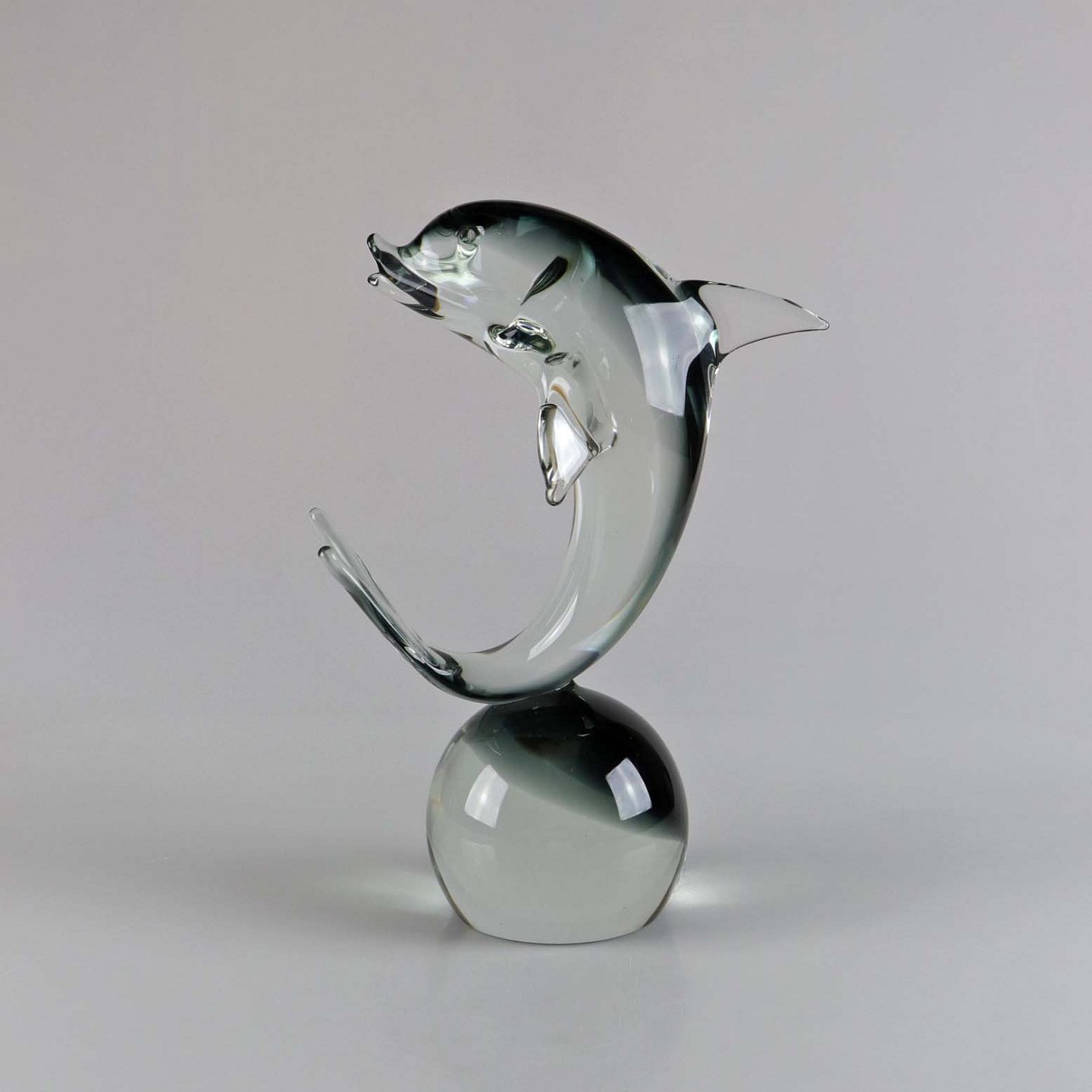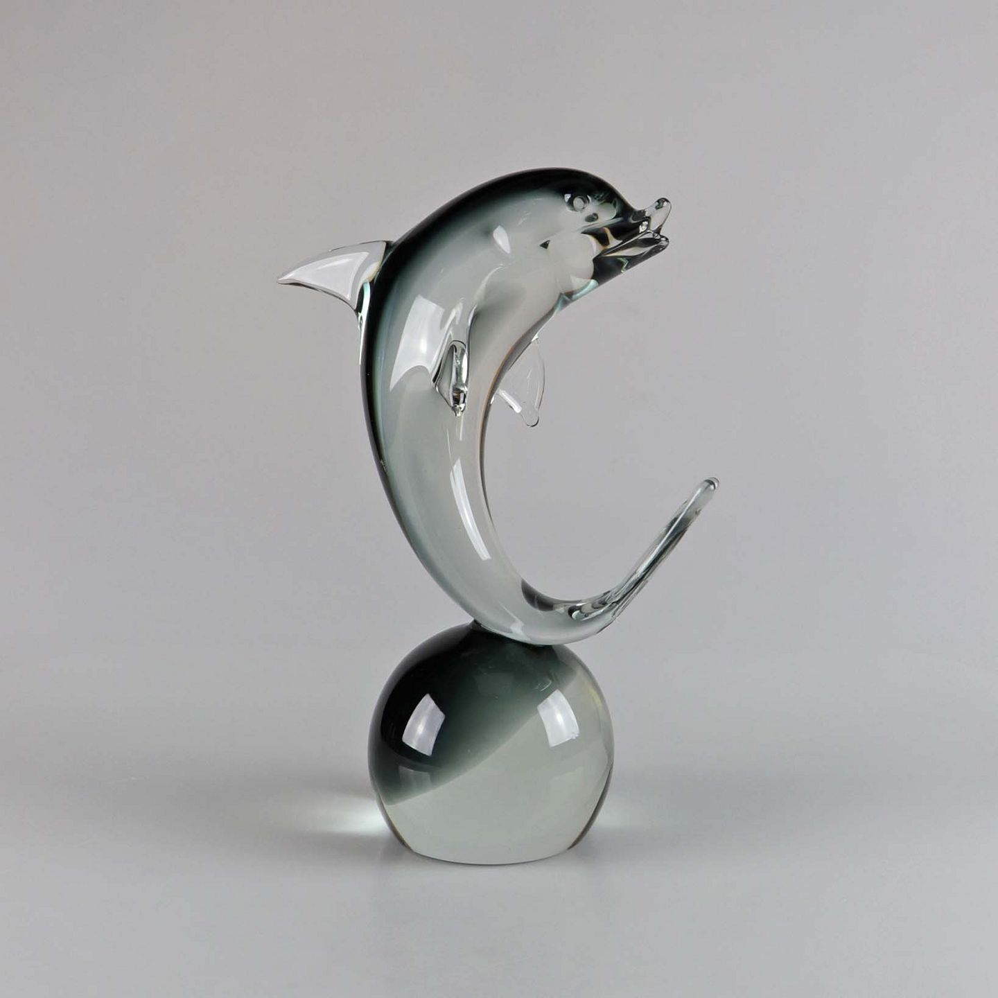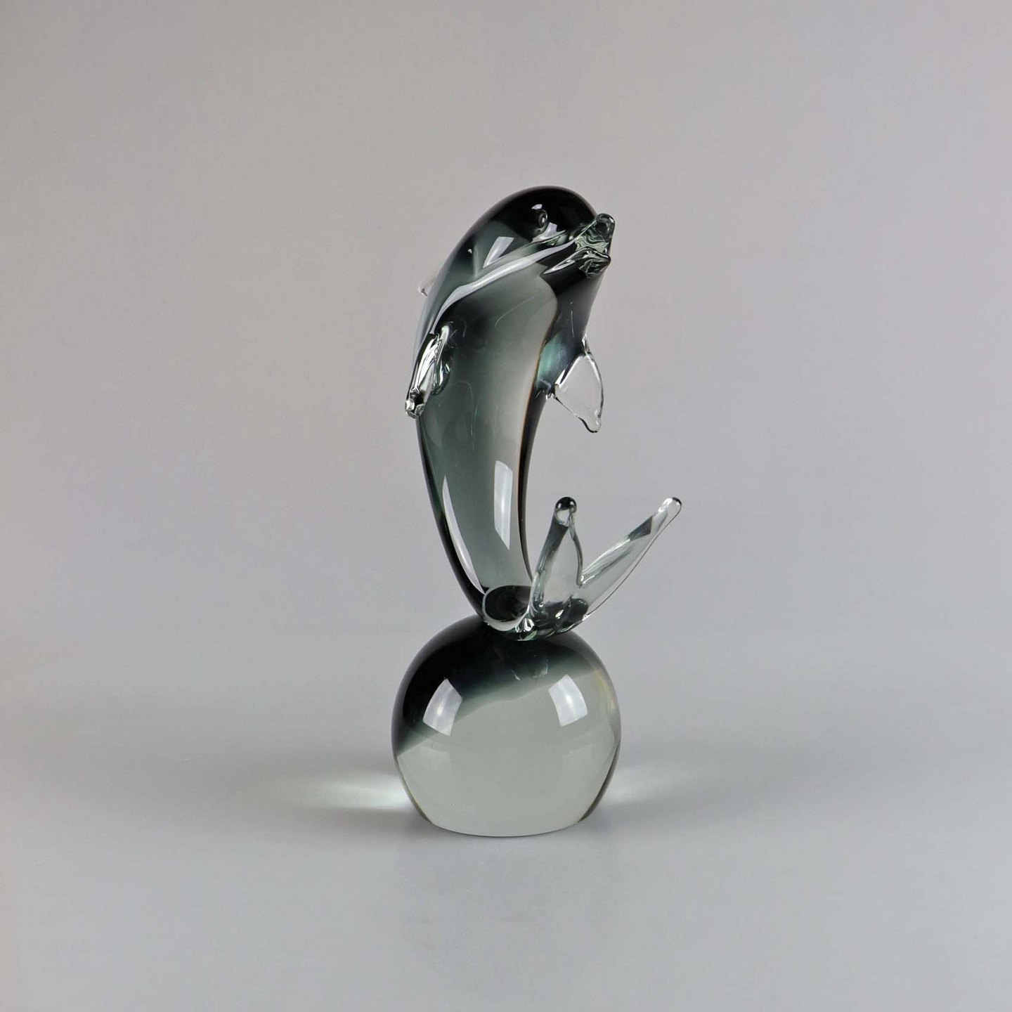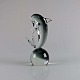 Figur af legende delfin på bold i klart og røgfarvet glas