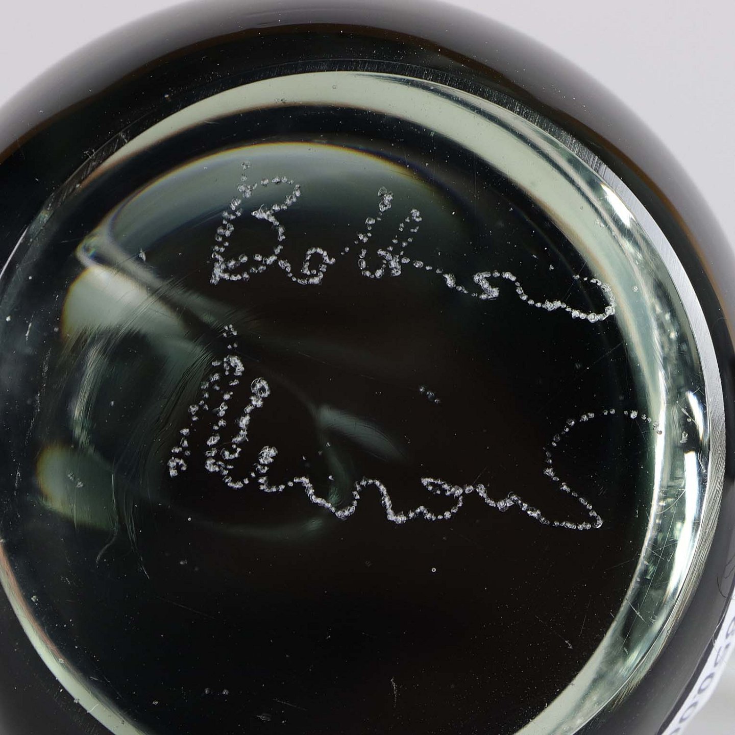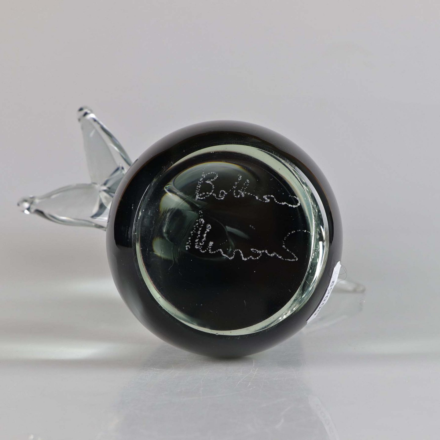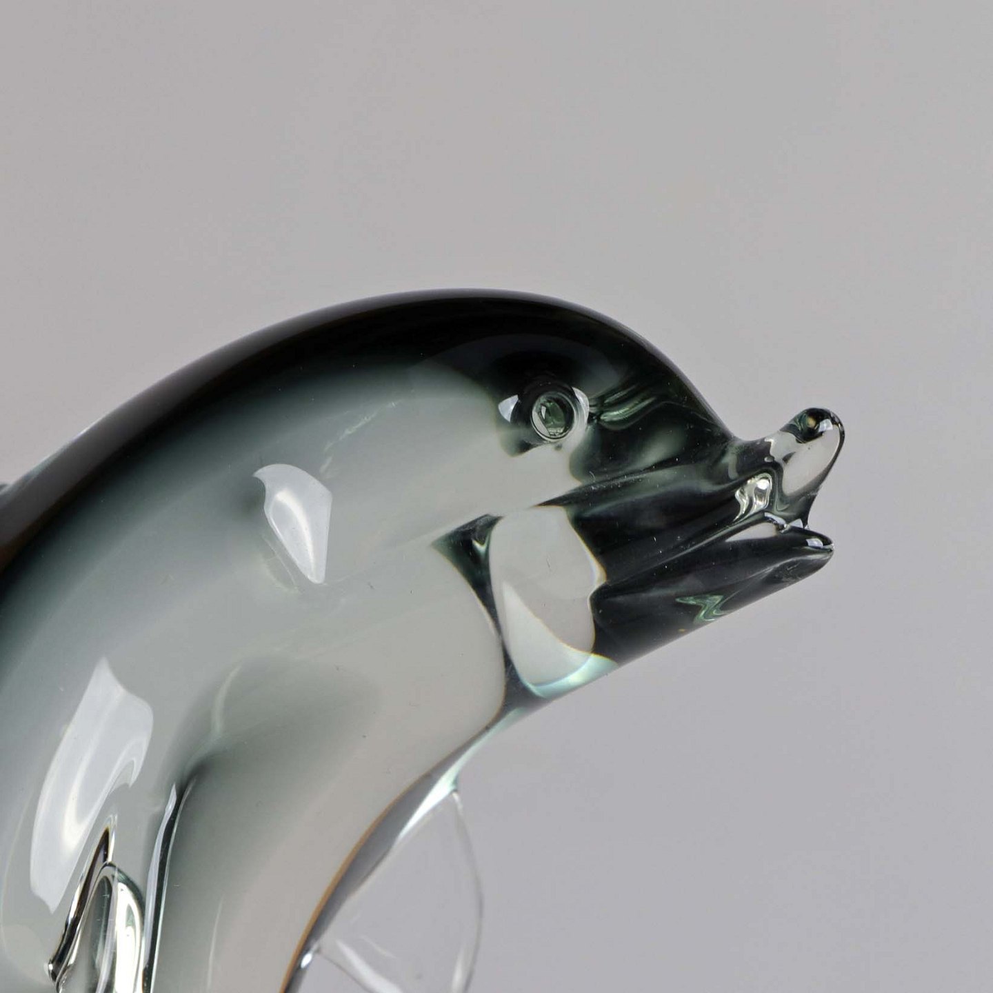 Figur af legende delfin på bold i klart og røgfarvet glas