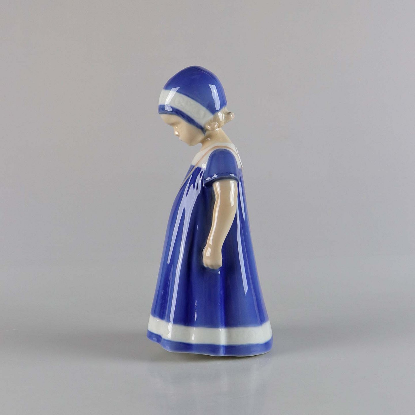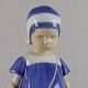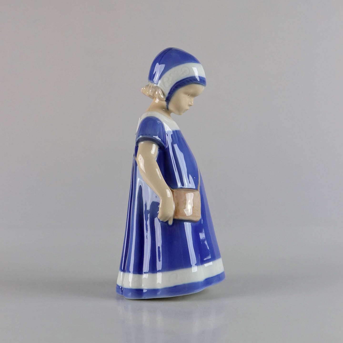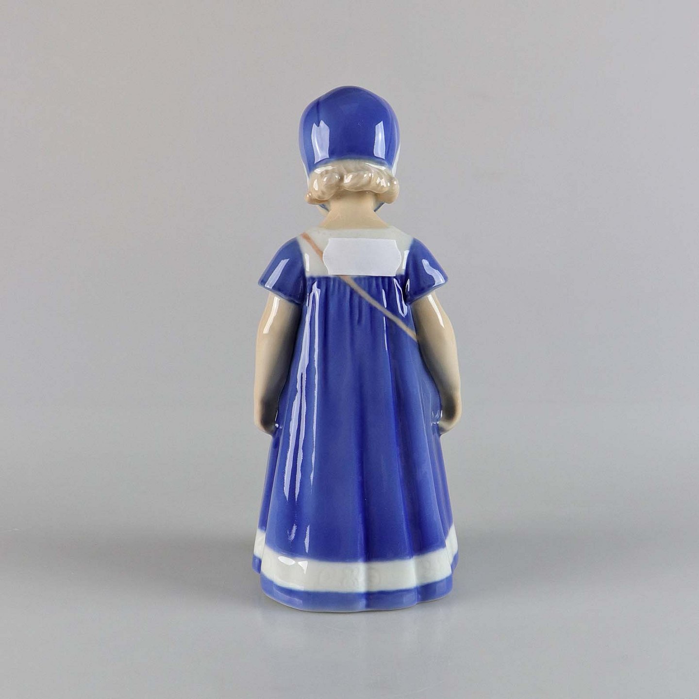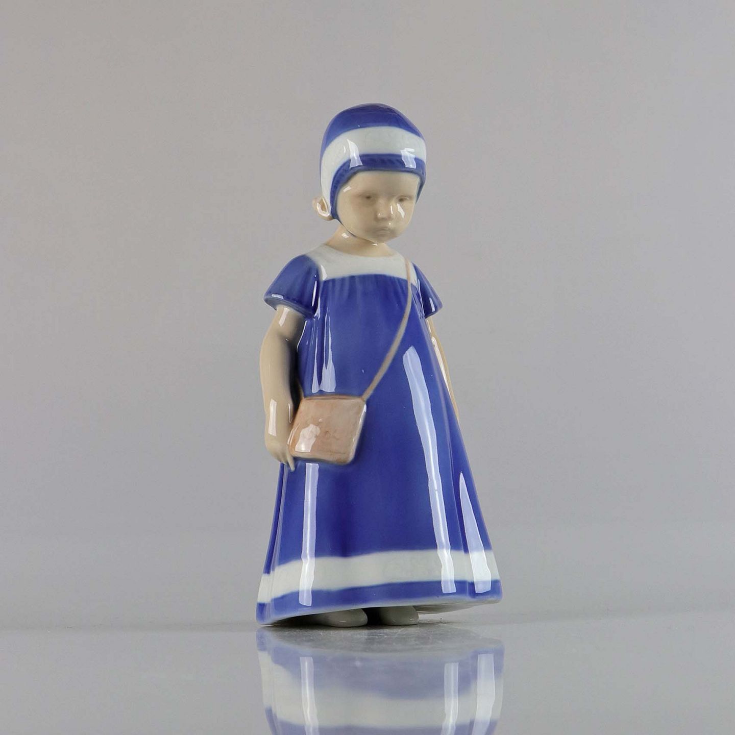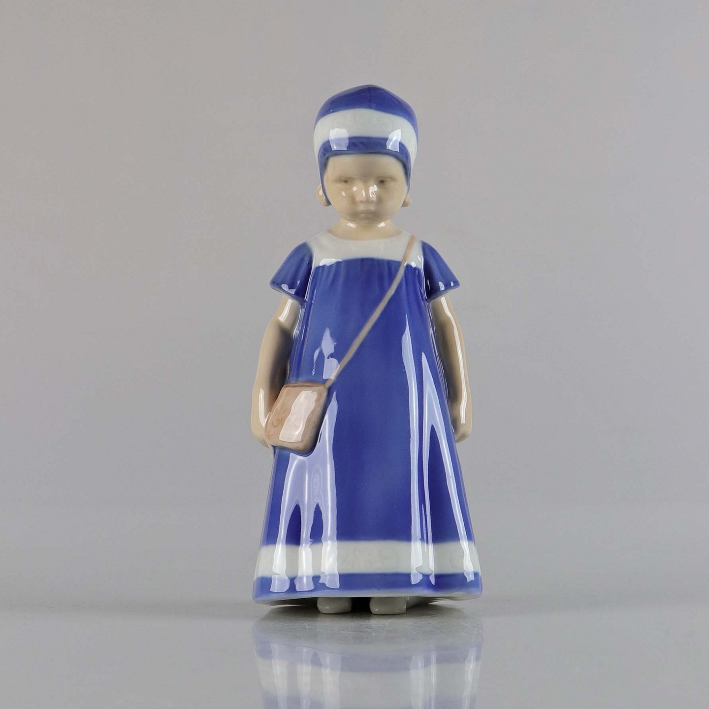 Figur af pige i blå kjole og blå kyse. Over skulderen bærer hun en taske