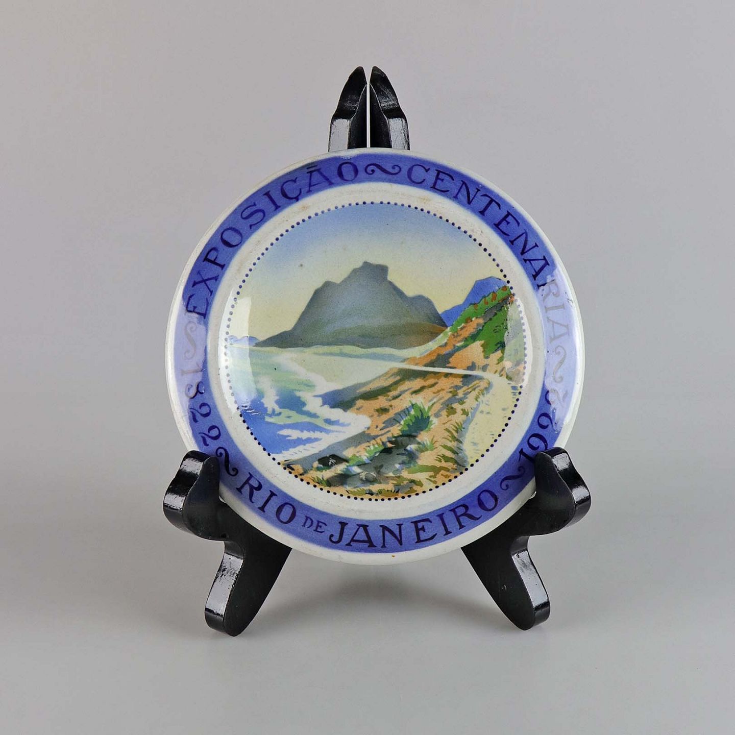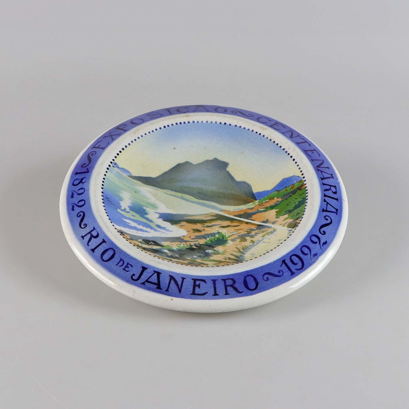 Askebæger i fajance med motiv af brasiliansk landskab og teksten Exposicao centenaria 1822-1922 Rio de Janeiro.