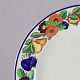 Tallerken i glat hvidt porcelæn med blå kant og dekoreret med sommerblomster og frugter.