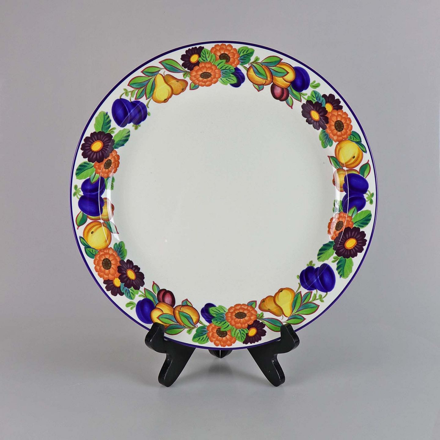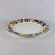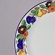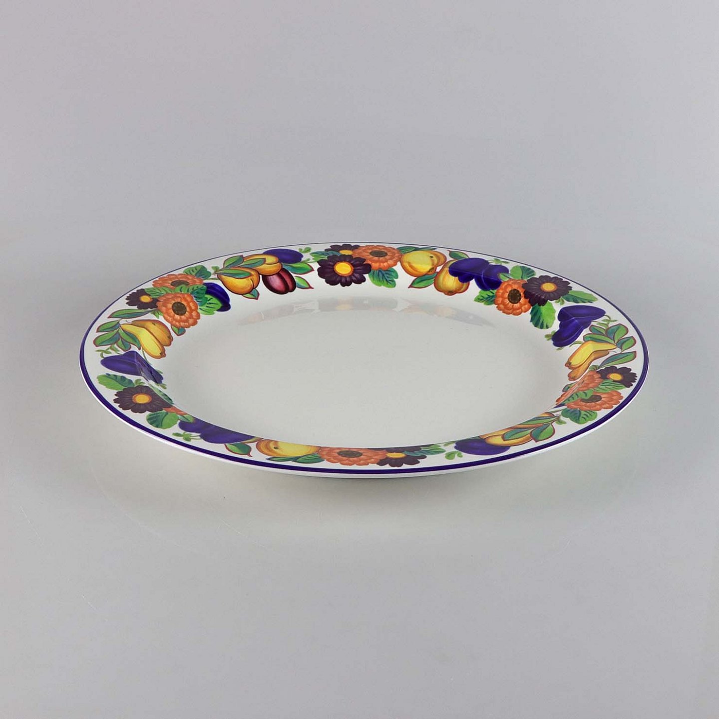 Serveringsfad i glat hvidt porcelæn med blå kant og dekoreret med sommerblomster og frugter.