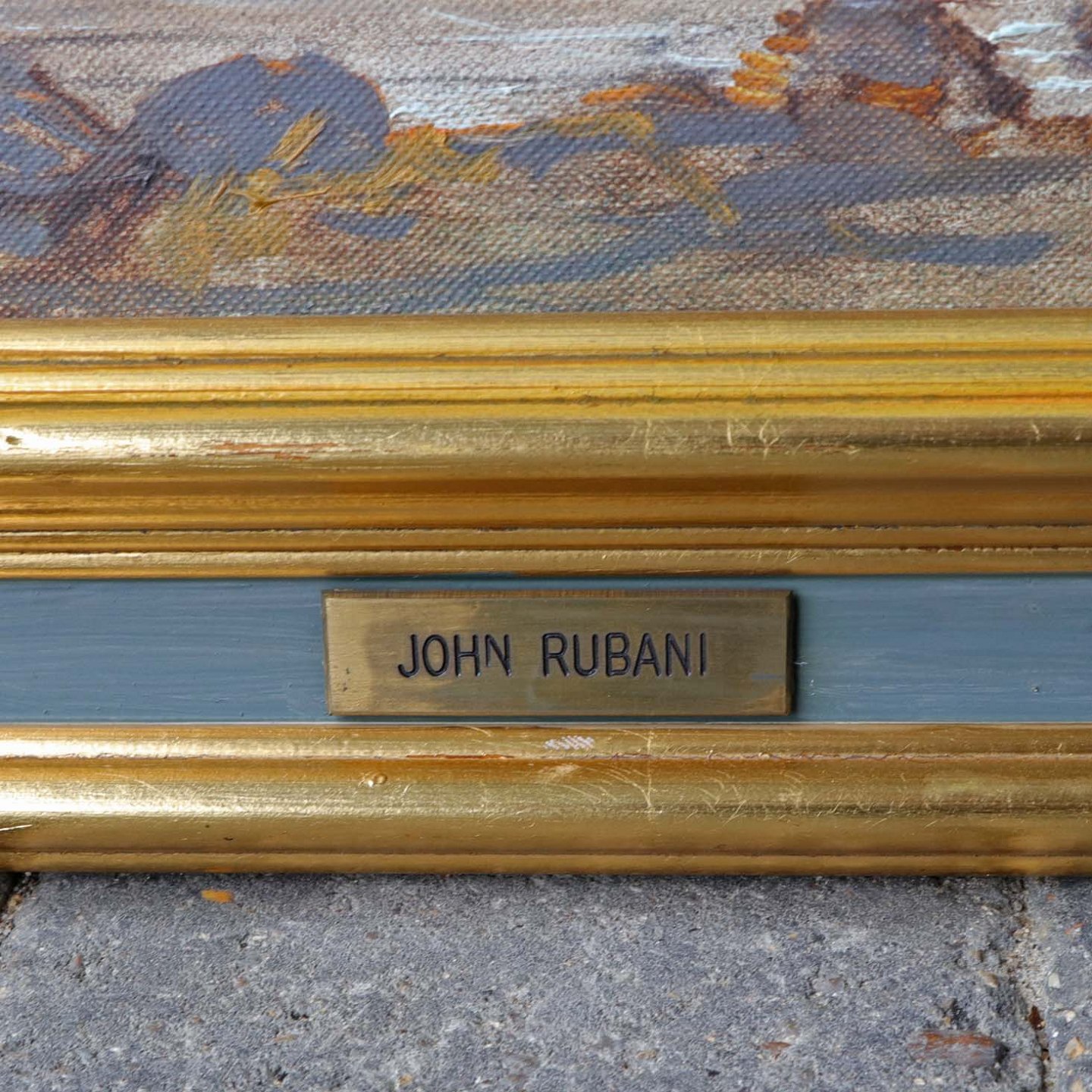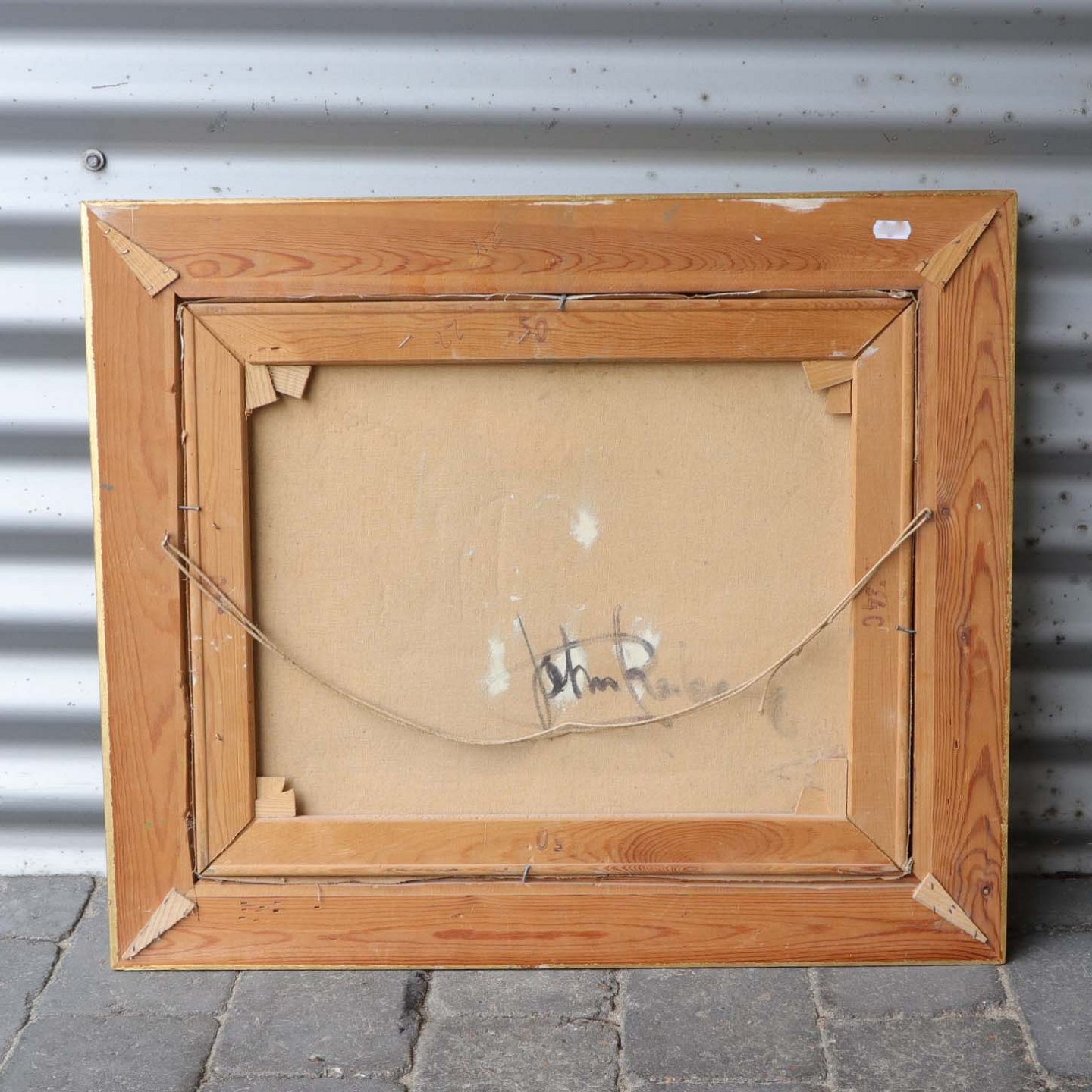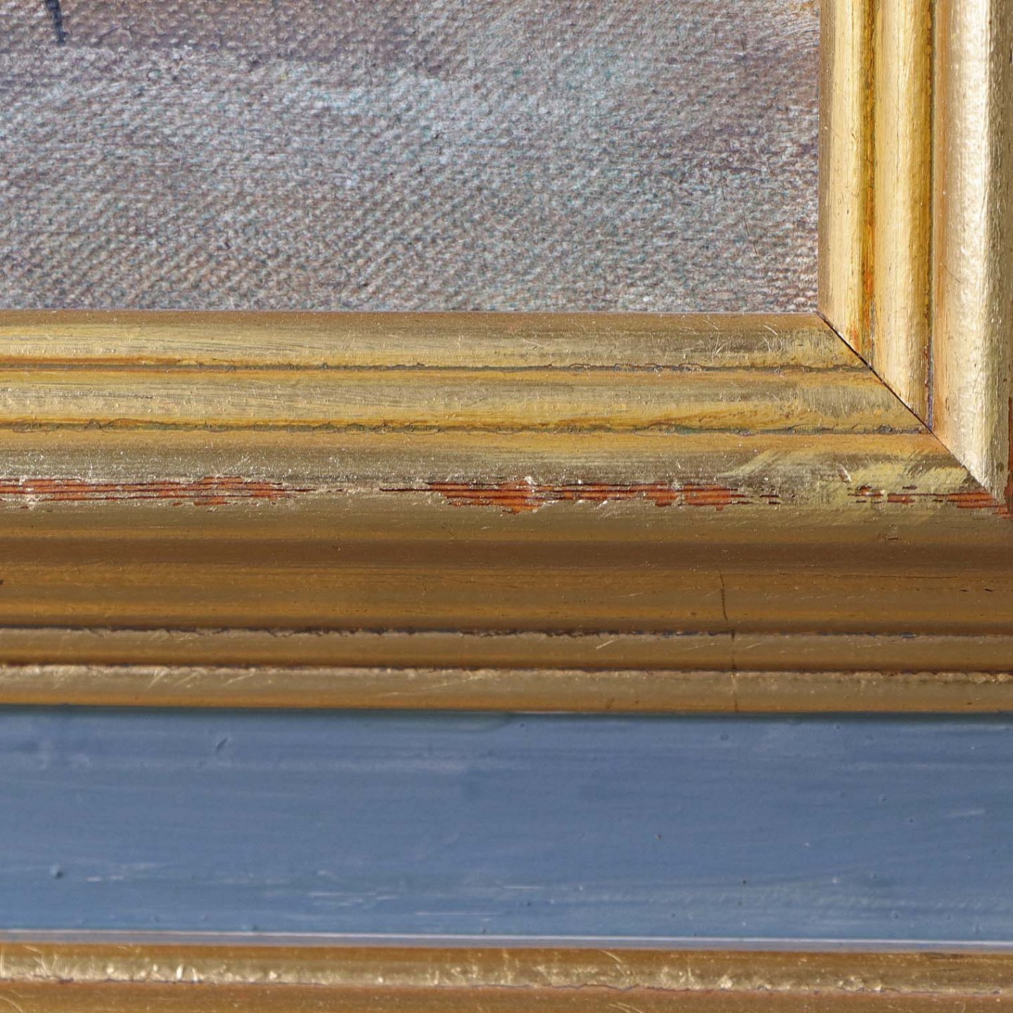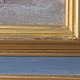 Maleri med landskabsmotiv af kyststrækning med robåd