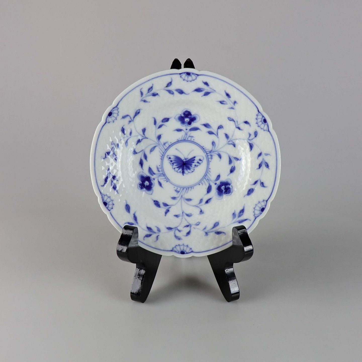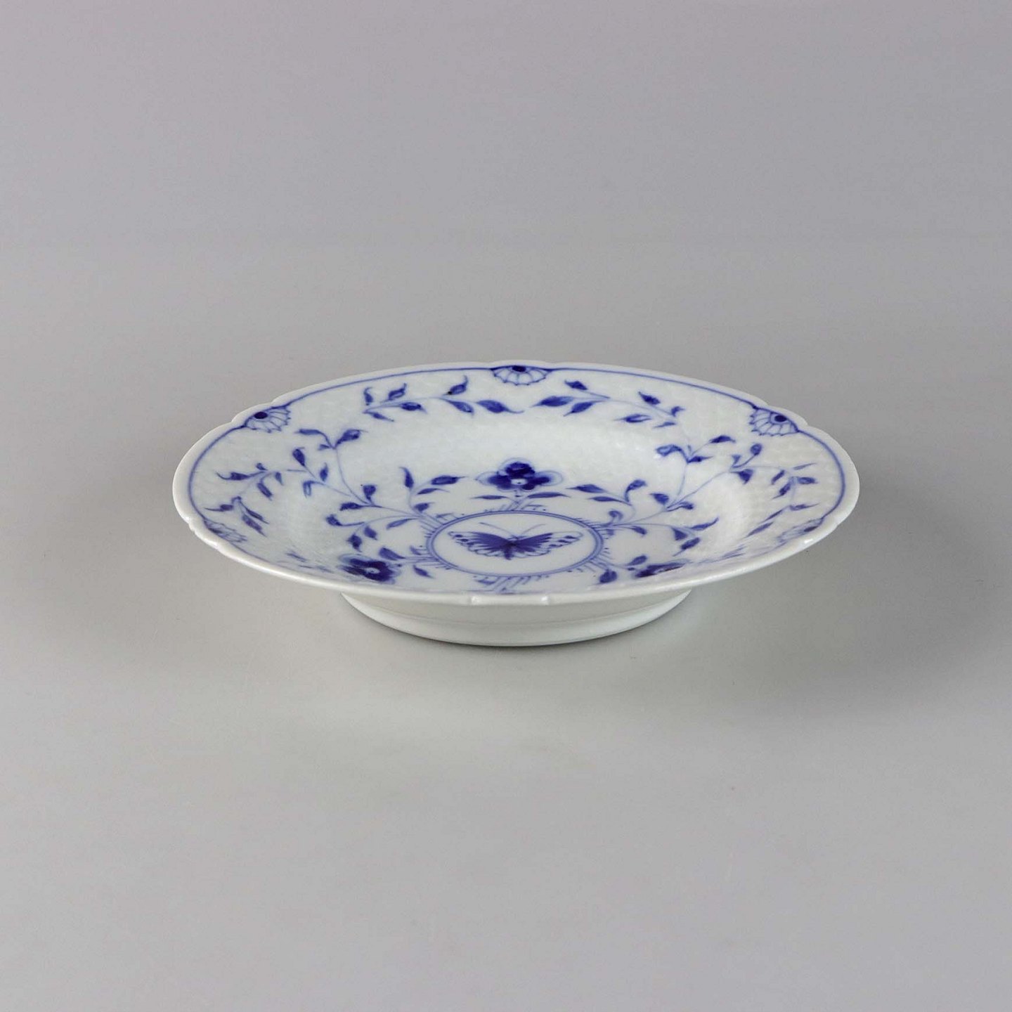 Tallerken i hvidt skælformet porcelæn med blå motiver af blomster og sommerfugle.