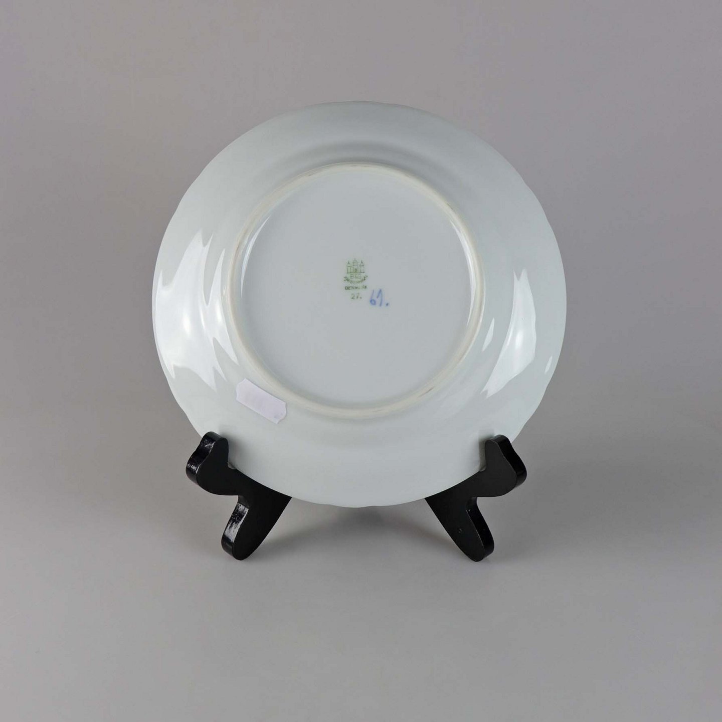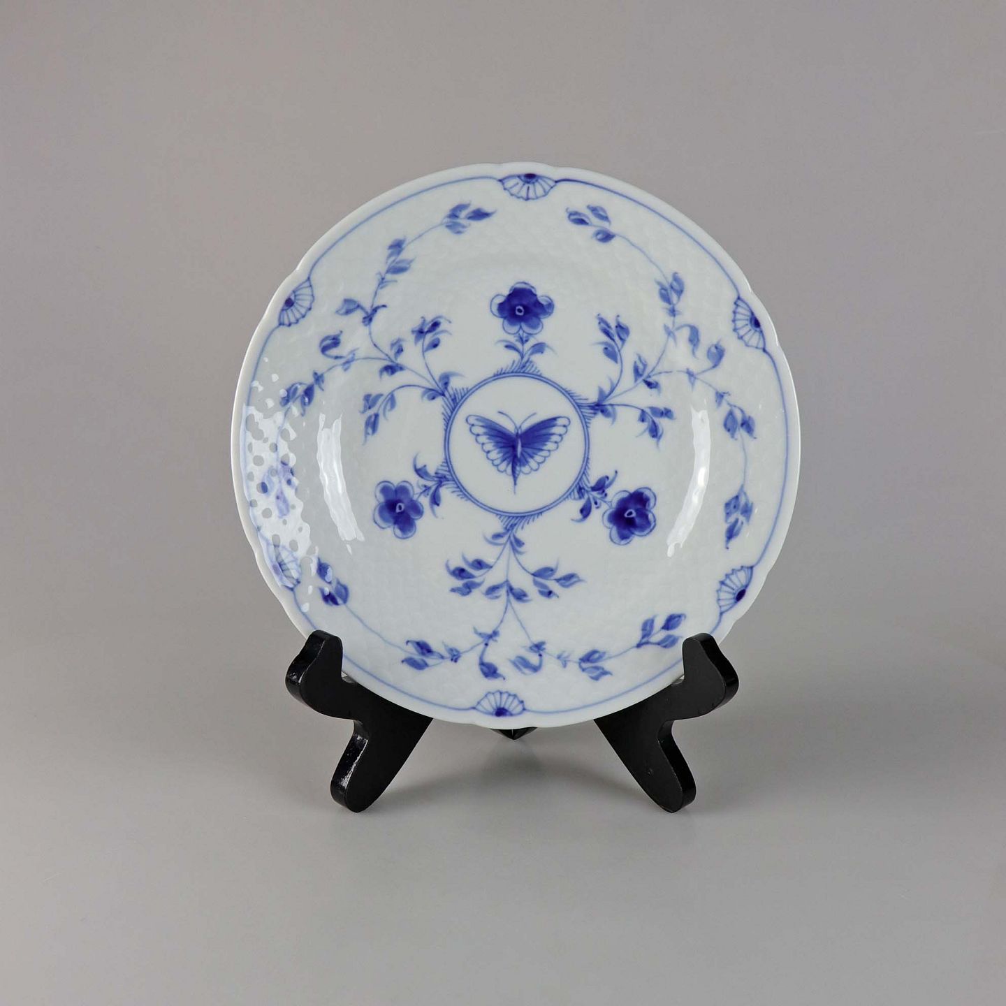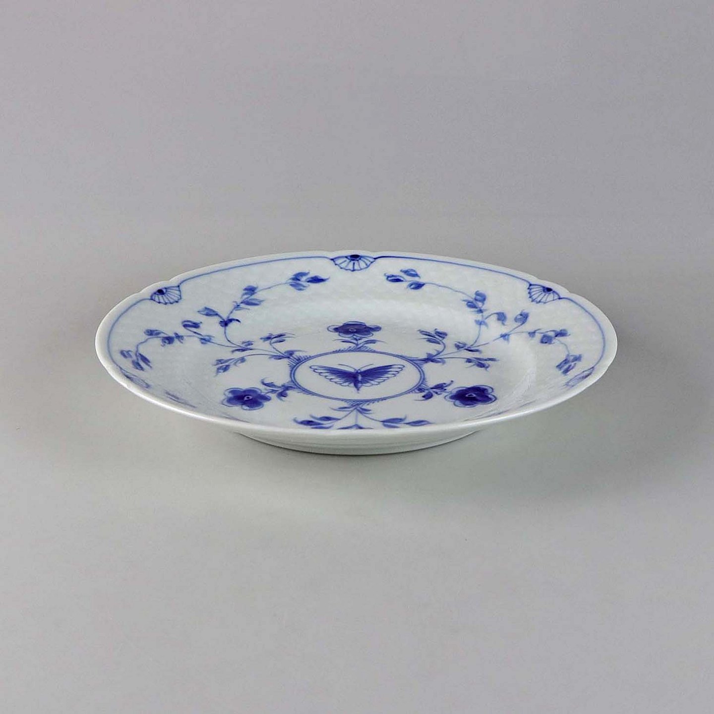 Service i hvidt skælformet porcelæn med blå motiver af blomster og sommerfugle.