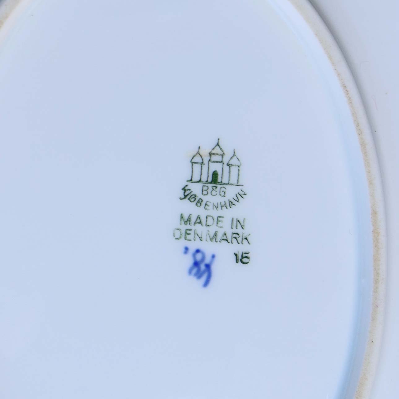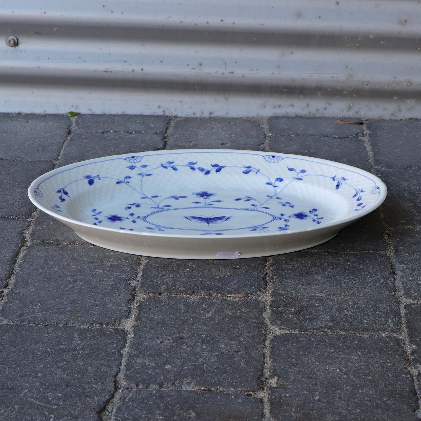 Service i hvidt skælformet porcelæn med blå motiver af blomster og sommerfugle.
