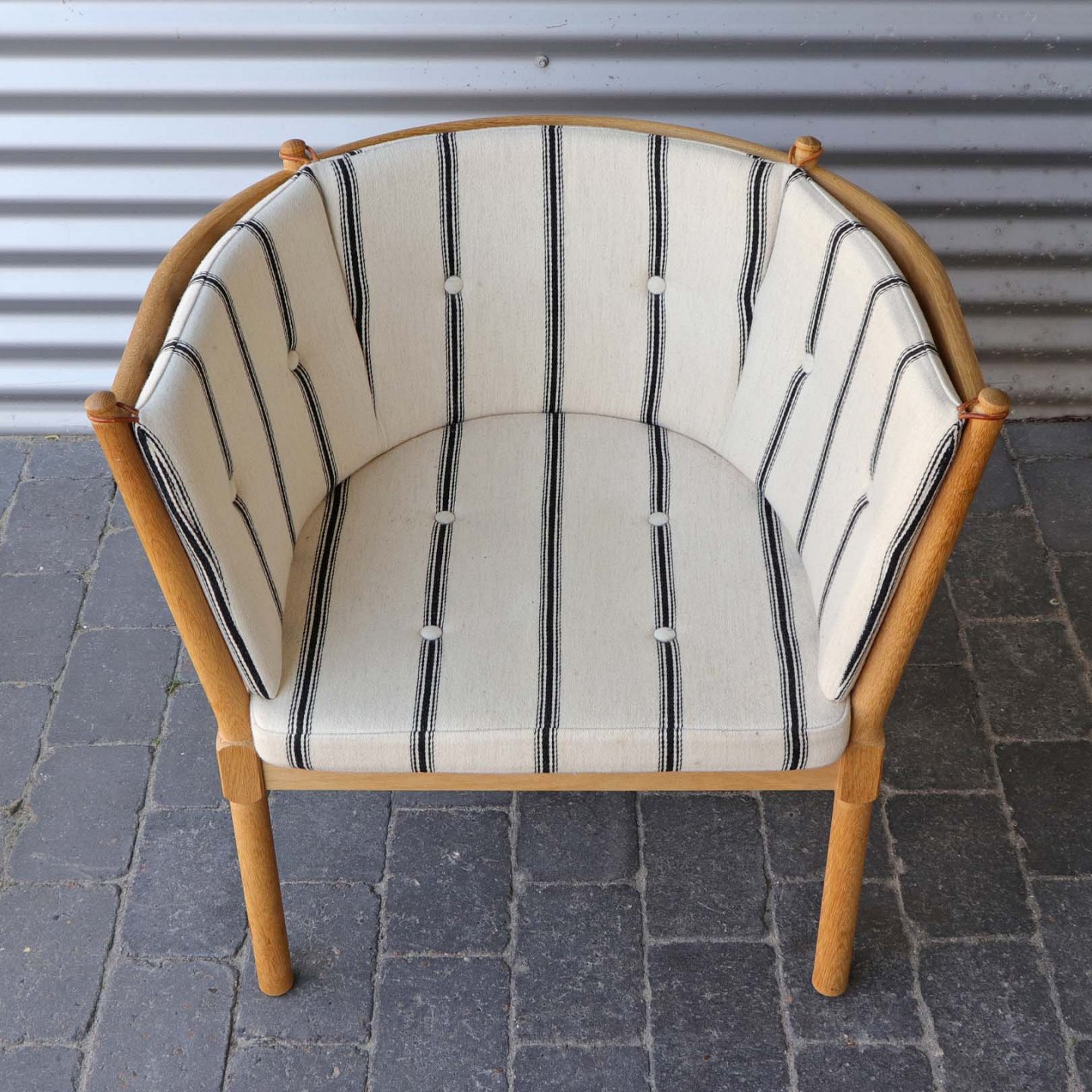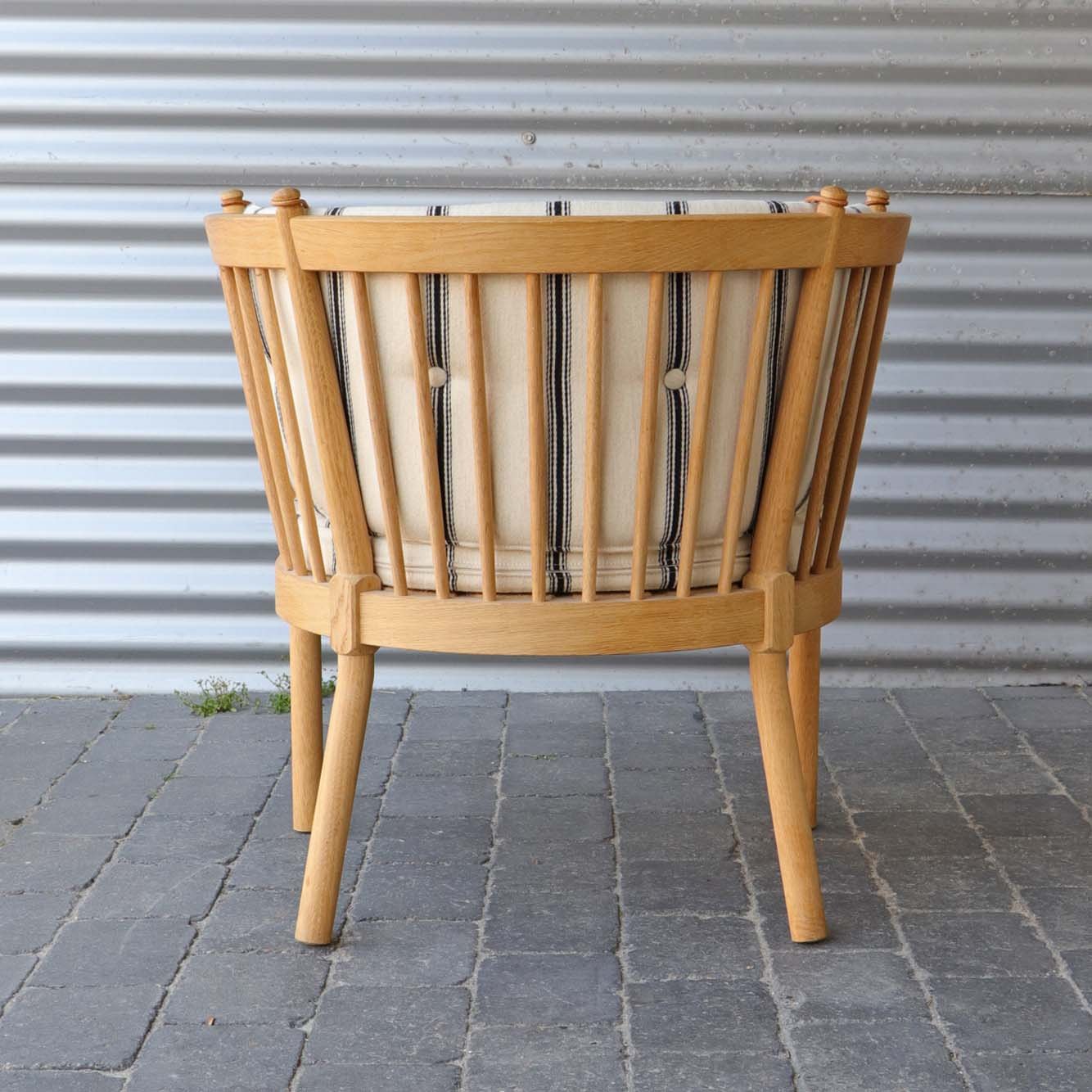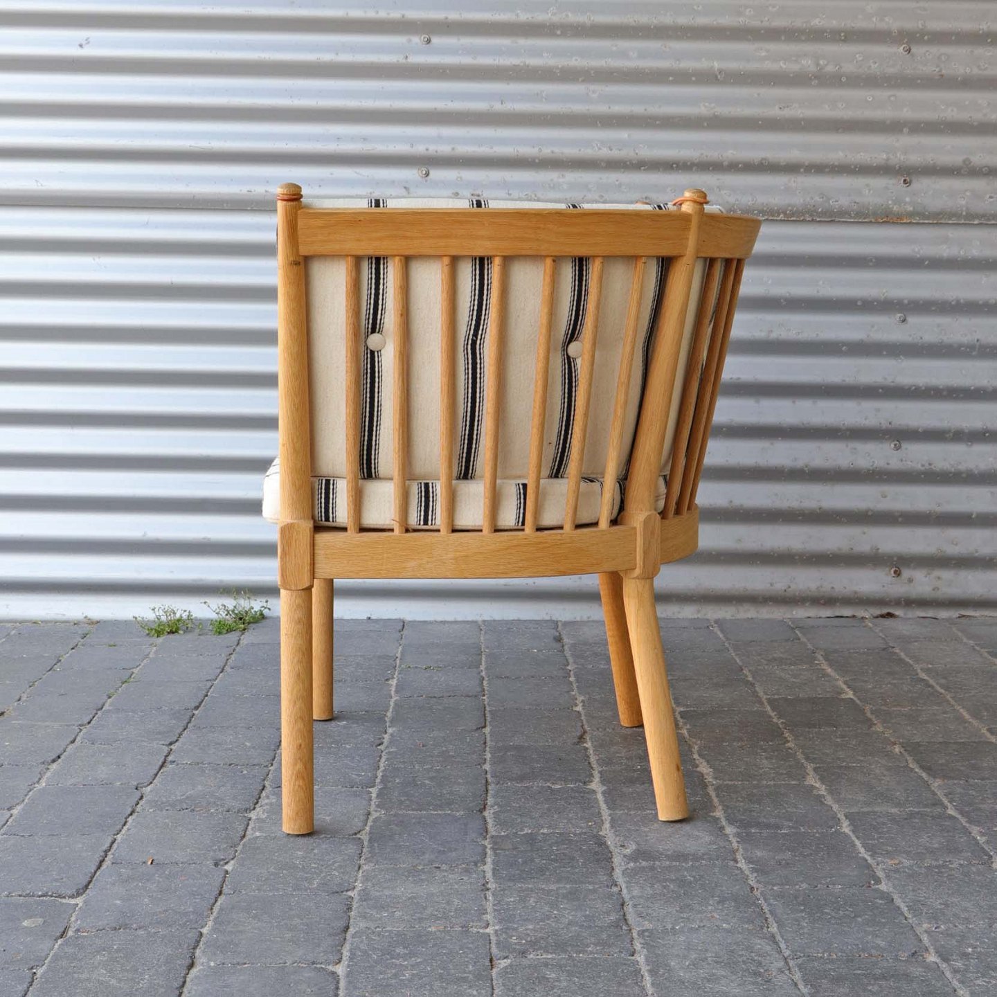Dansk design tremmestol udført i massivt bøg. Dertilhørende hynder i lyst meleret savak uld med sorte striber. No 1790 4389