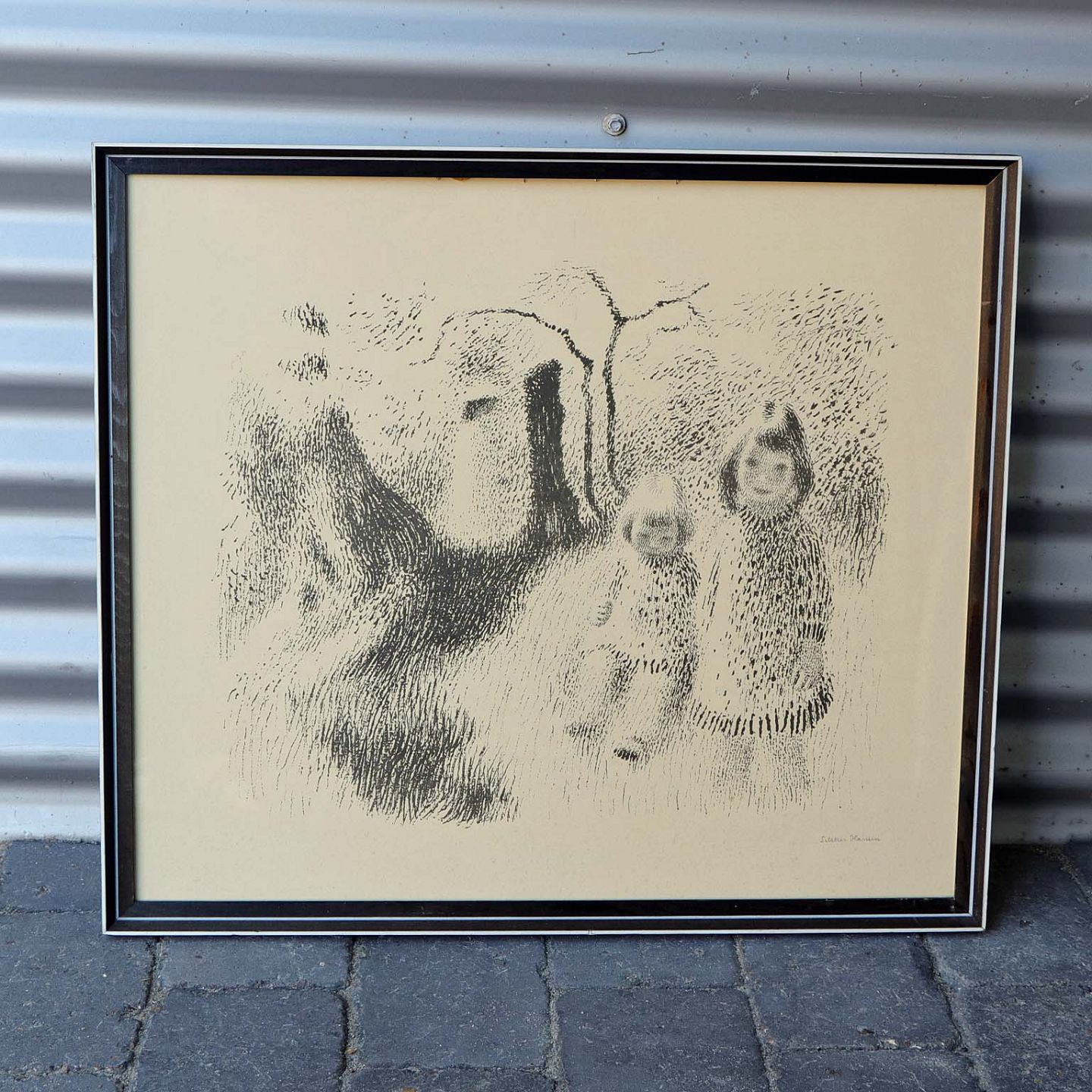 Grafisk tryk med motiv af to børn i skoven.