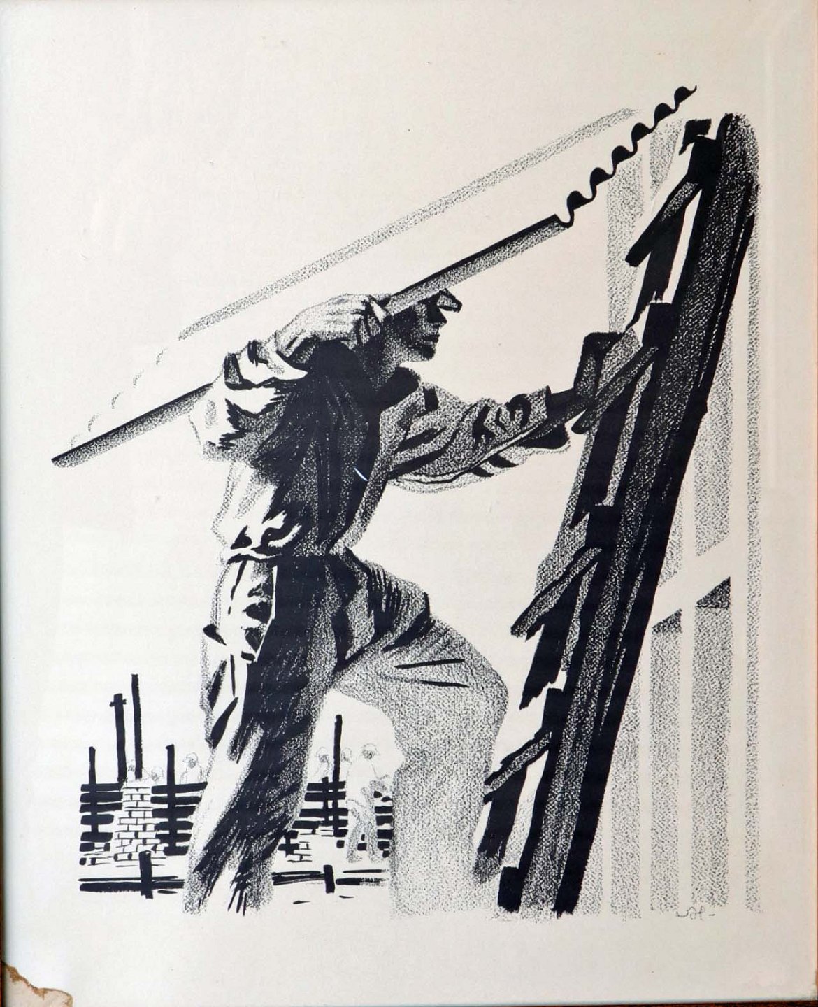 Bagpå sidder et skilt med teksten " Med venlig hilsen, DANSK ETERNIT FABRIK A/S, AALBORG"