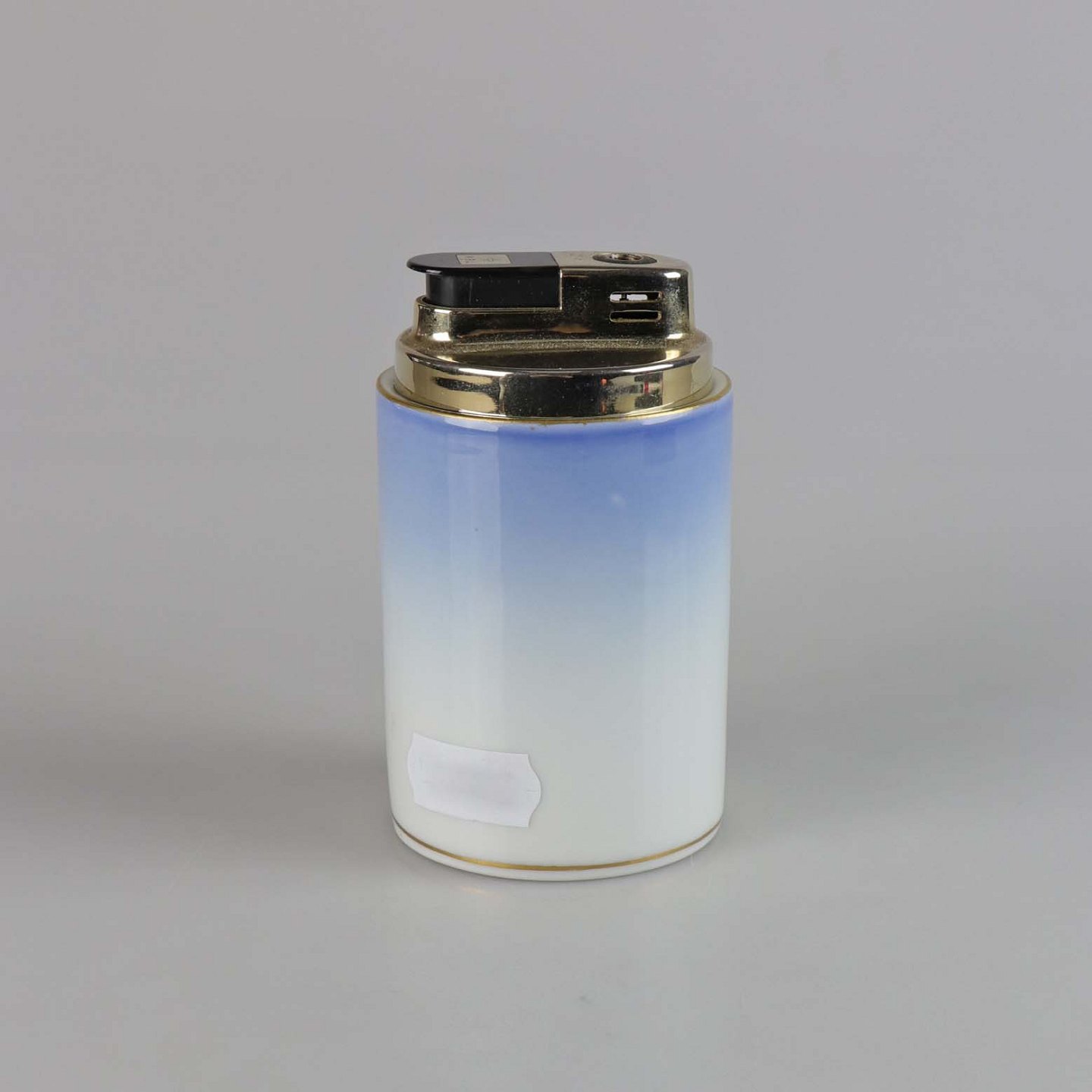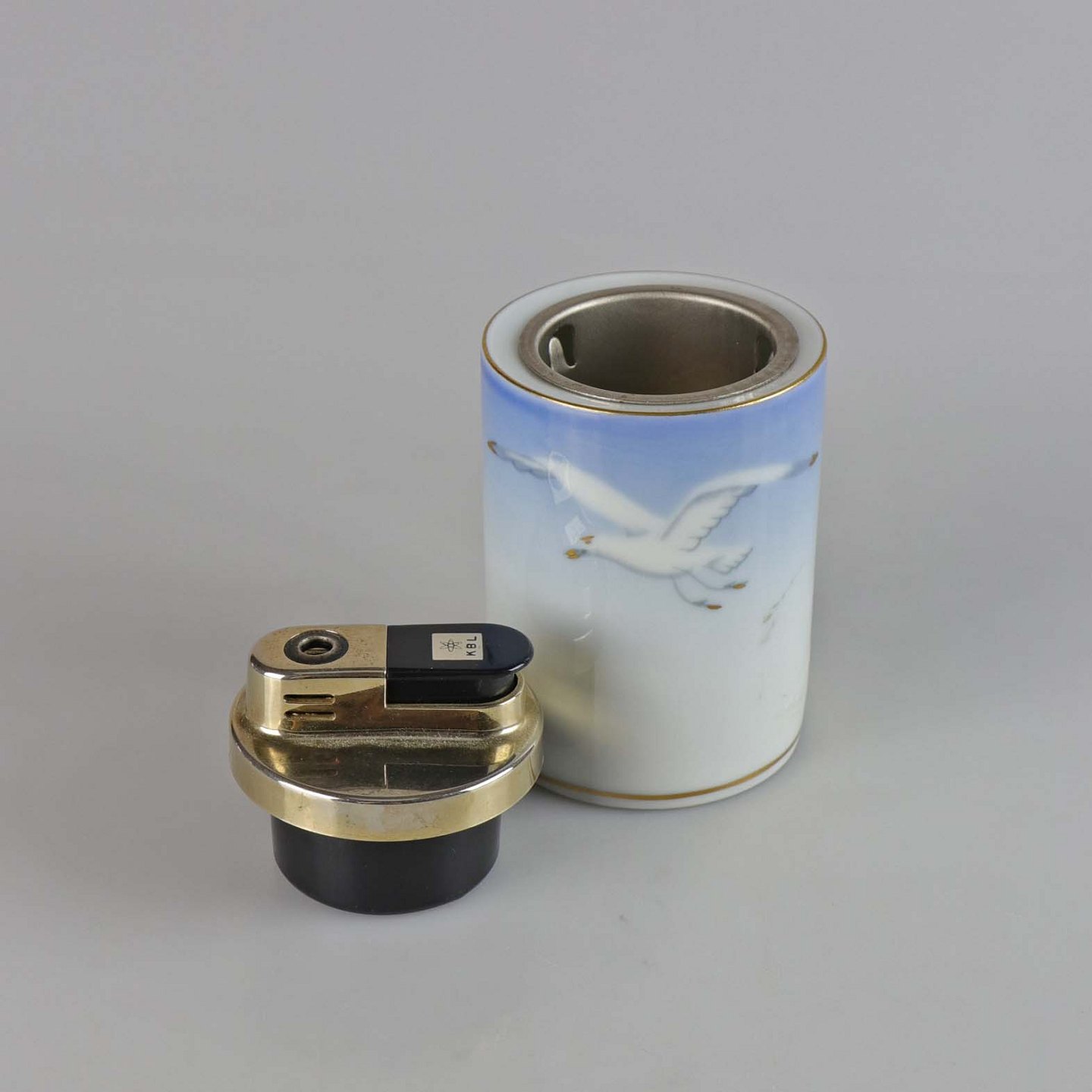 Lighter med porcelæn i blålige farver dekoreret med måger og guldkant