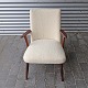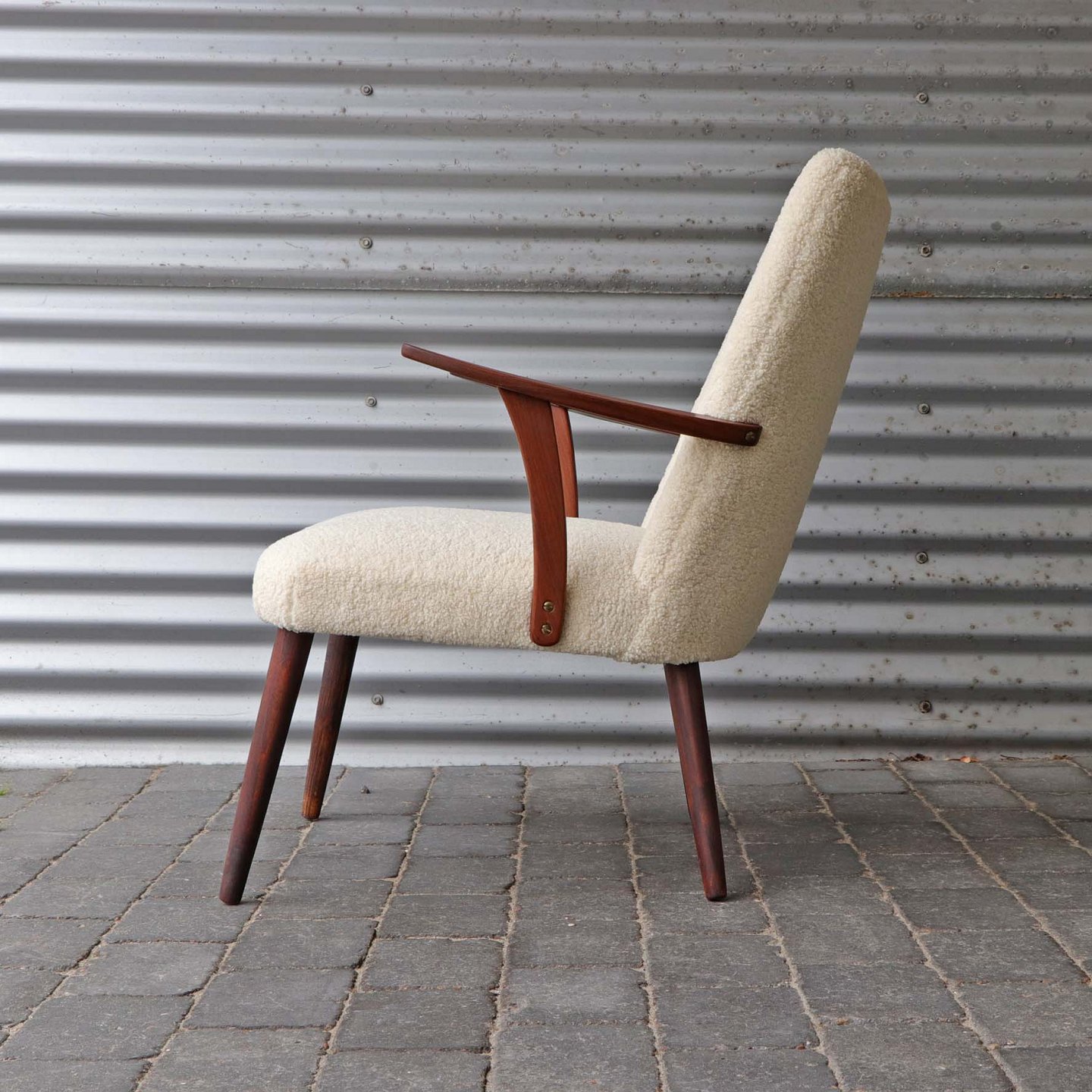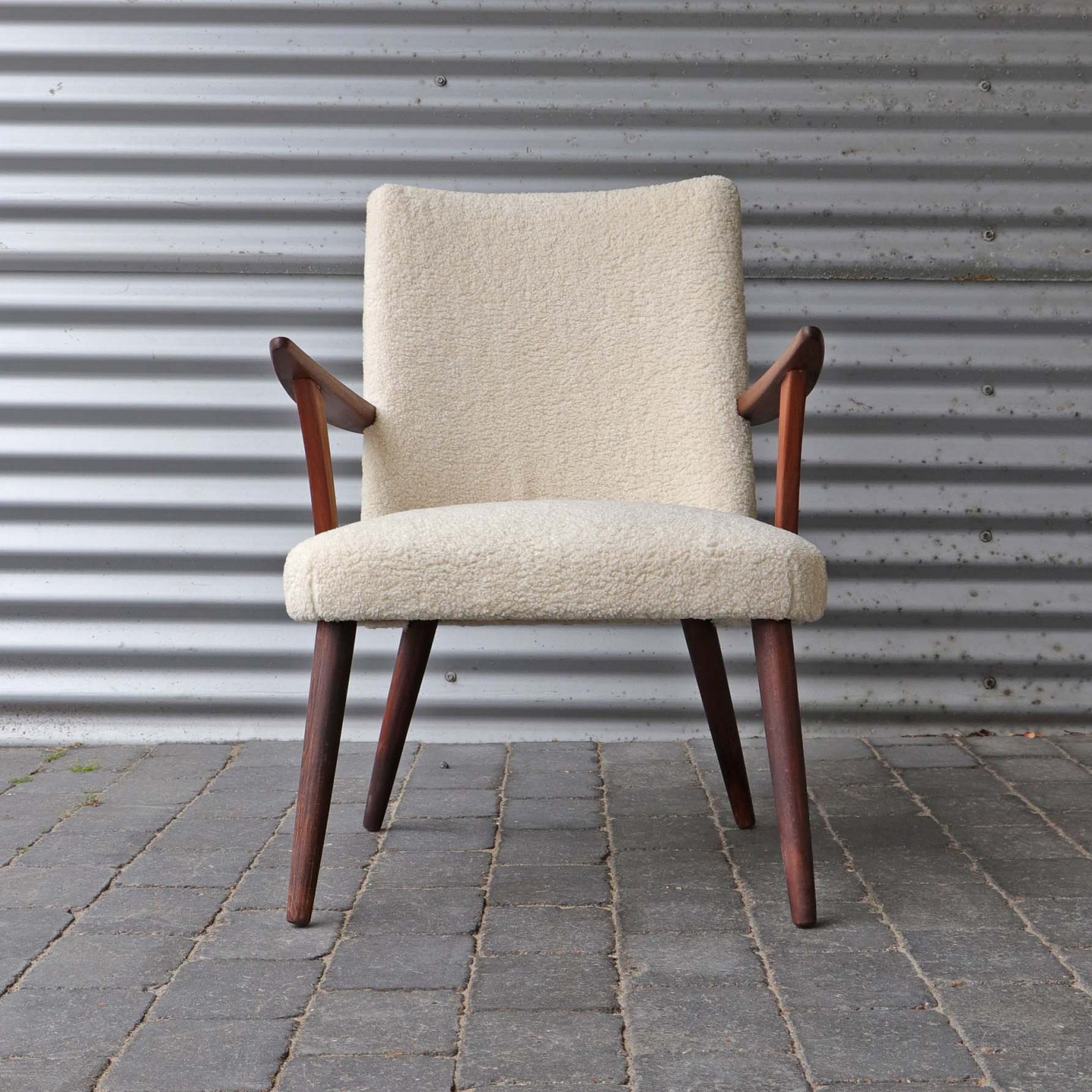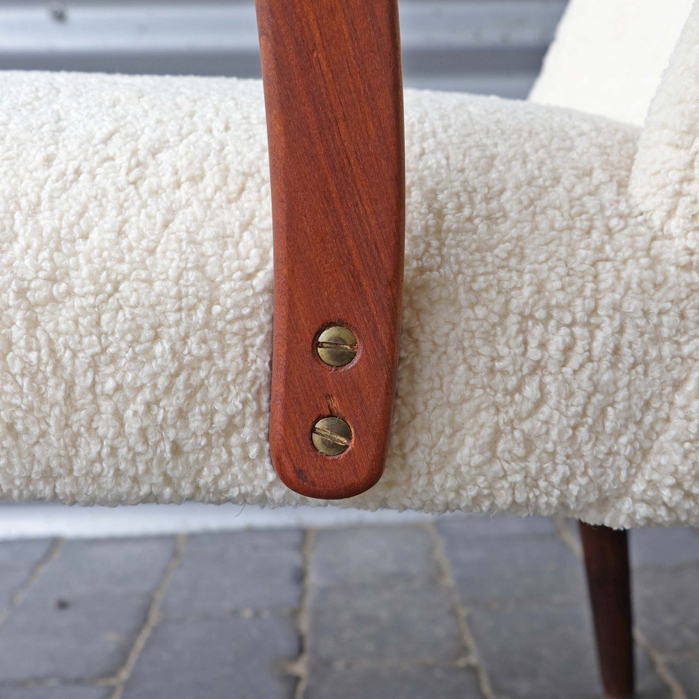 Lænestol i teak betrukket med imiteret hvidt uld. Ny polstret