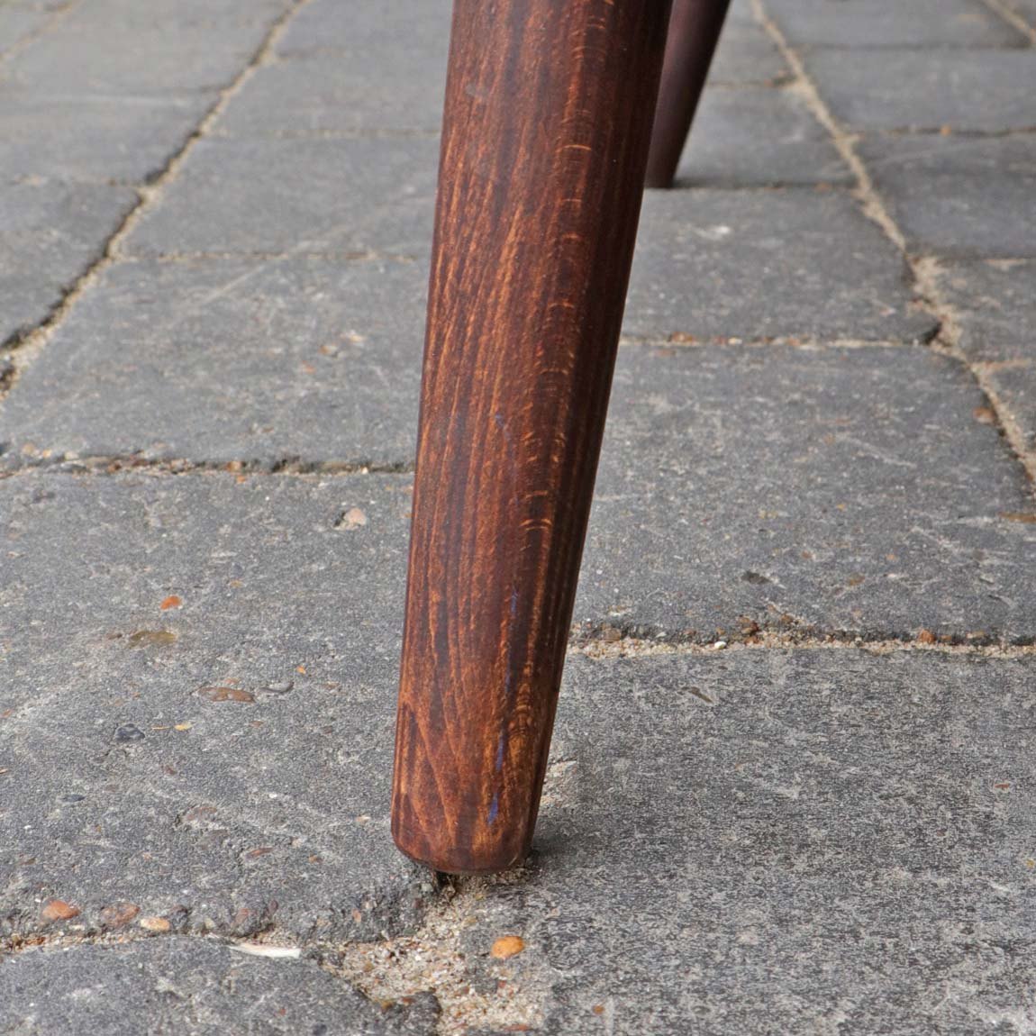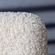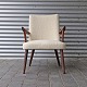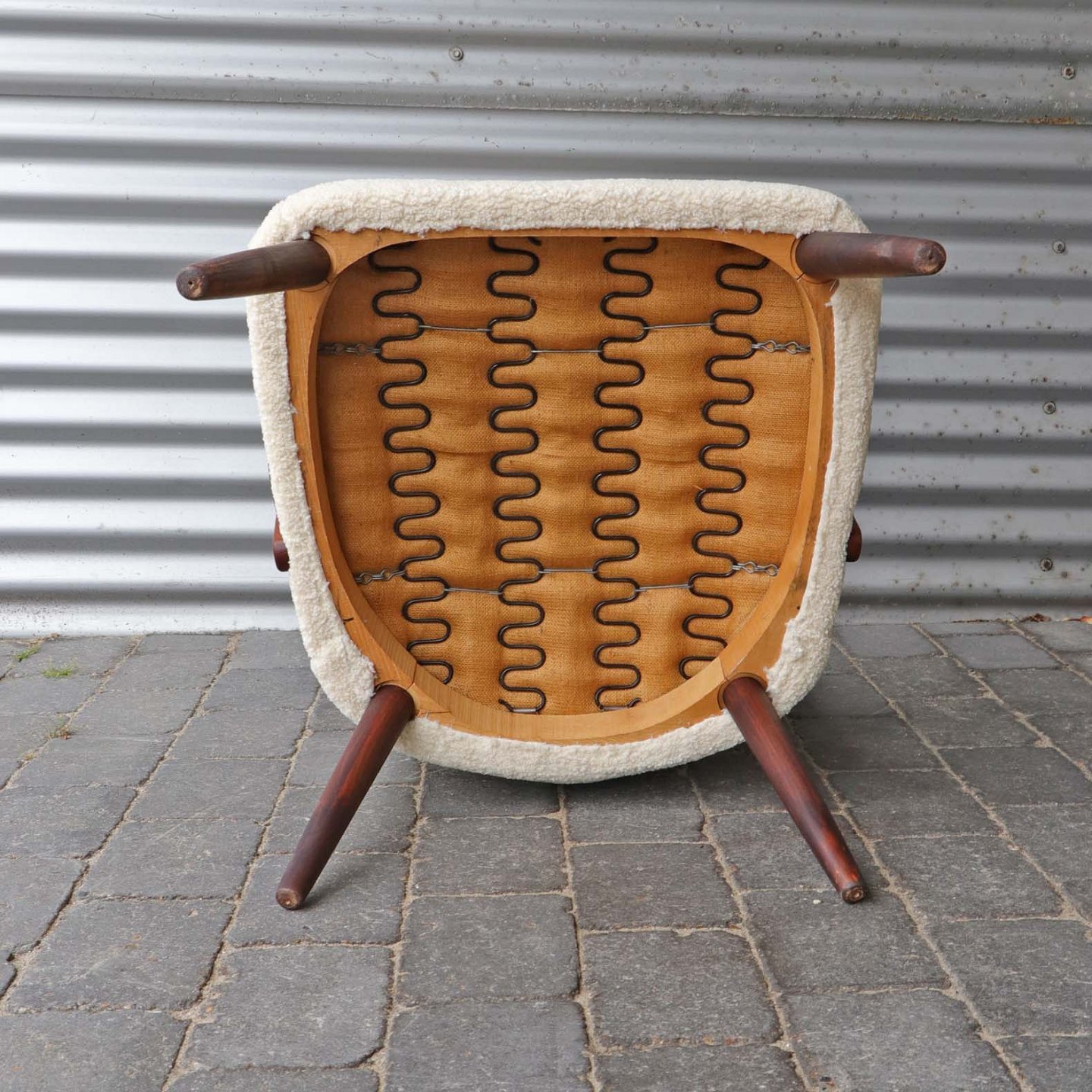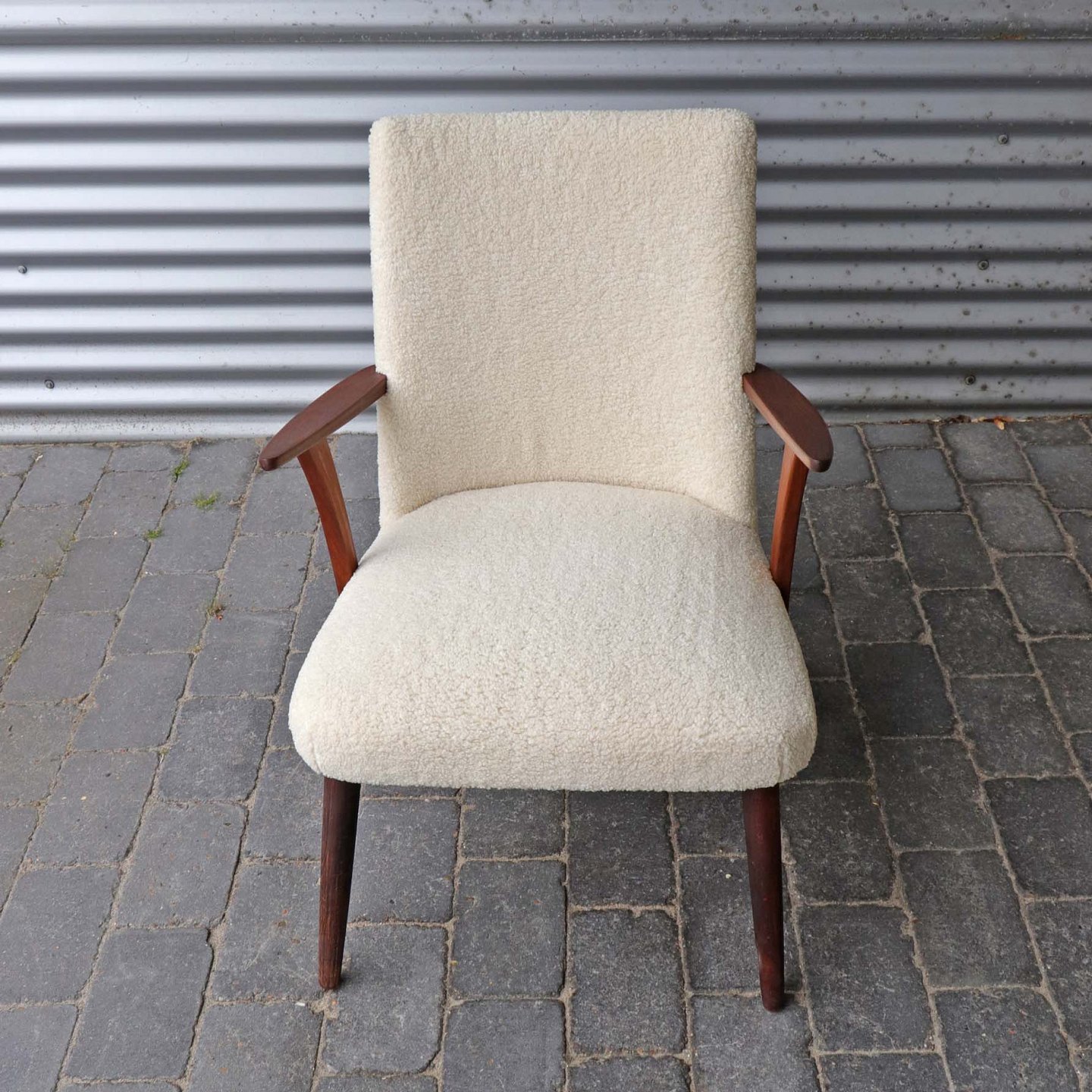 Lænestol i teak betrukket med imiteret hvidt uld. Ny polstret