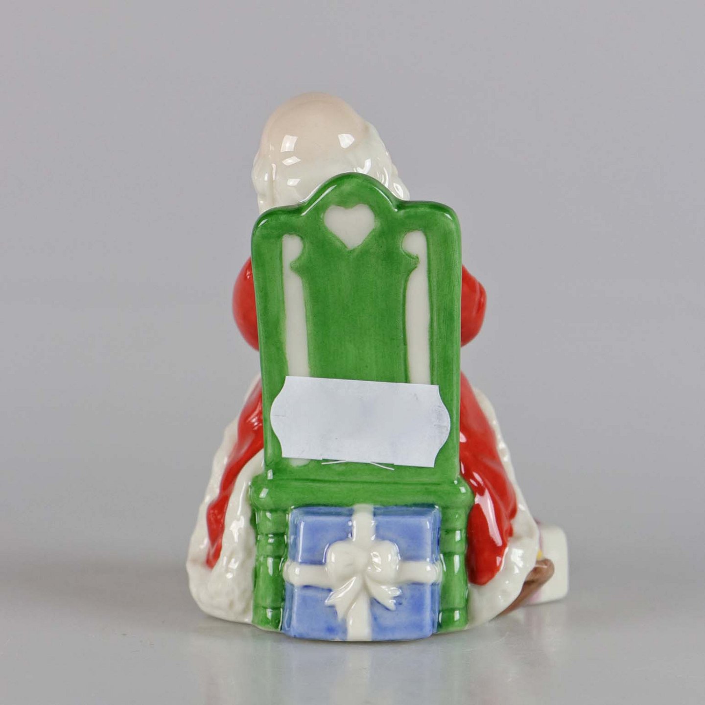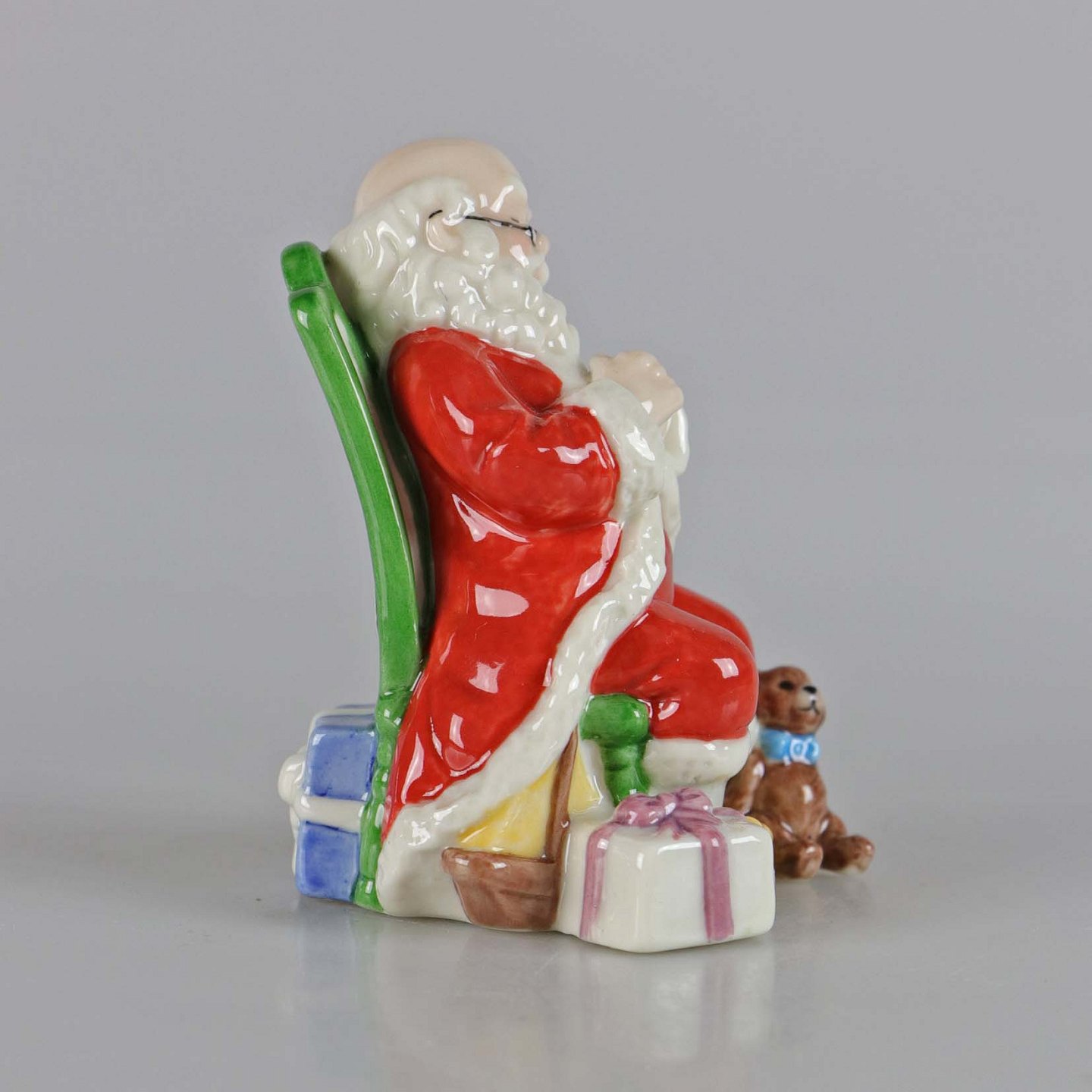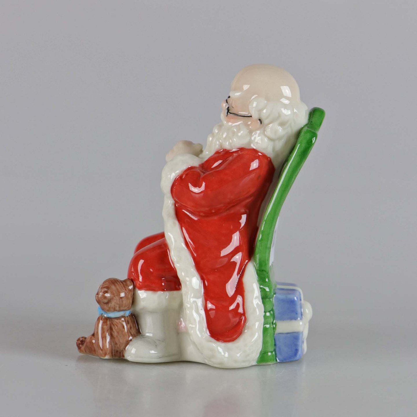 Årets Julemand i porcelæn År 2007. Julemanden med briller sidder på grøn stol