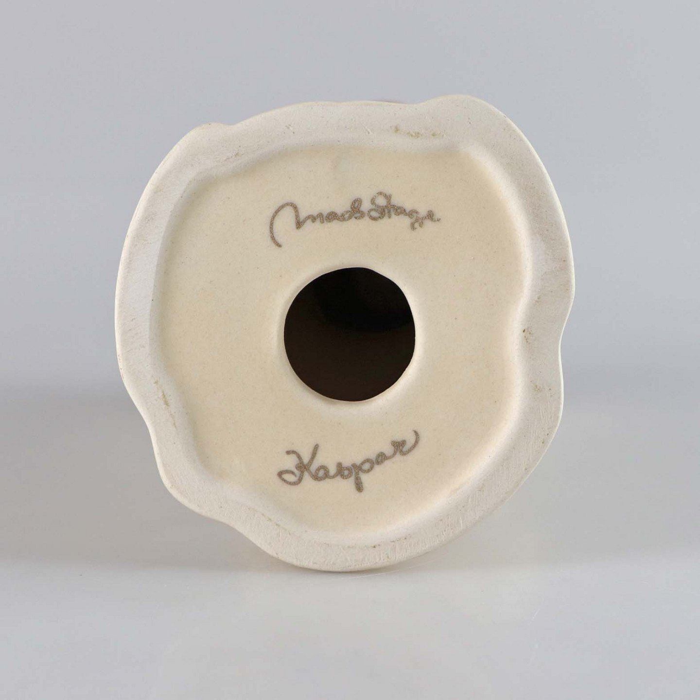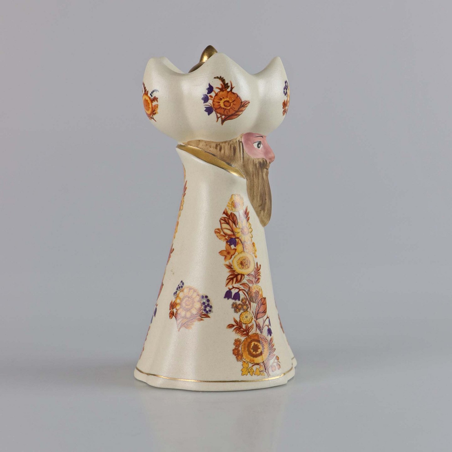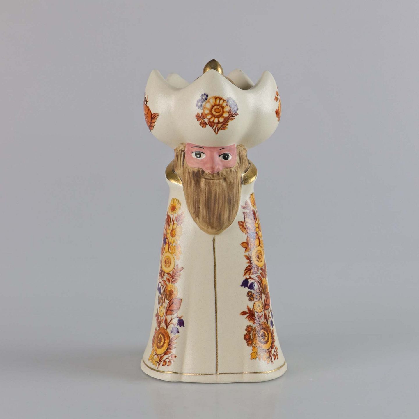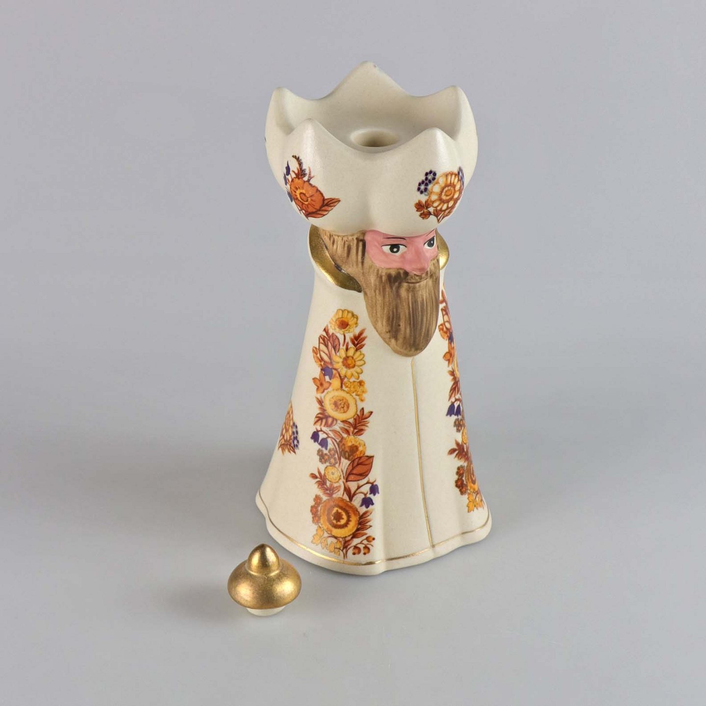 Figur i porcelæn. Kaspar fra De tre vise mænd. Når guldknoppen tages af, er der hul til et kerte lys