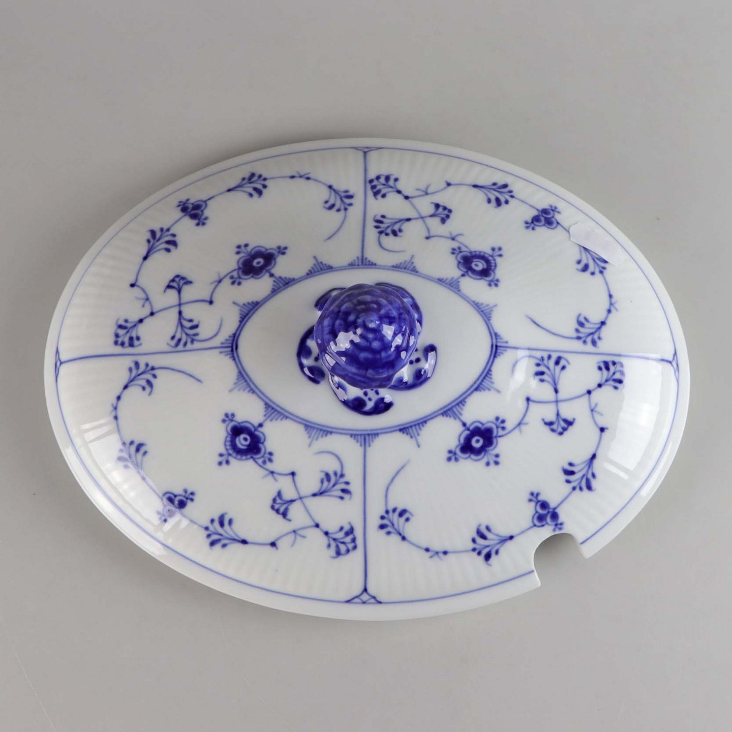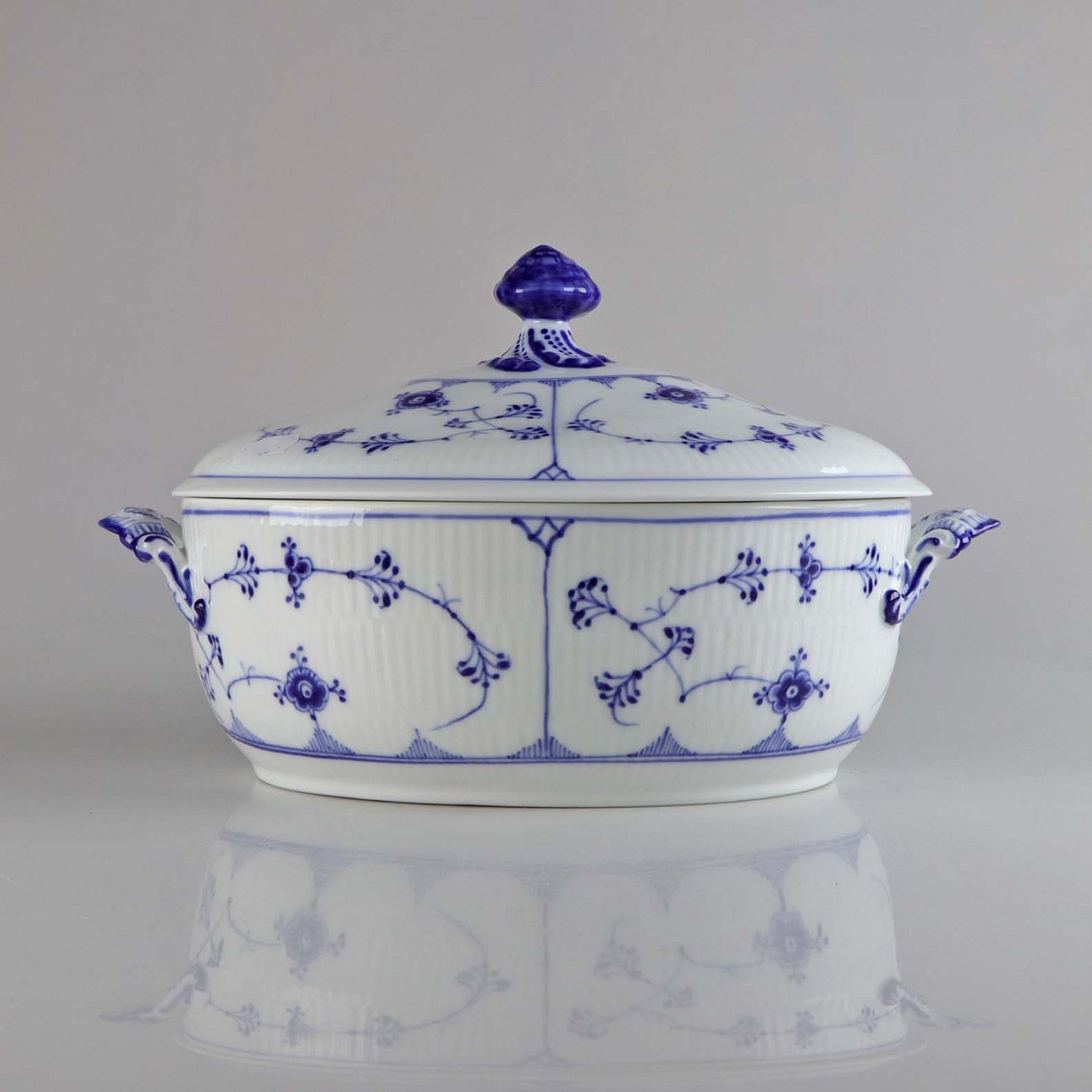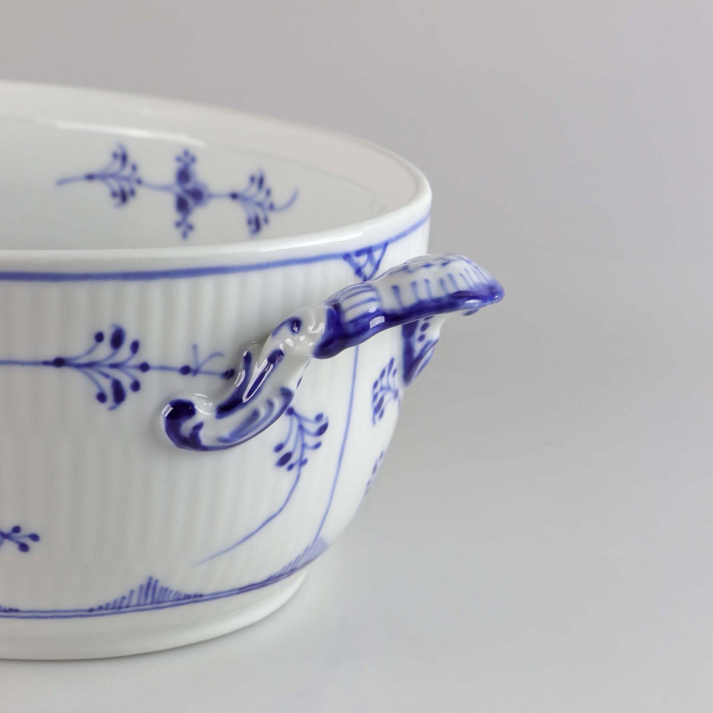 Suppeterrin i riflet hvidt porcelæn med dekoration af blå ranker