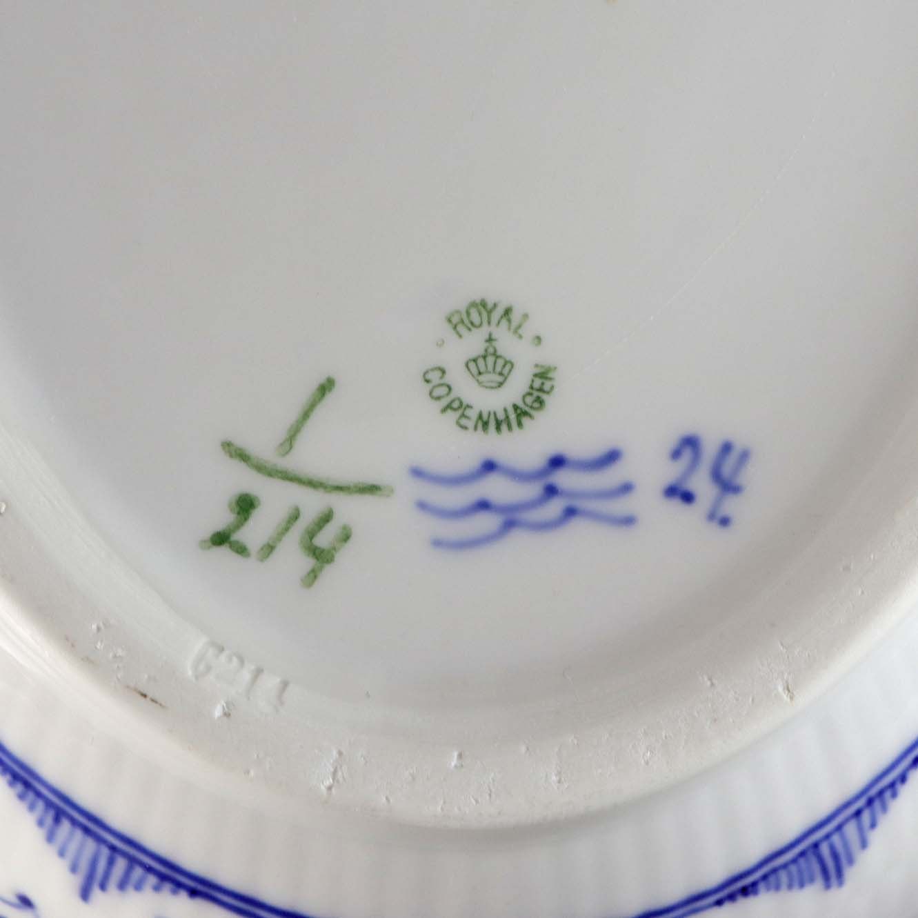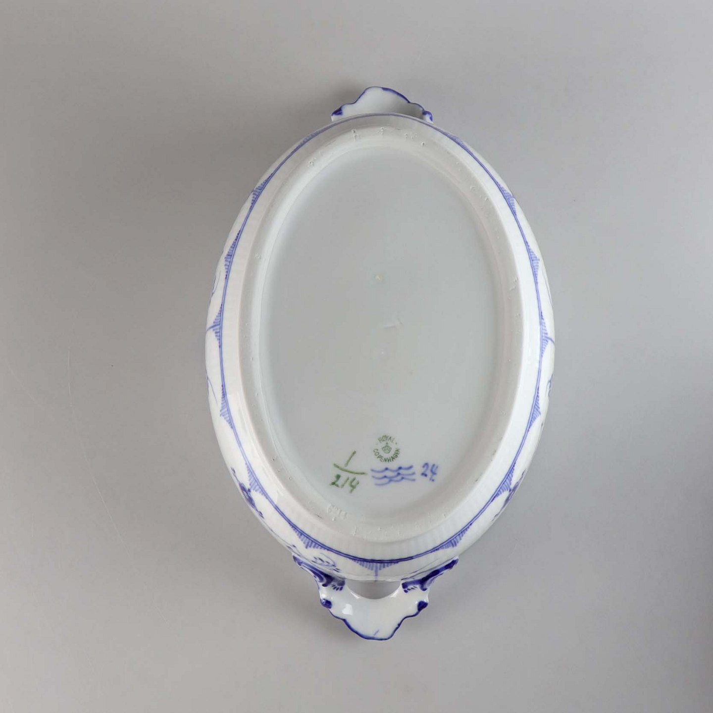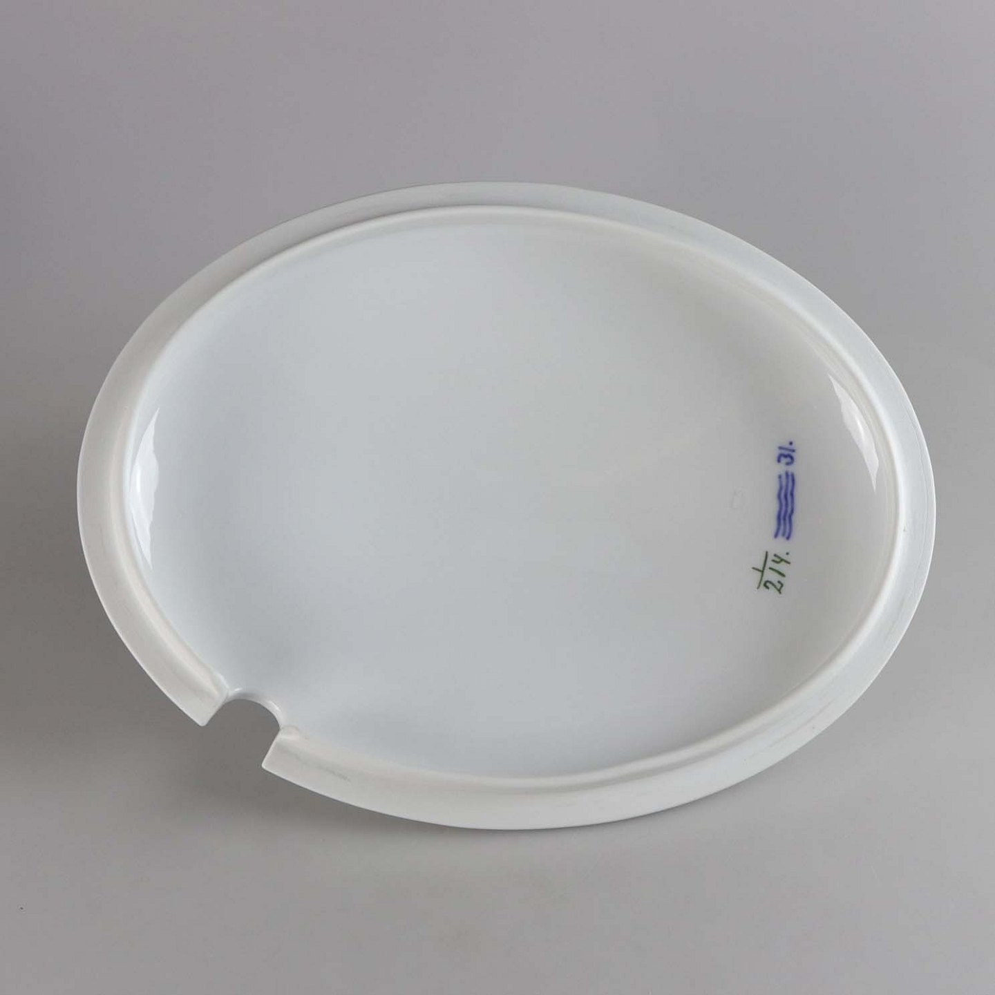 Suppeterrin i riflet hvidt porcelæn med dekoration af blå ranker