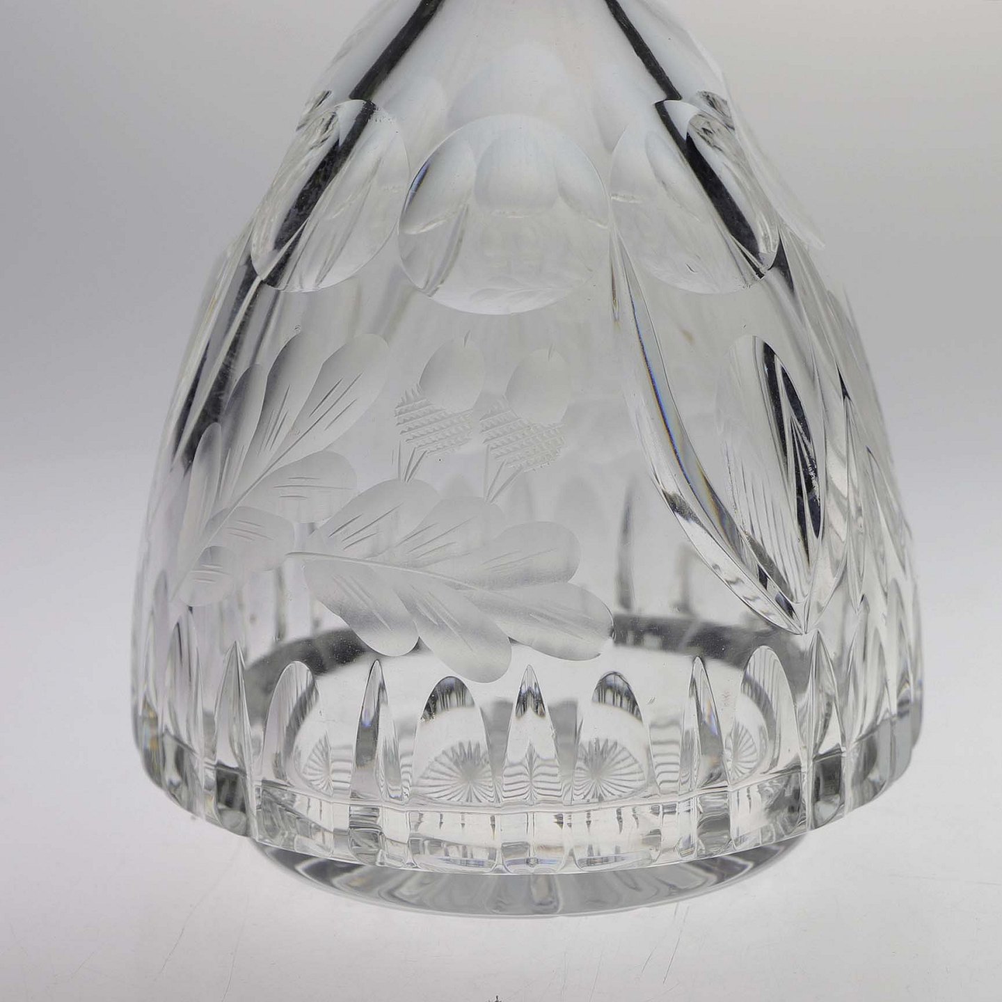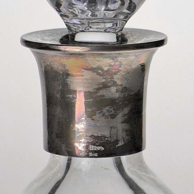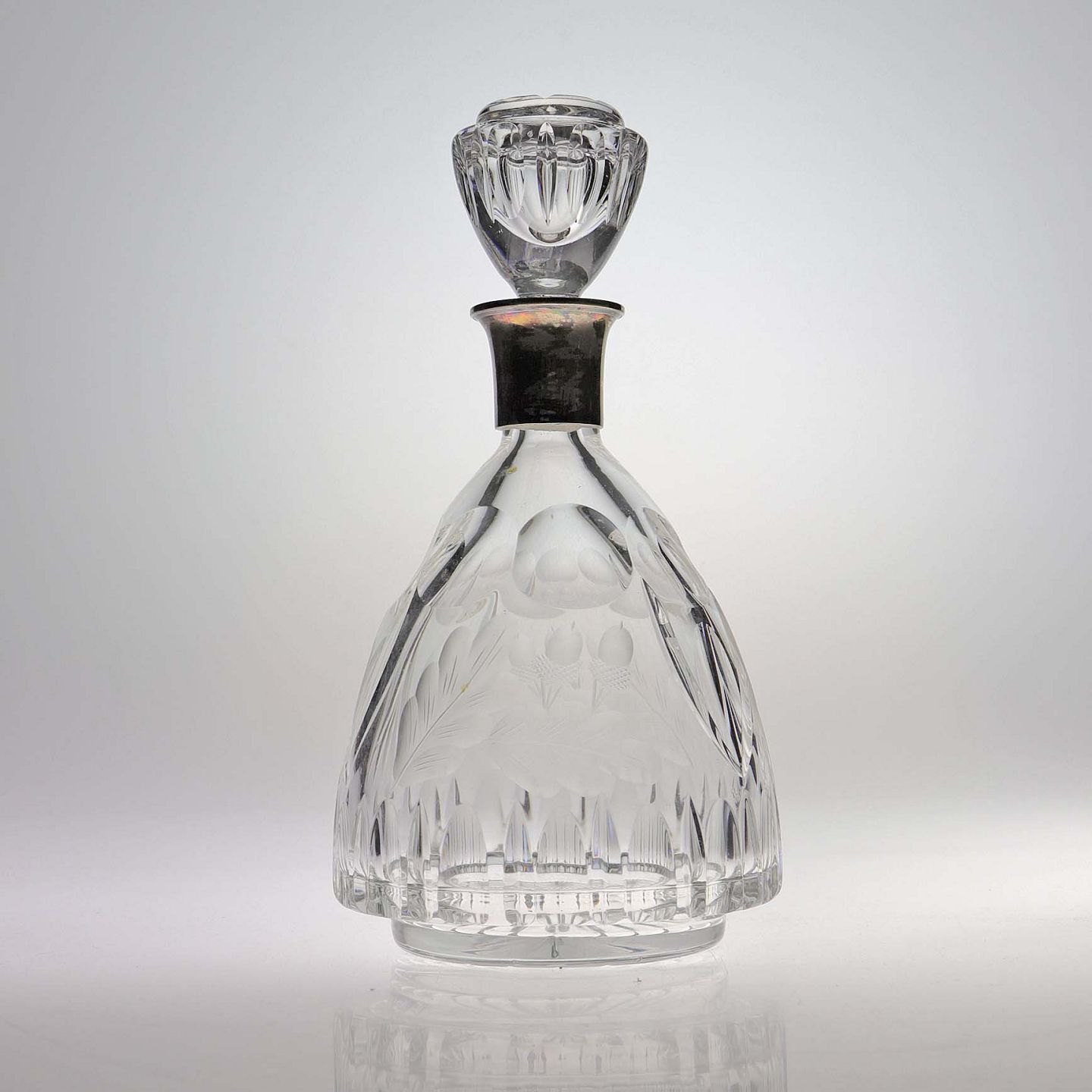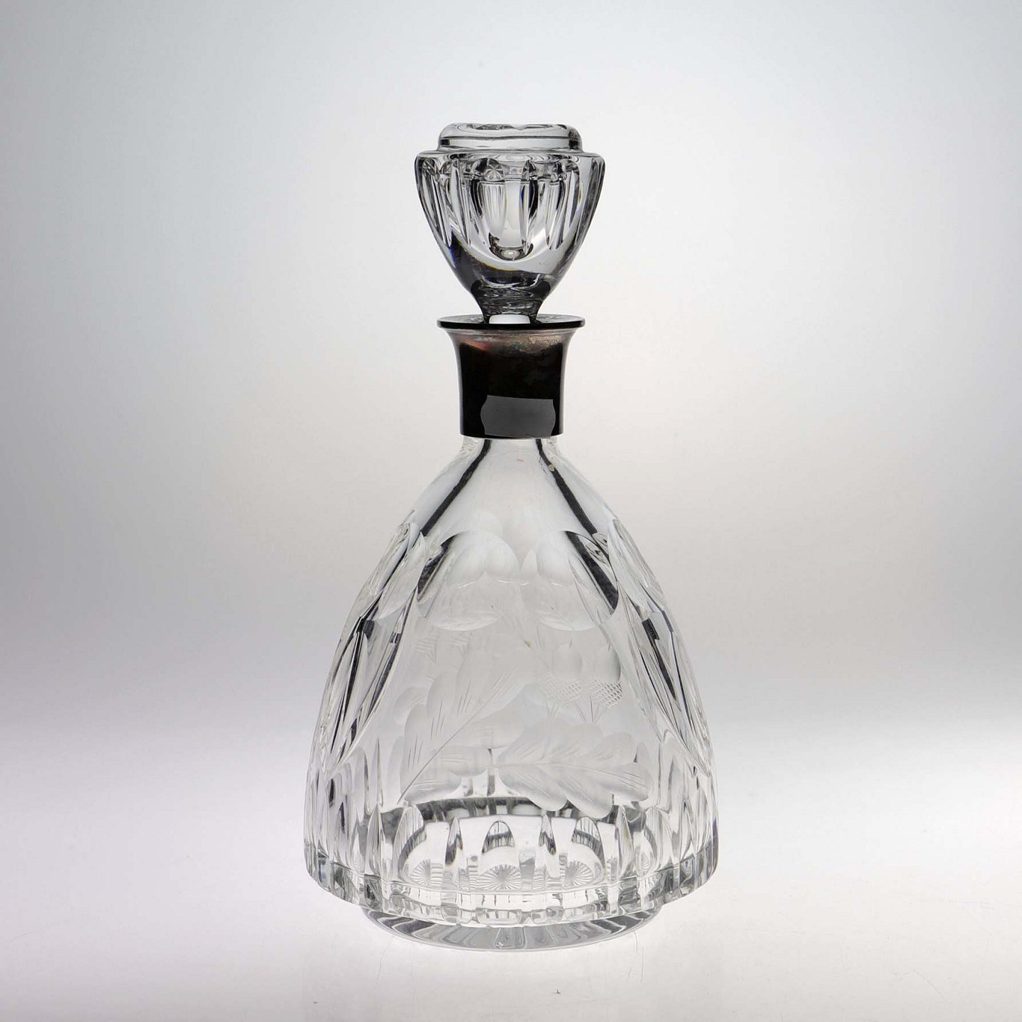 Karaffel i presset glas med motiv mad agern og blade samt top i sølv