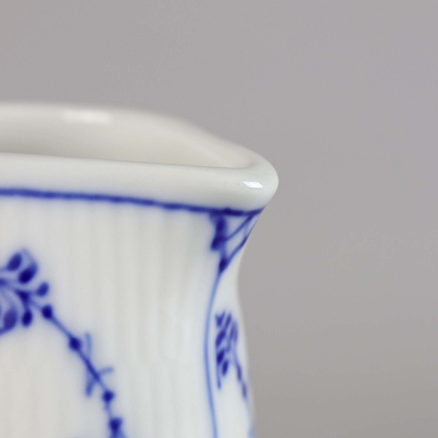 Riflet hvidt porcelæn med dekoration af blå ranke