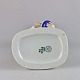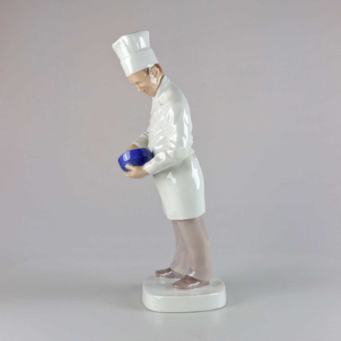 Figur i porcelæn af en kok med høj hue og en skål i hænderne