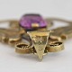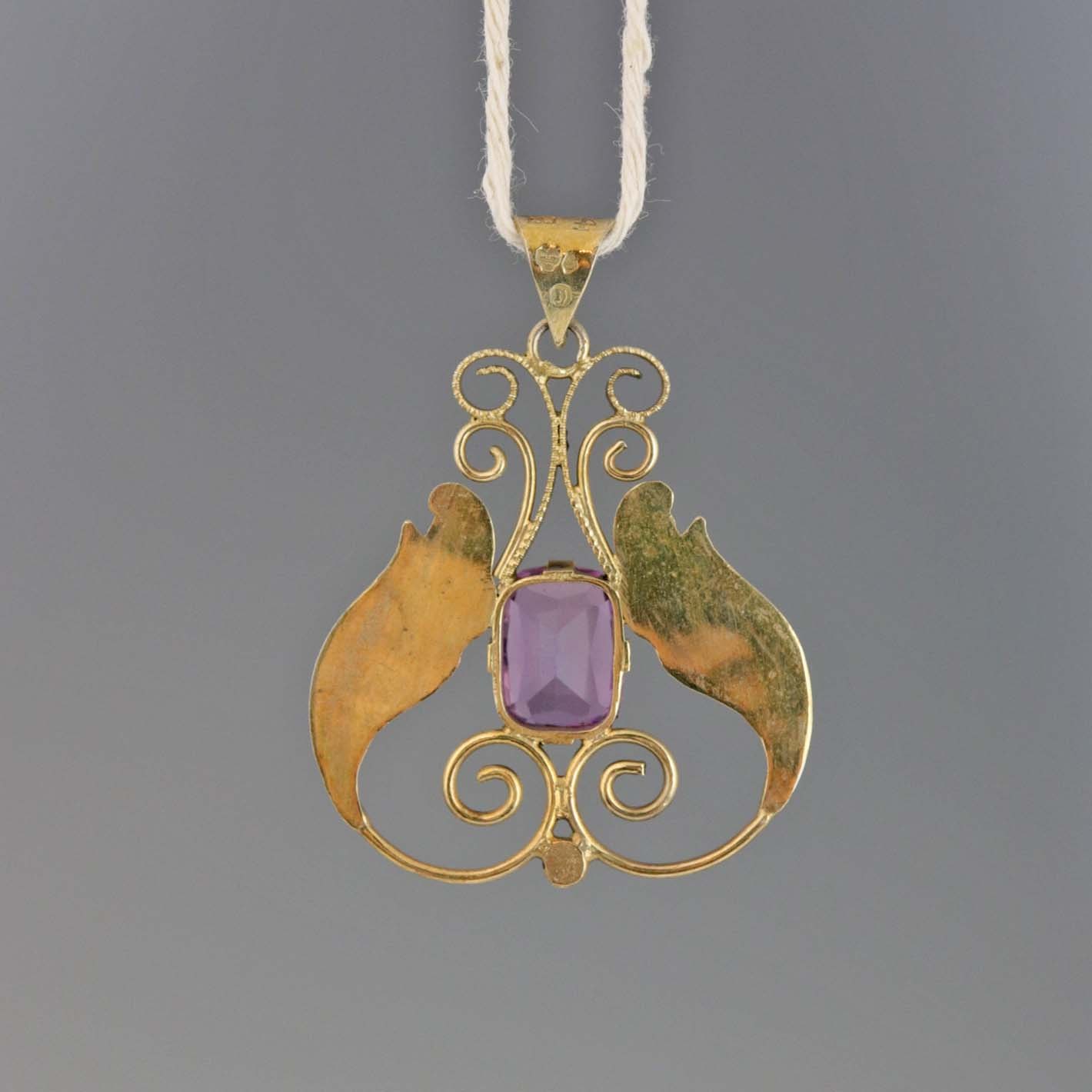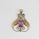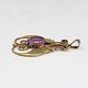 Vedhæng til halskæde i guldbelagtsølv med snirkler og en rektangulær ametyst i midten.