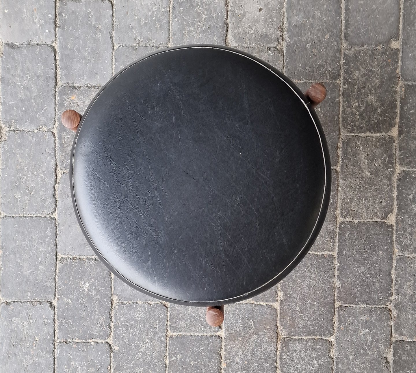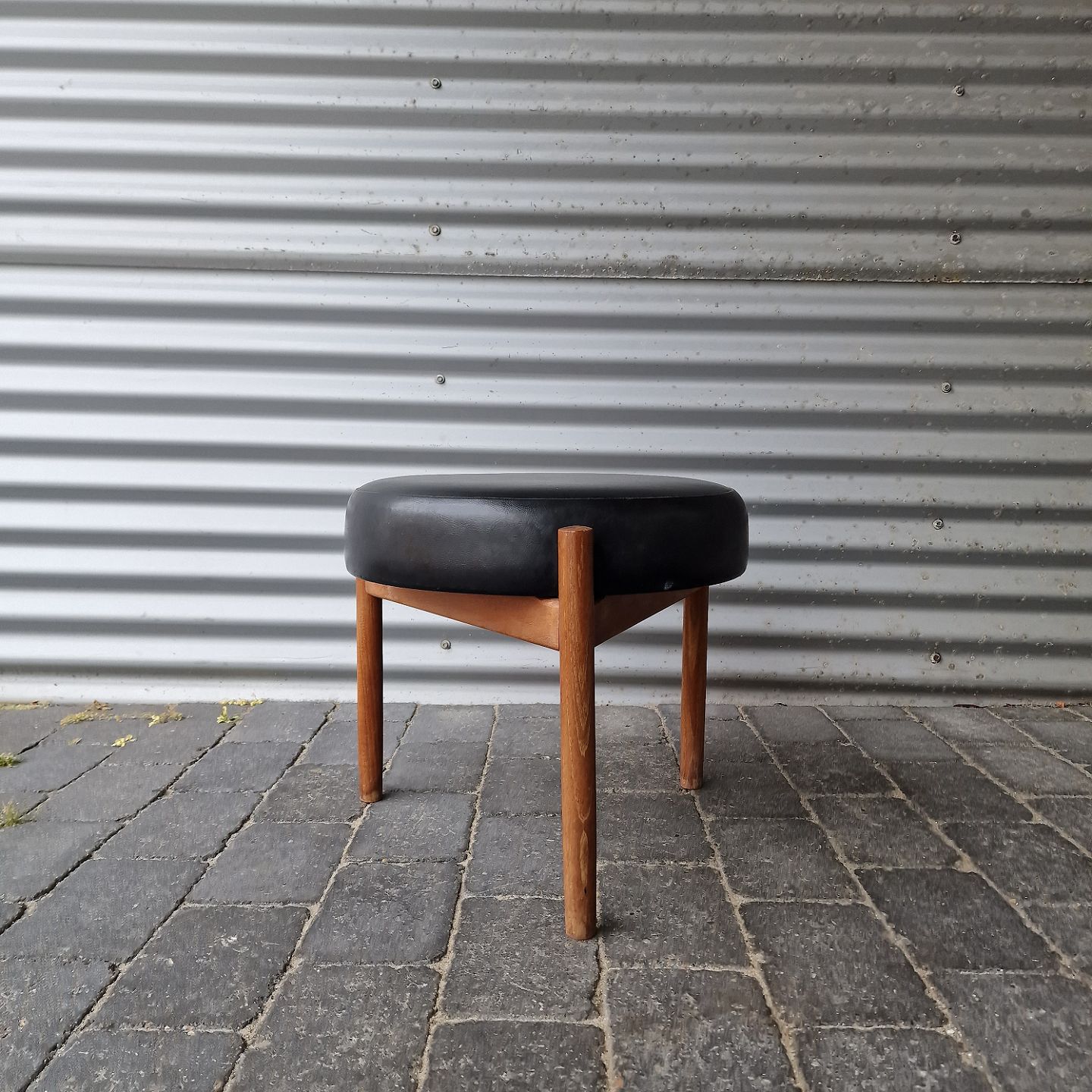 Skammel med rund imiteret lædersæde og med trebenet teaktræs stel. Mærket Danish Furnituremakers Control og Lovbeskyttet.