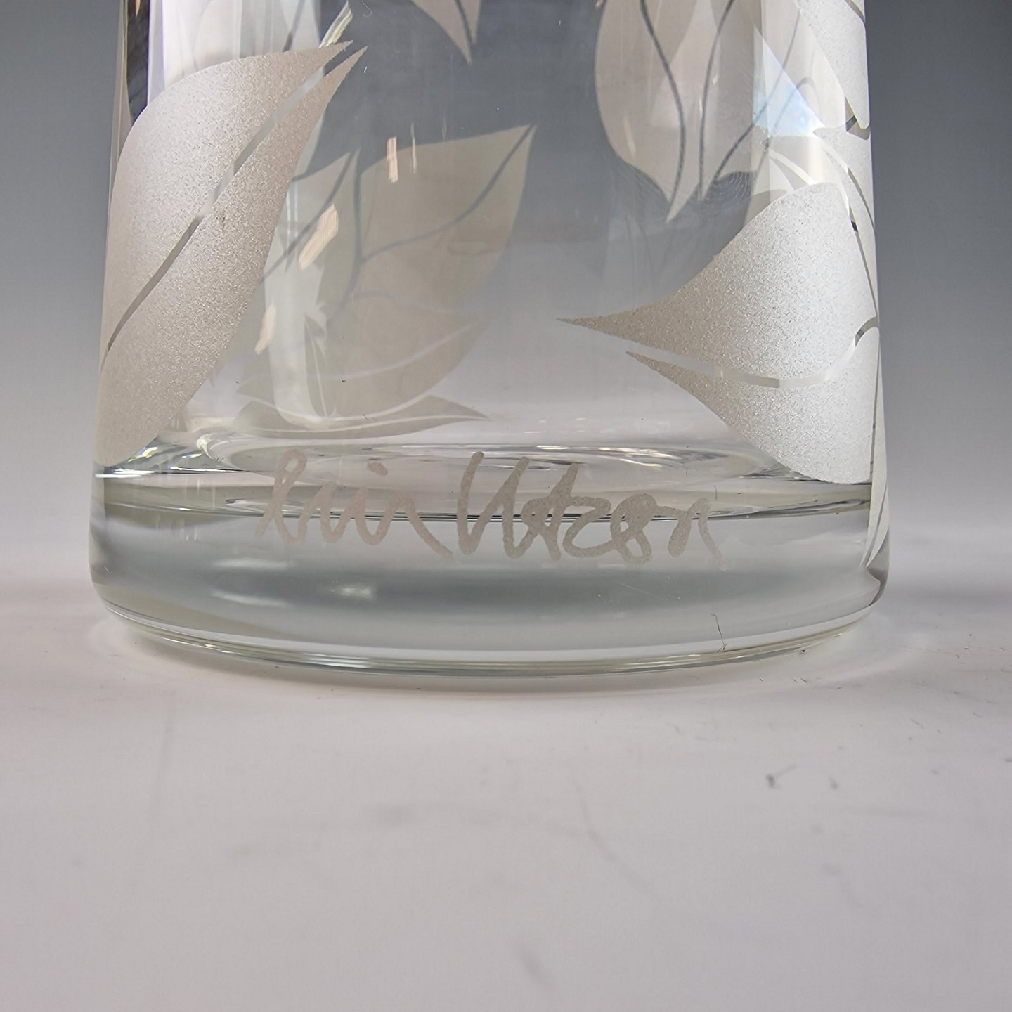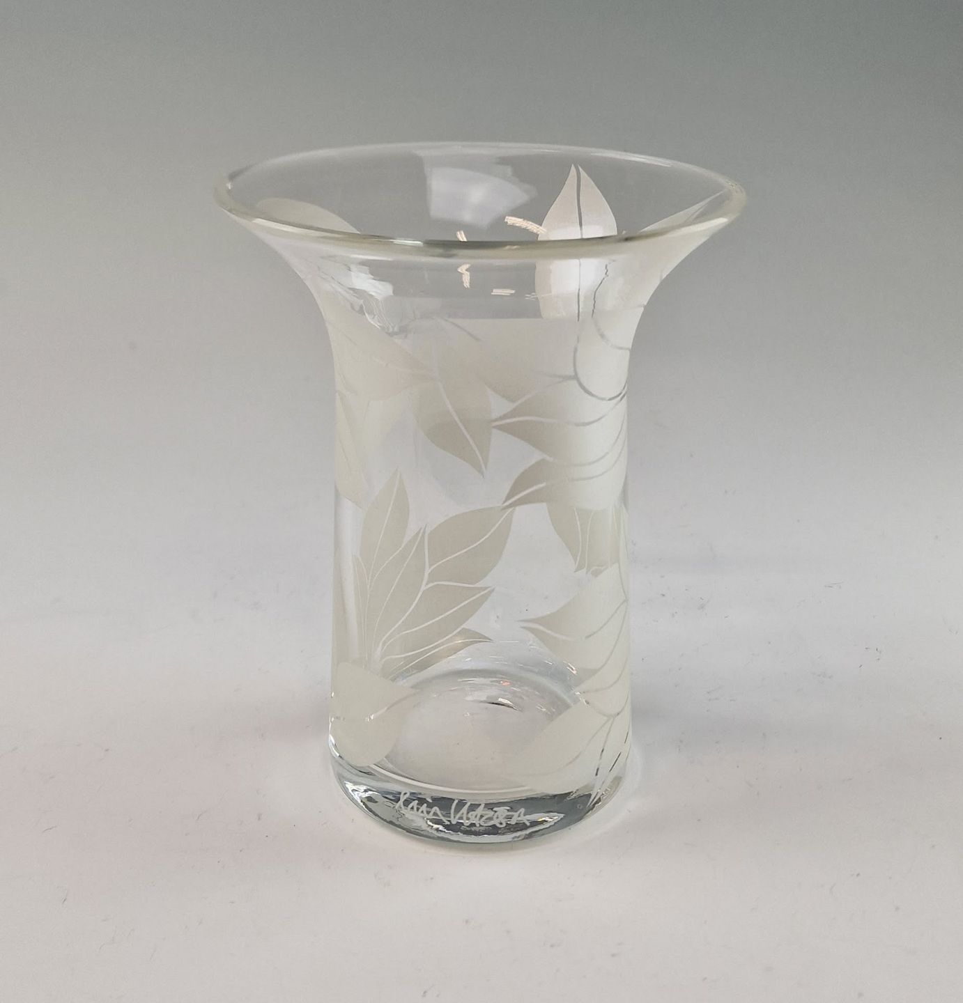 Filigran vase i klart glas med motiver i platin silketryk af hvide blade. Vasen er fremstillet i 10 eksemplar.