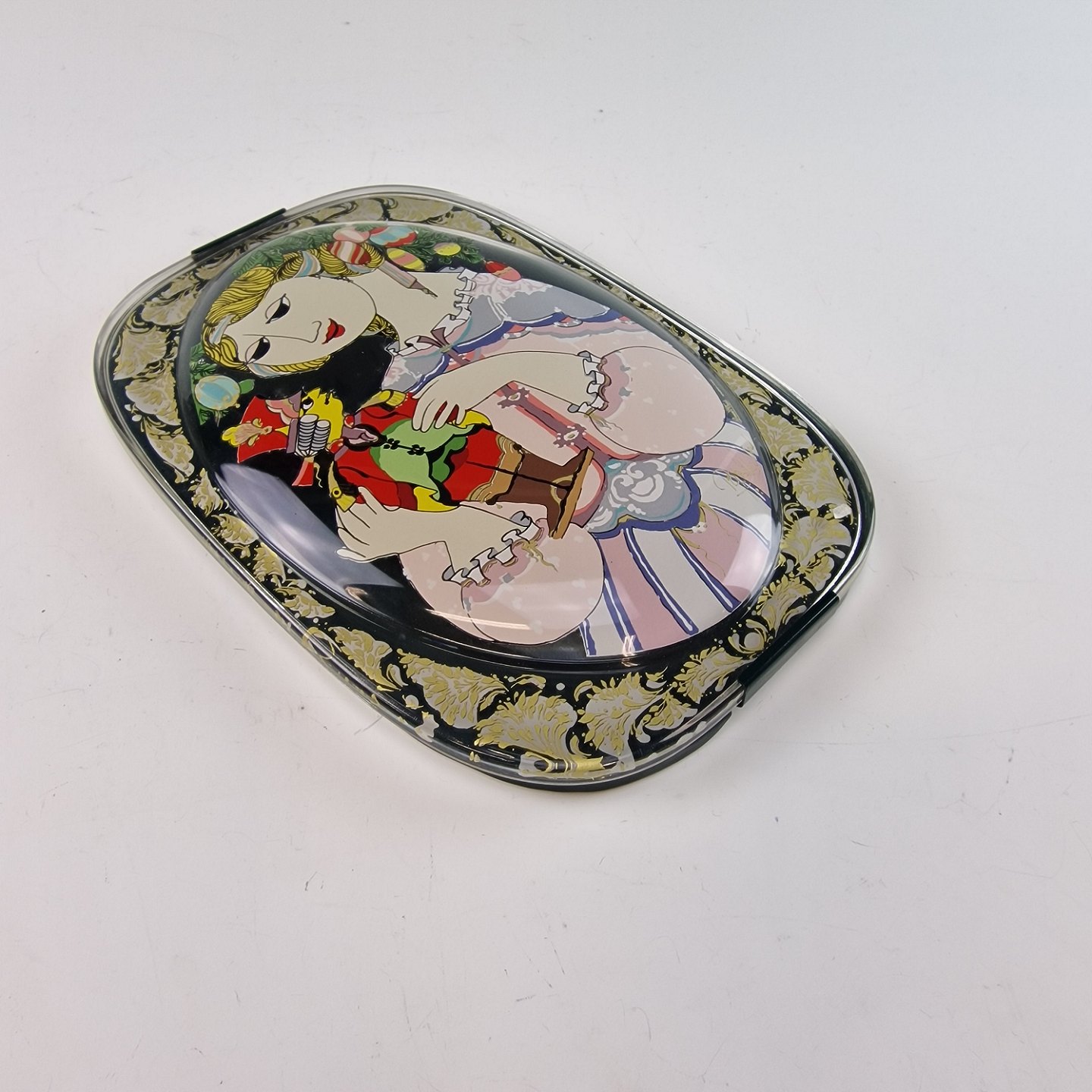 Sjælden glasplatte-serie lagt i farver under beskyttende metalbaggrund. Forestiller eventyret "Nøddeknækkeren" hvor Clara sidder med nøddeknækkeren